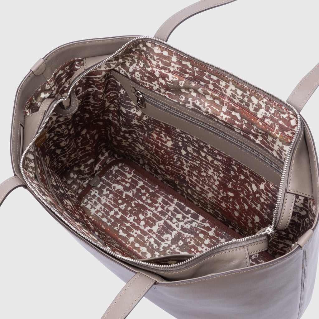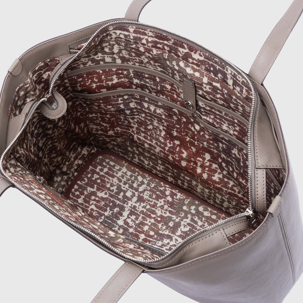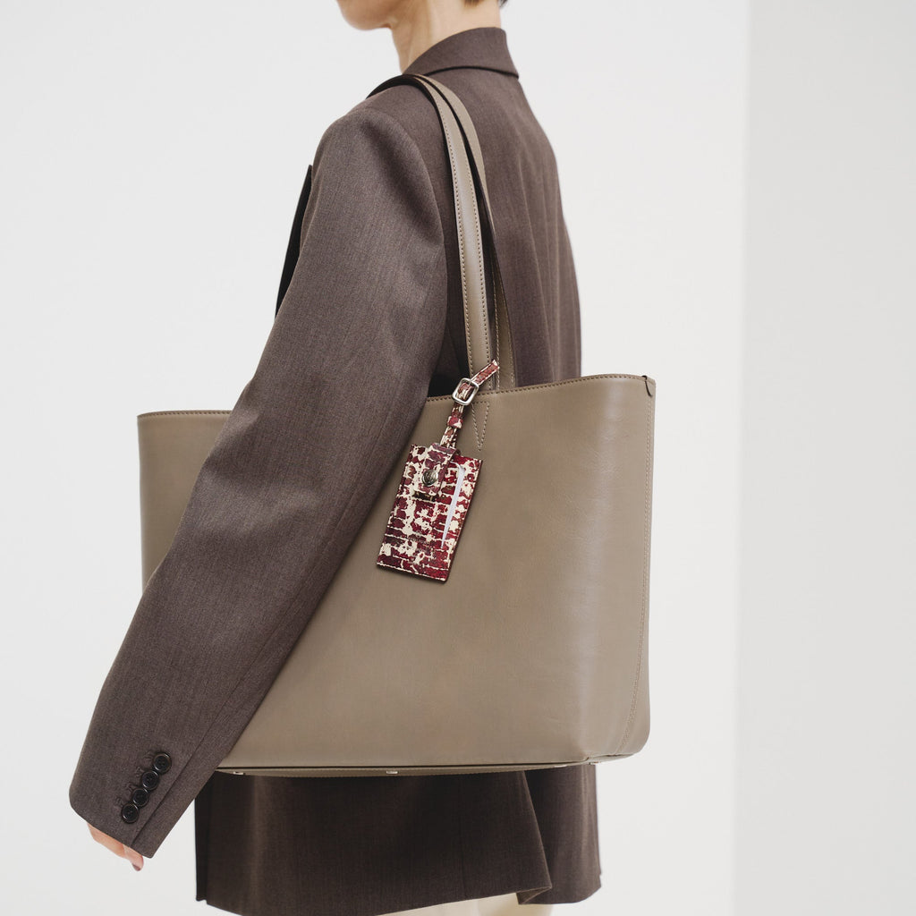 ロゴだけをあしらったミニマルなレザートートは、裏地にアートを起用することでオンオフ問わず馴染むスタイルに。開くたびにエネルギーあふれる異彩のアートが広がります。PCや書類もしっかり入るワイドサイズで、出張や休日の旅行にも対応する収納力もポイントです。