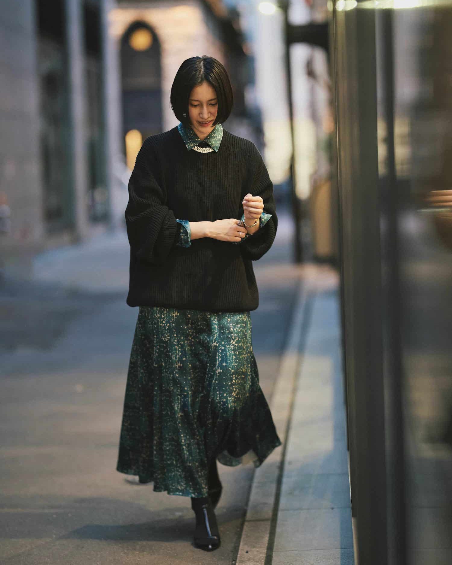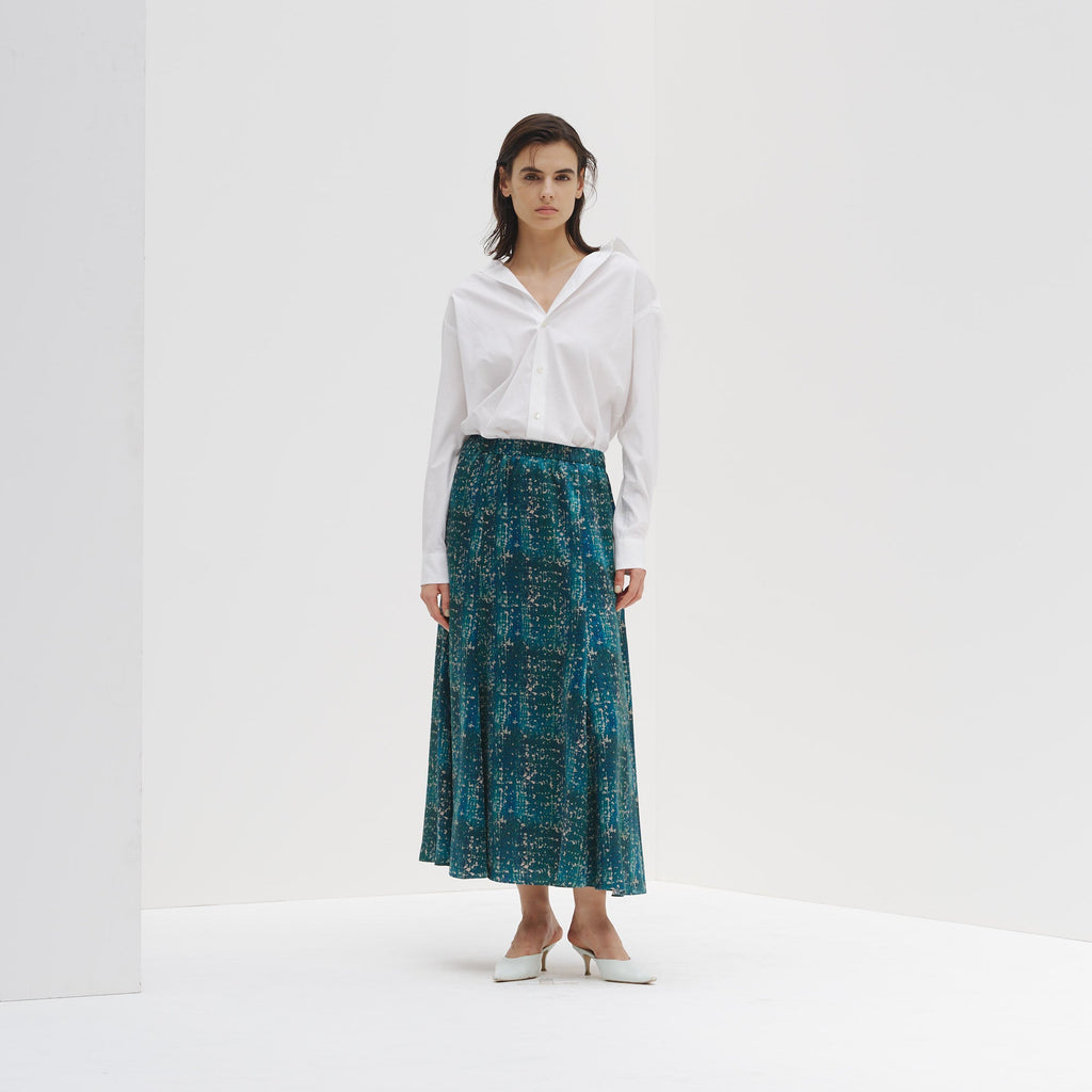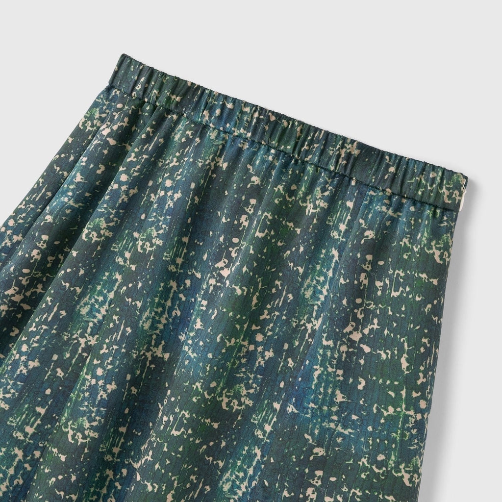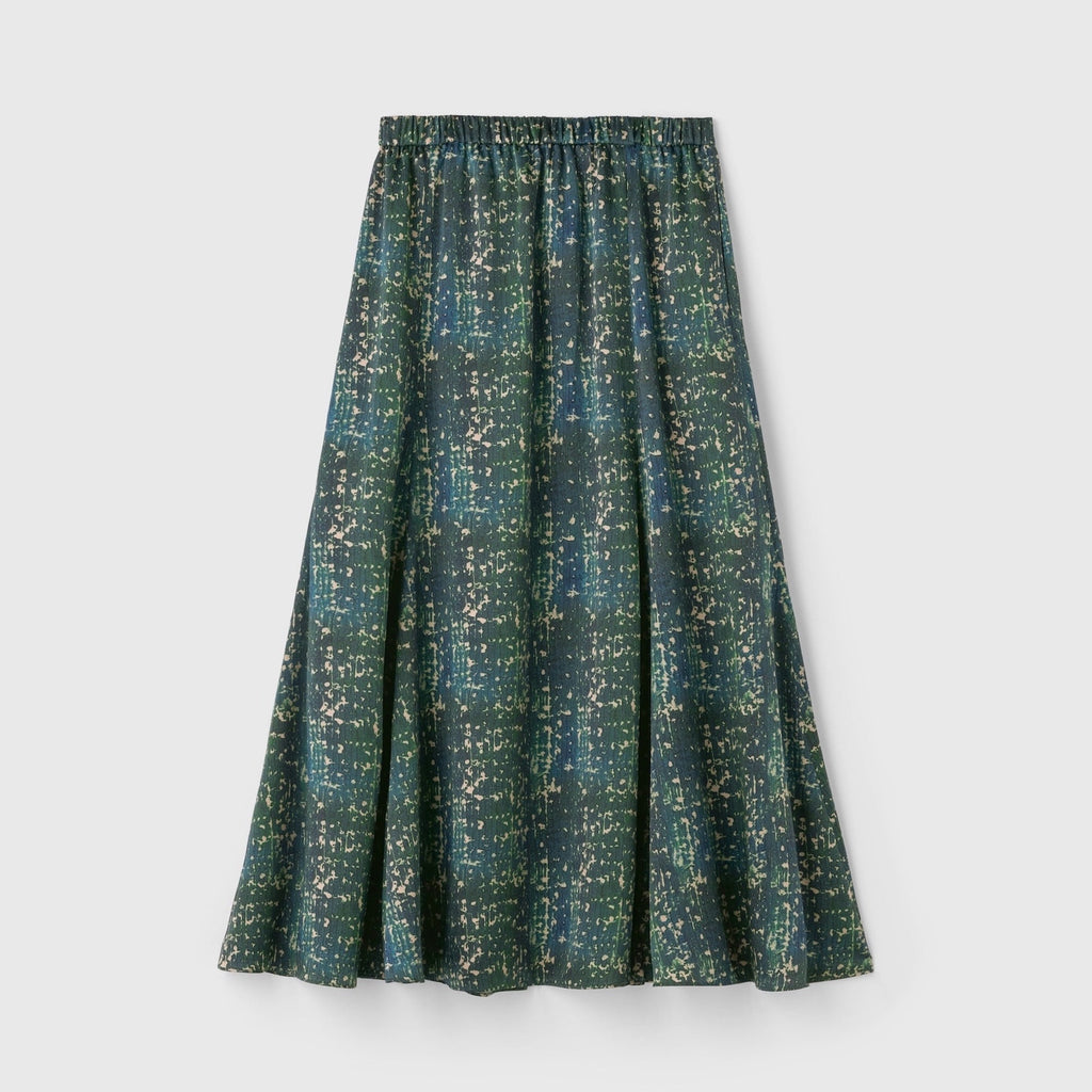 落ち着いたカラーリングのアートは、ジャケットやジレとも相性抜群。ビジネスシーンにも調和する、大人のスタイリングに合わせやすいスカートです。