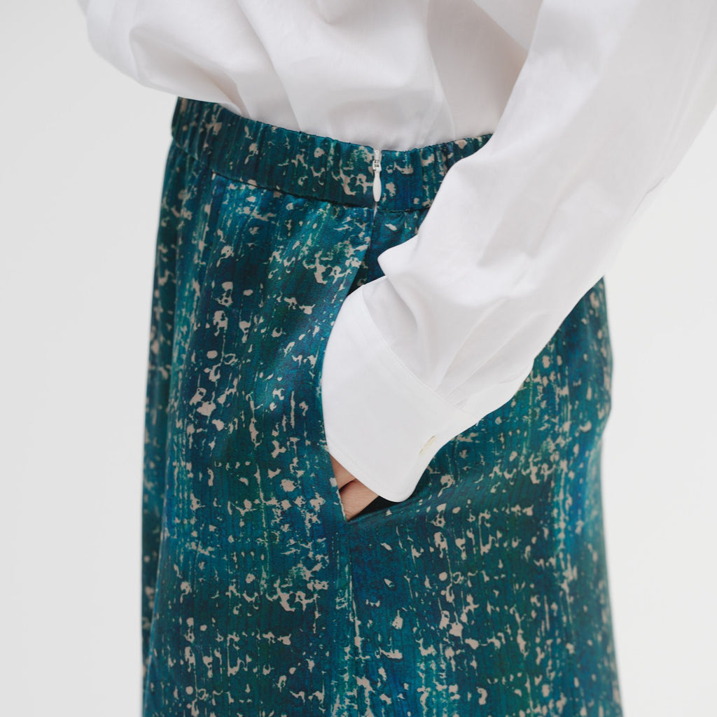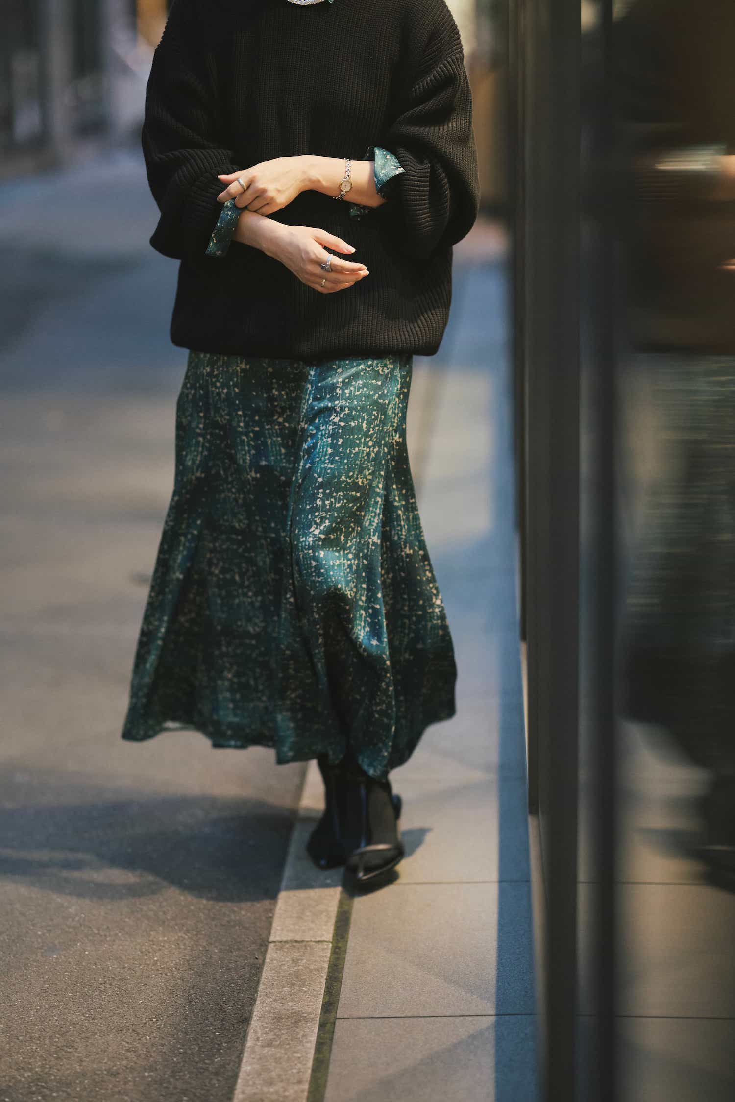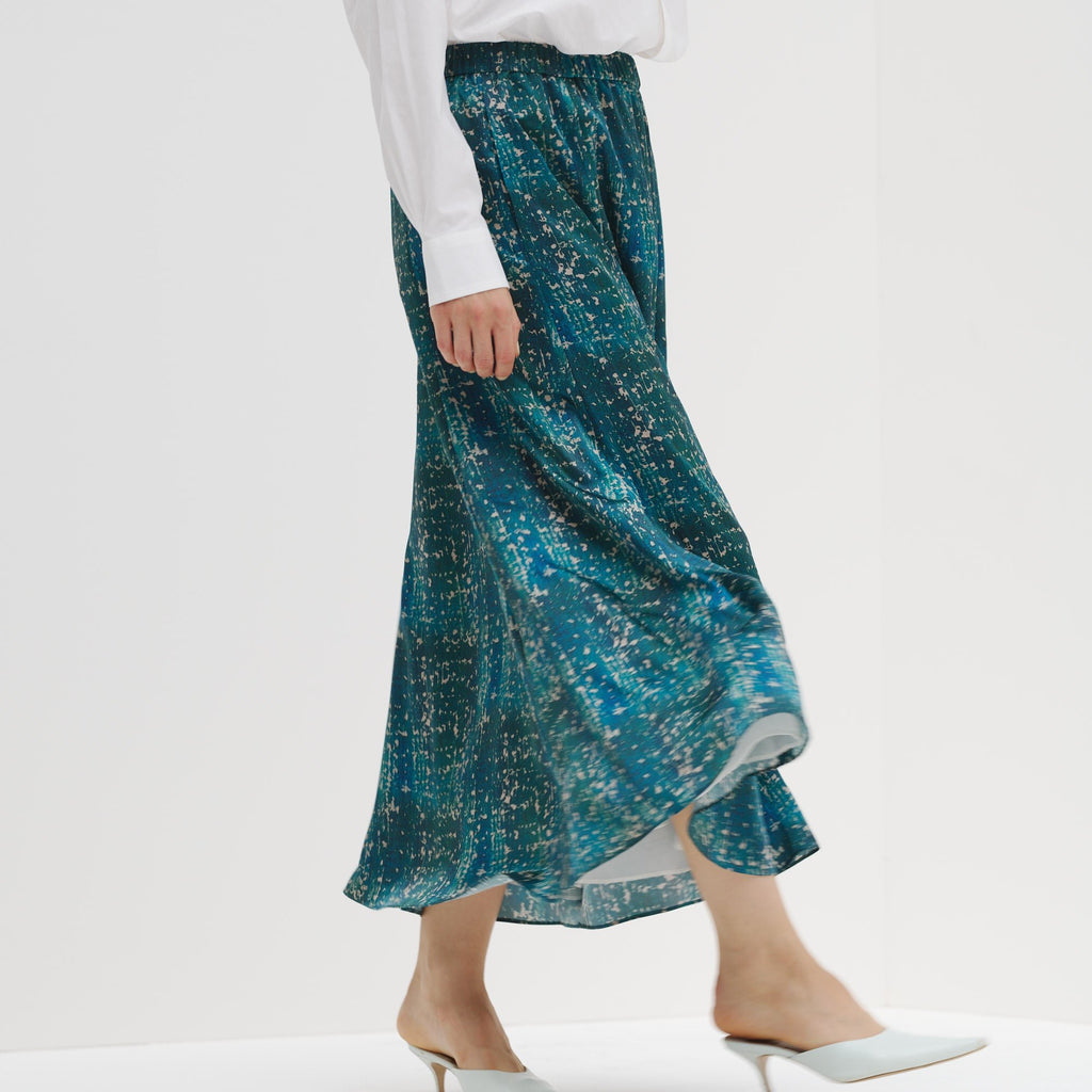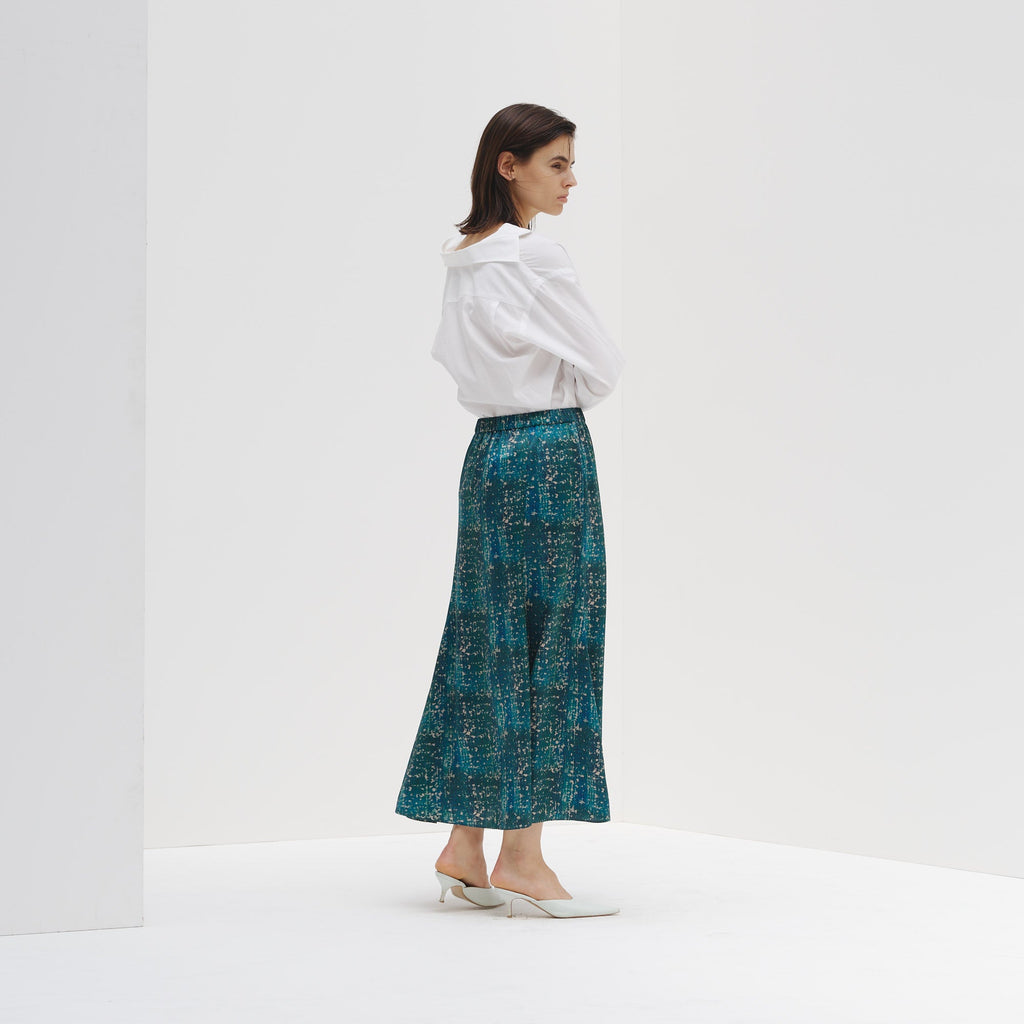 とろみのあるサテン生地をたっぷりとまとった、一枚でスタイリングが決まる大人のアートスカート。シルクのような光沢が、歩くたびに美しいドレープを描き出します。高級感あふれる素材とシックな色彩のアートが、大切な日に自信を与えてくれるスカートです。