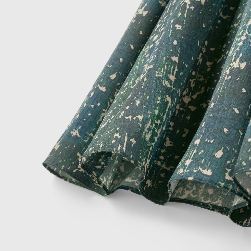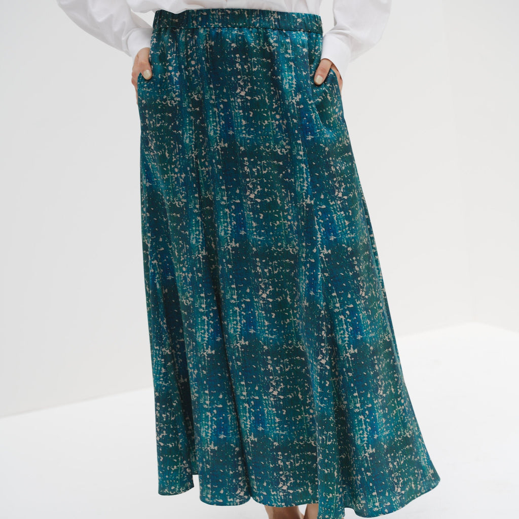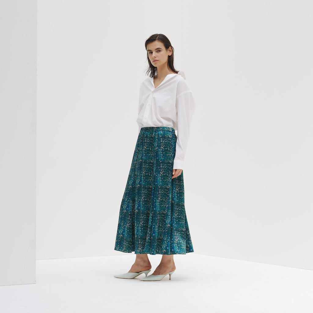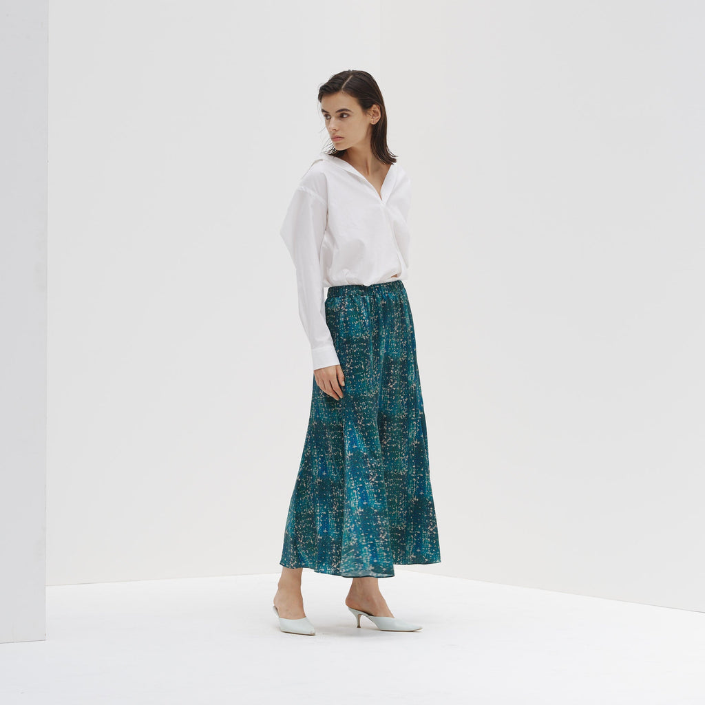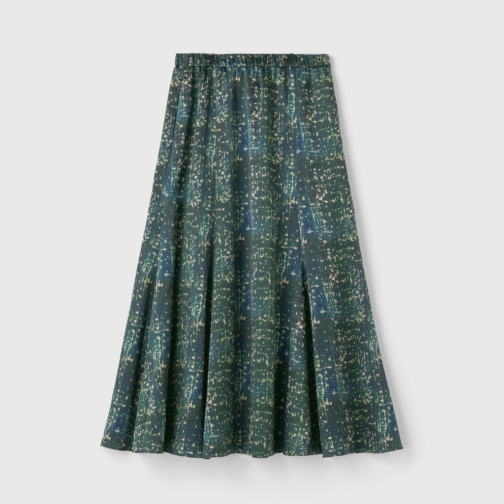 とろみのあるサテン生地をたっぷりとまとった、一枚でスタイリングが決まる大人のアートスカート。シルクのような光沢が、歩くたびに美しいドレープを描き出します。高級感あふれる素材とシックな色彩のアートが、大切な日に自信を与えてくれるスカートです。