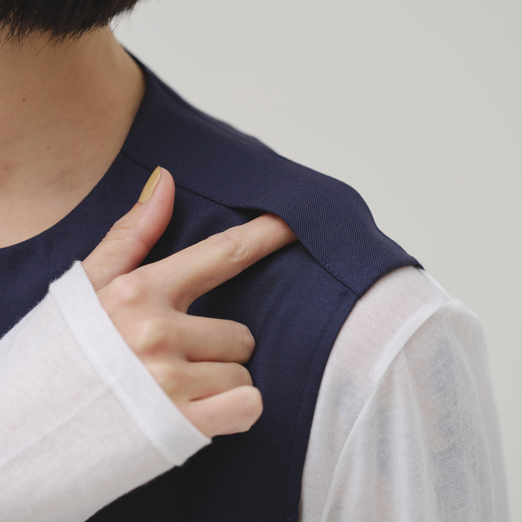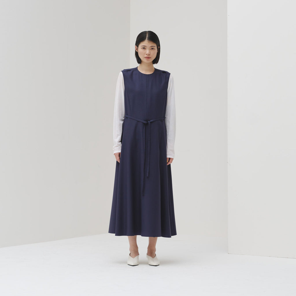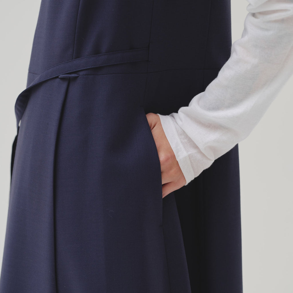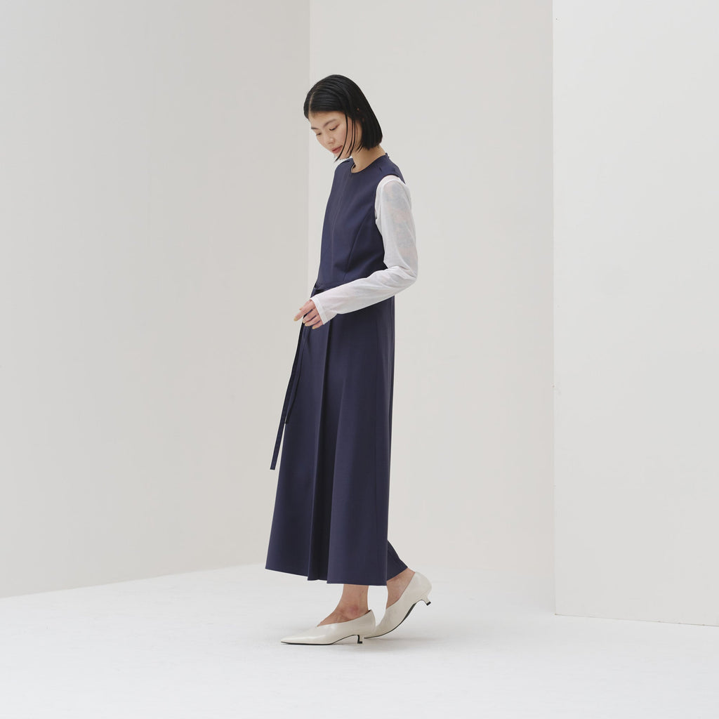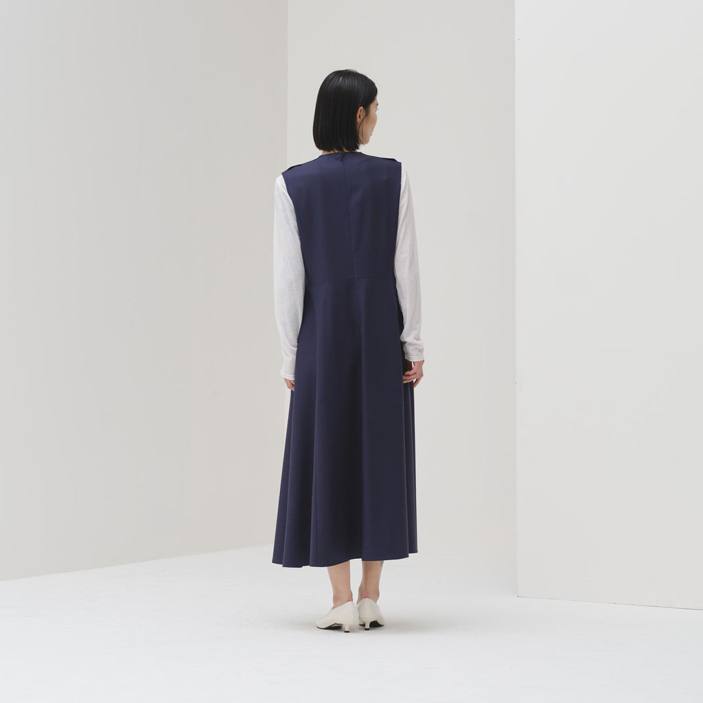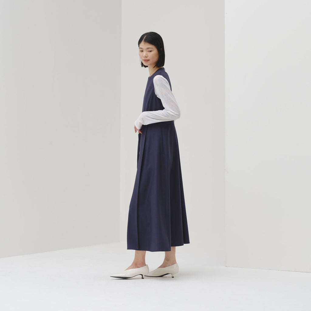 シンプルなAラインシルエットは、スカーフをつけずにまとっても美しいデザイン。カーディガンを羽織ってももたつかないノースリーブタイプですが、ウール混のしっかりとした生地なので冬物のジャケットともスタイリング可能です。
