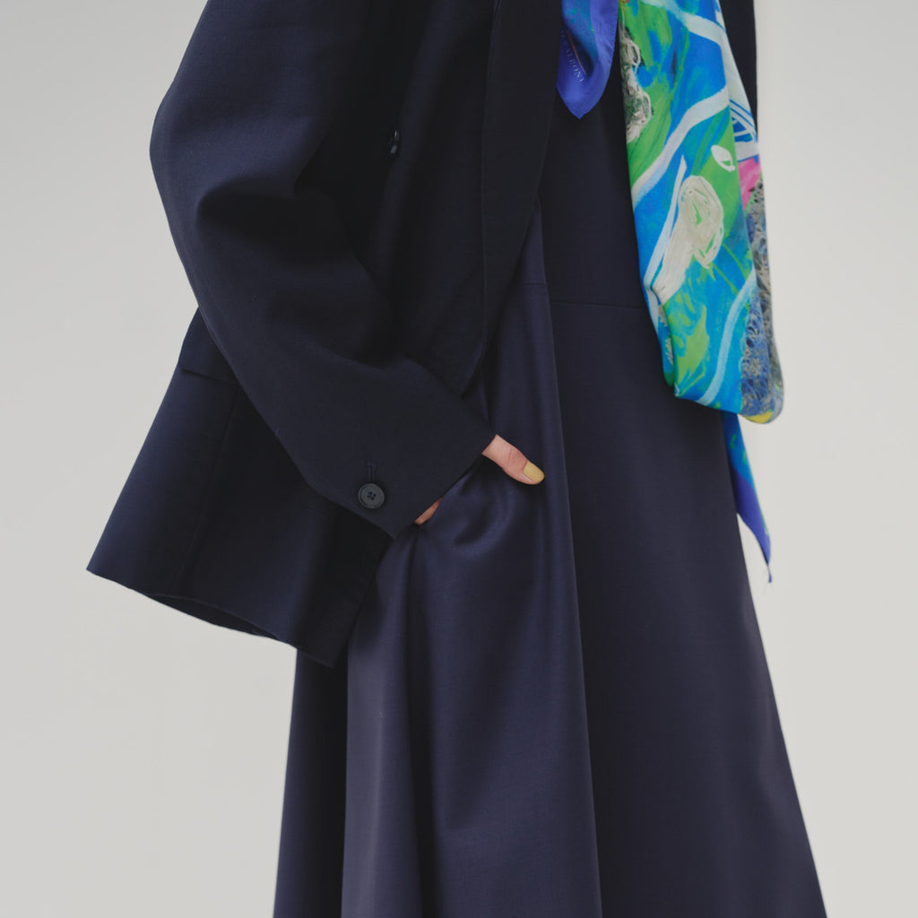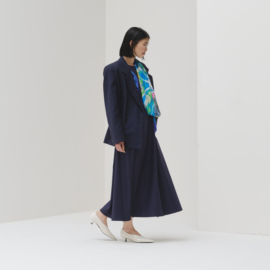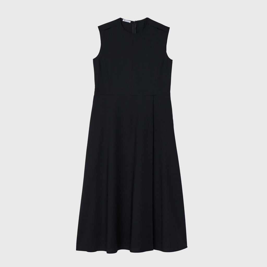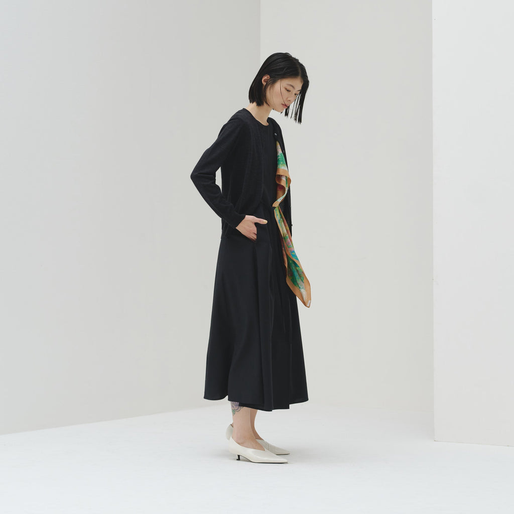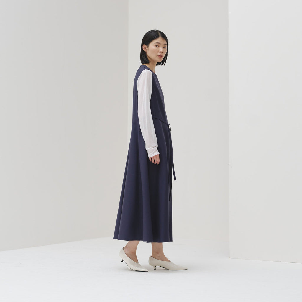 シンプルなAラインシルエットは、スカーフをつけずにまとっても美しいデザイン。カーディガンを羽織ってももたつかないノースリーブタイプですが、ウール混のしっかりとした生地なので冬物のジャケットともスタイリング可能です。