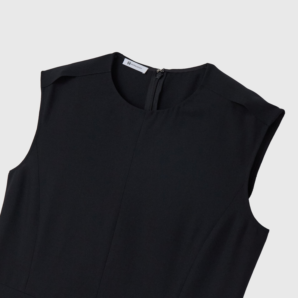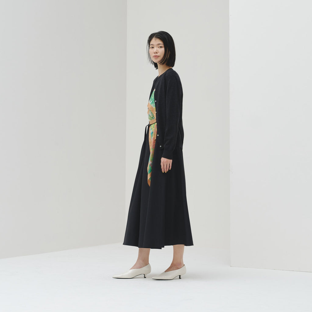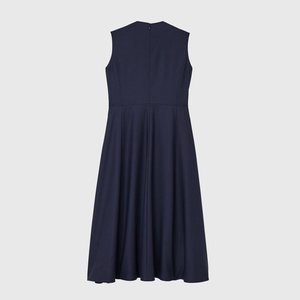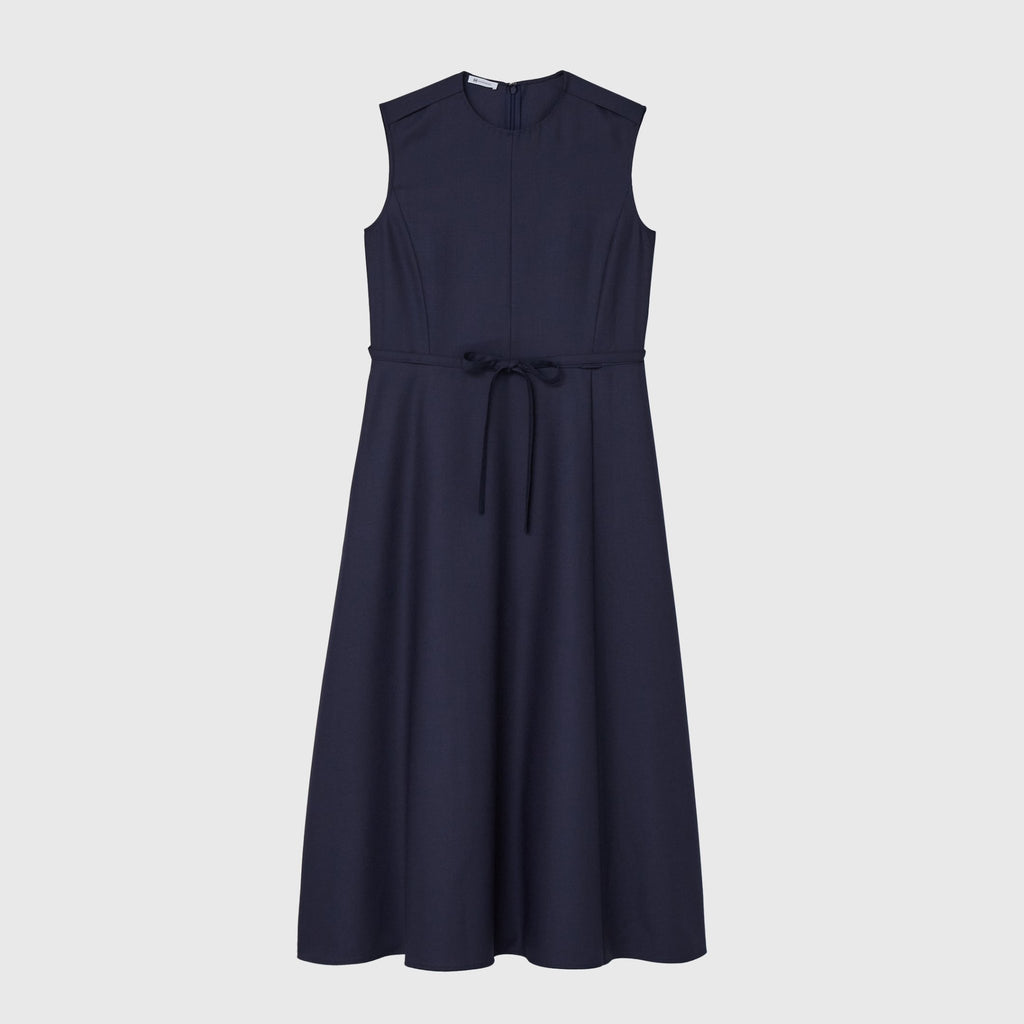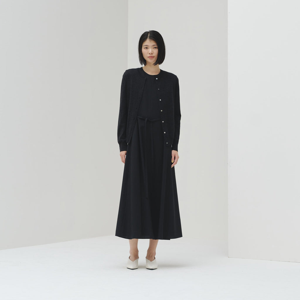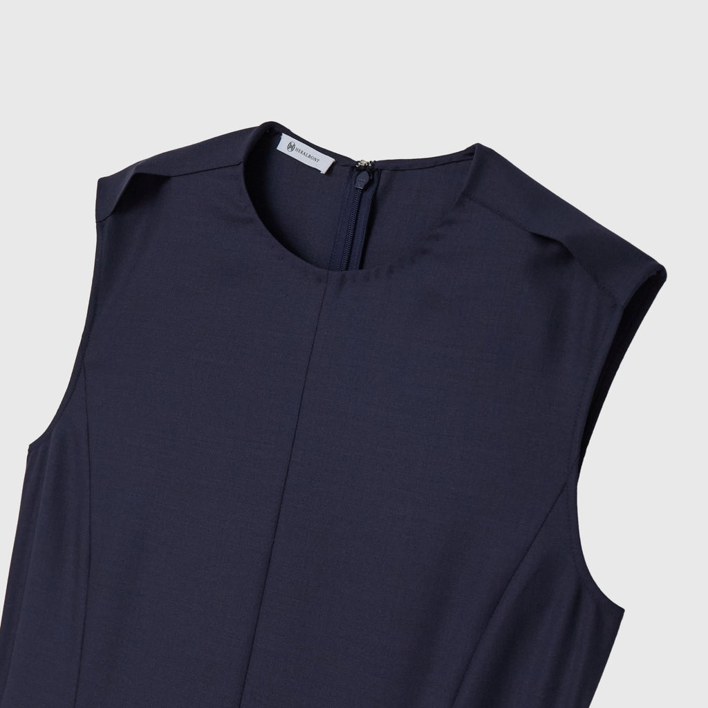 シンプルなAラインシルエットは、スカーフをつけずにまとっても美しいデザイン。カーディガンを羽織ってももたつかないノースリーブタイプですが、ウール混のしっかりとした生地なので冬物のジャケットともスタイリング可能です。