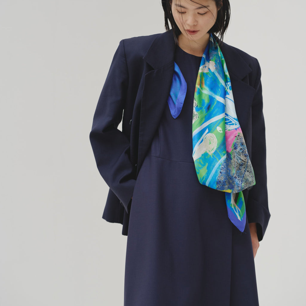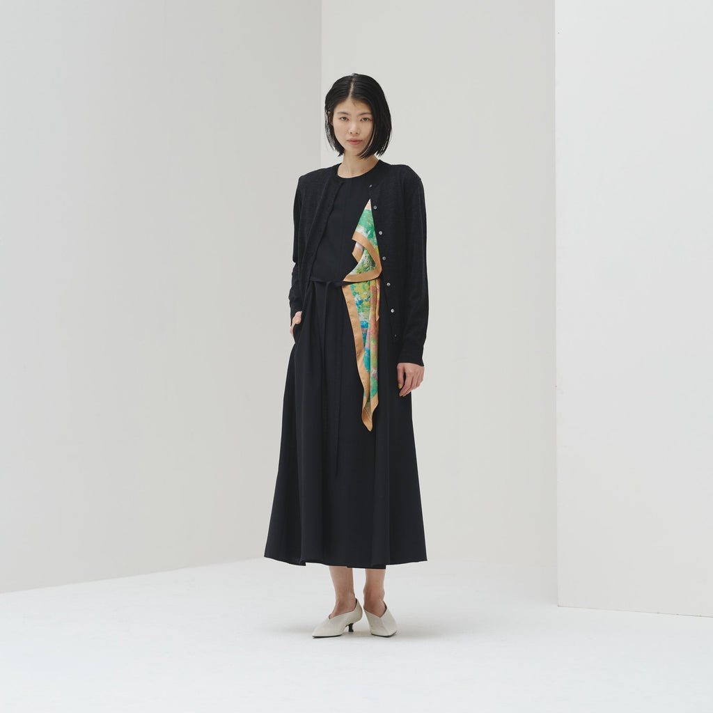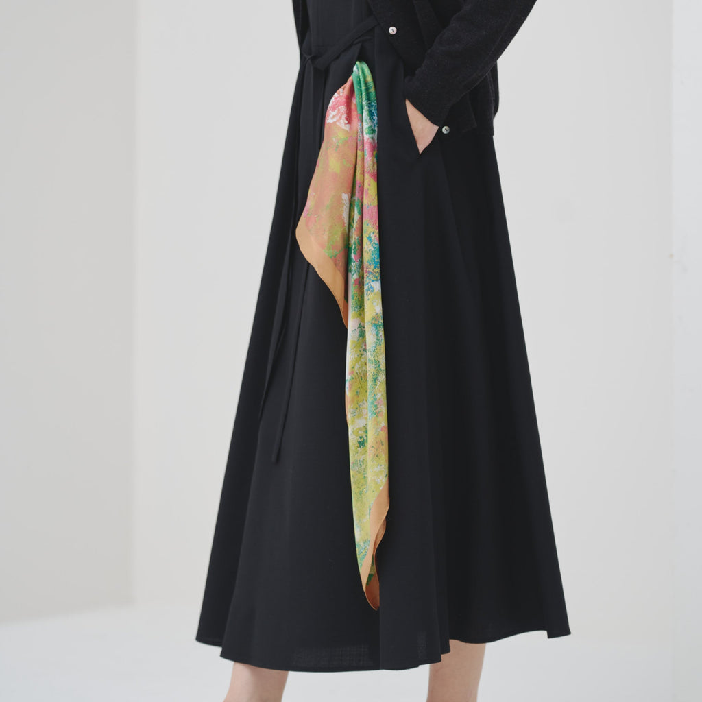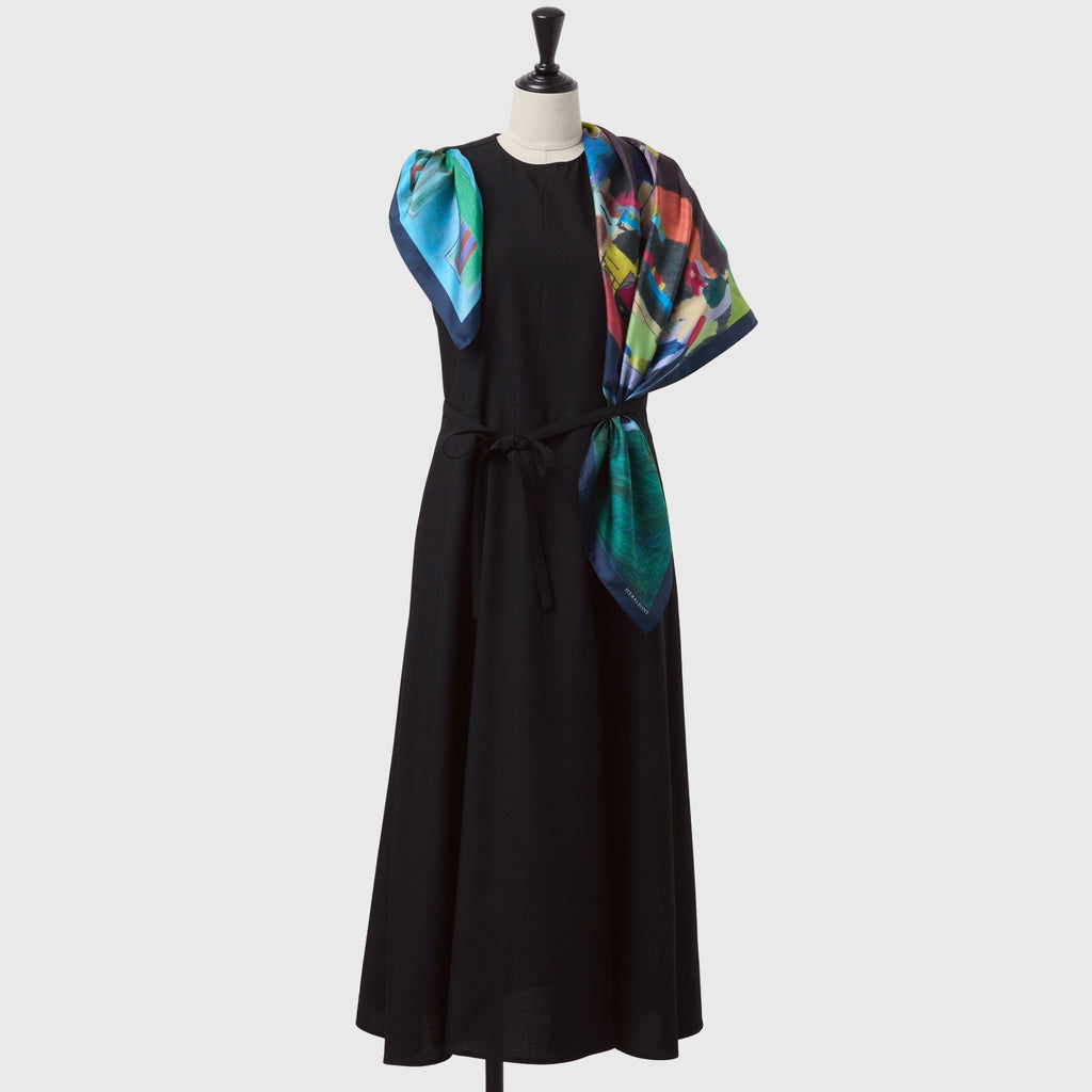 肩やウエストに付属のループにHERALBONYのシルクスカーフを通すことで、洗練されたオケージョンスタイルが完成。まとうアートの色彩やタッチによって、華やかにもシックにも変化します。