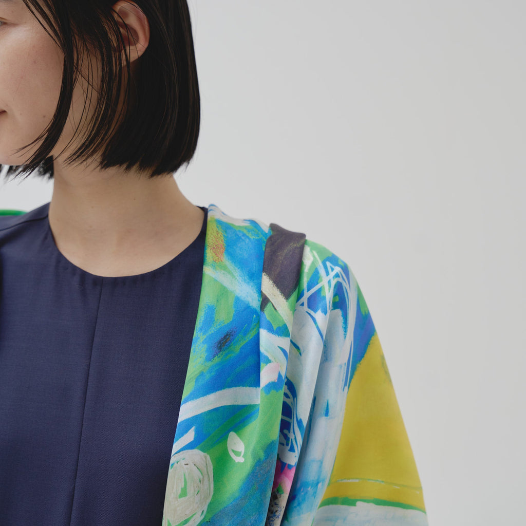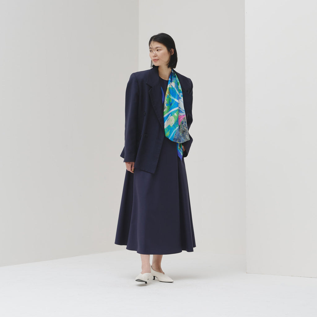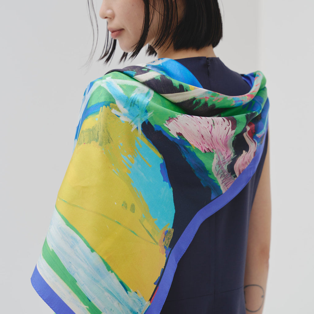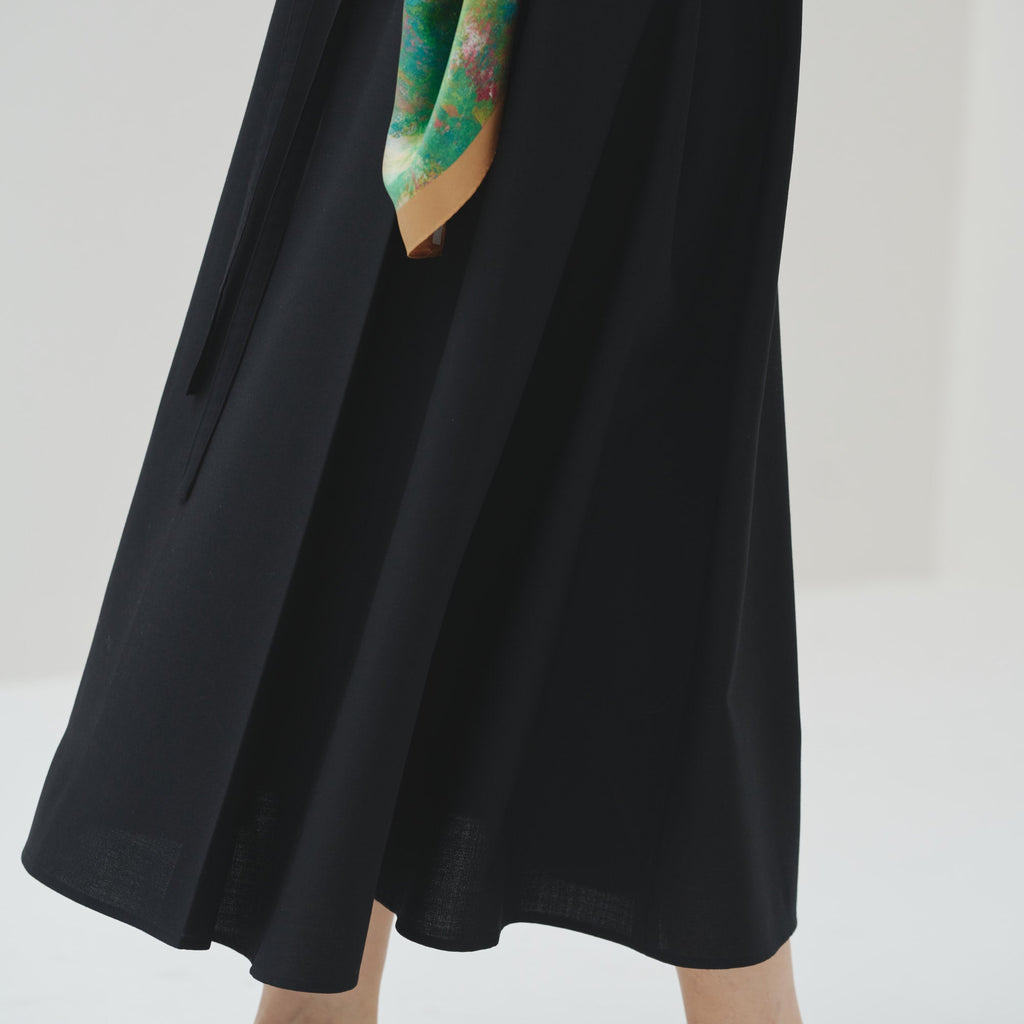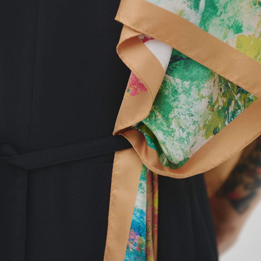 肩やウエストに付属のループにHERALBONYのシルクスカーフを通すことで、洗練されたオケージョンスタイルが完成。まとうアートの色彩やタッチによって、華やかにもシックにも変化します。