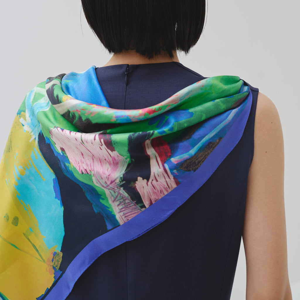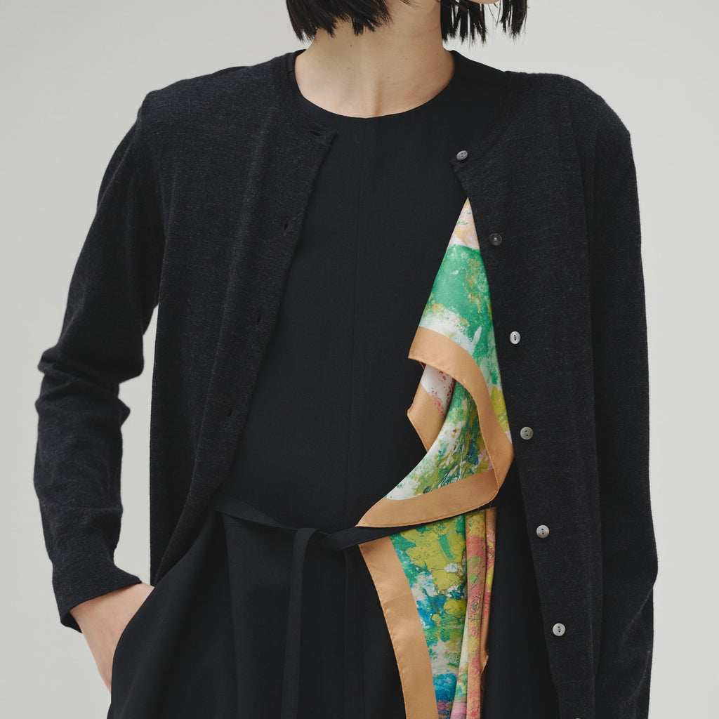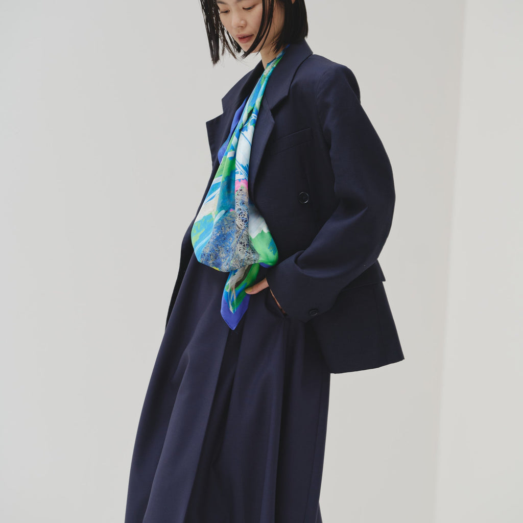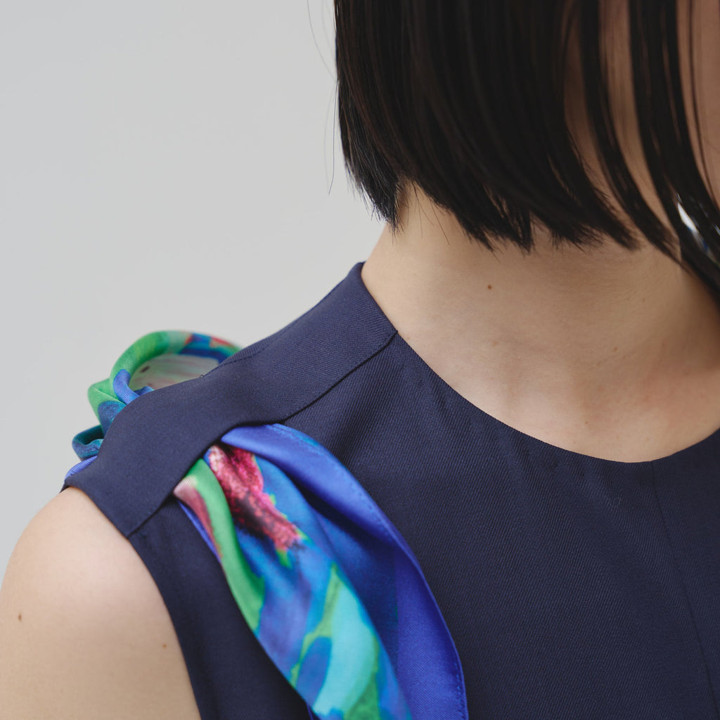 肩やウエストに付属のループにHERALBONYのシルクスカーフを通すことで、洗練されたオケージョンスタイルが完成。まとうアートの色彩やタッチによって、華やかにもシックにも変化します。