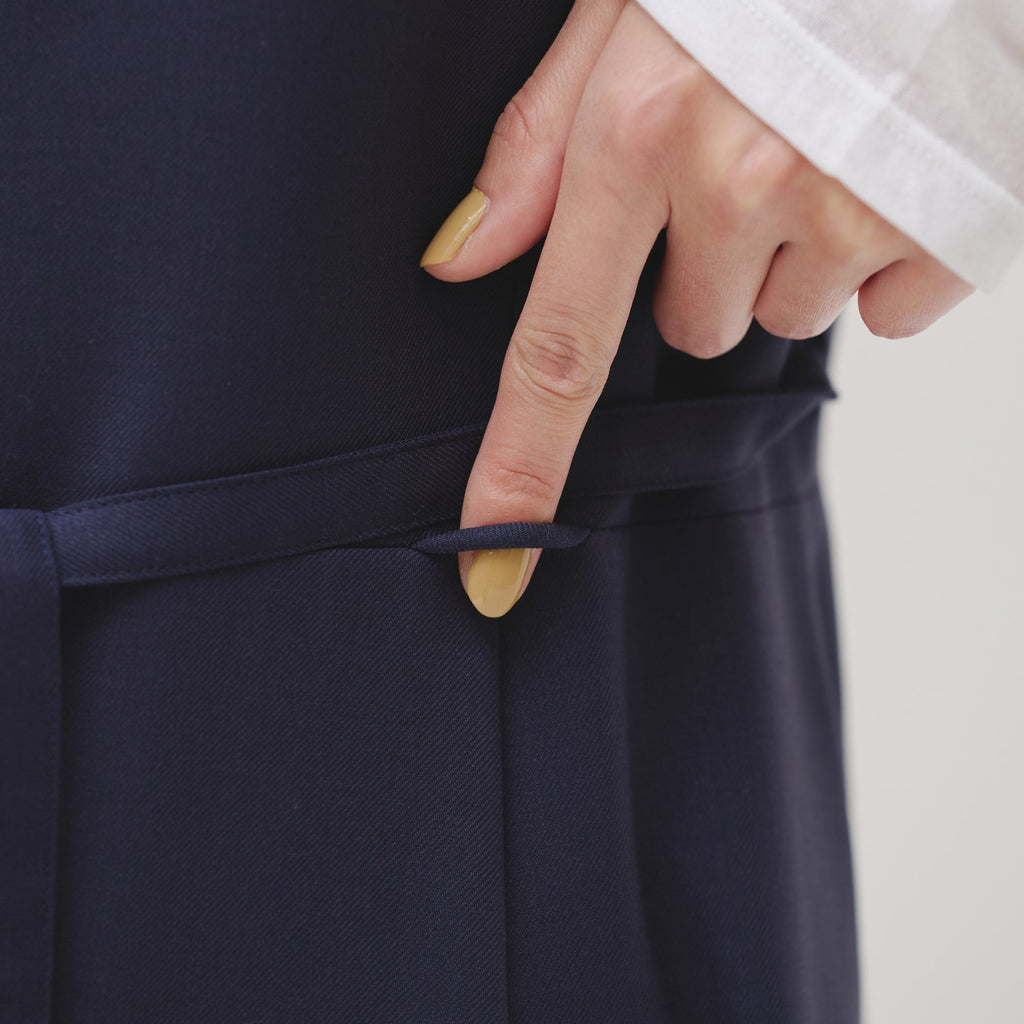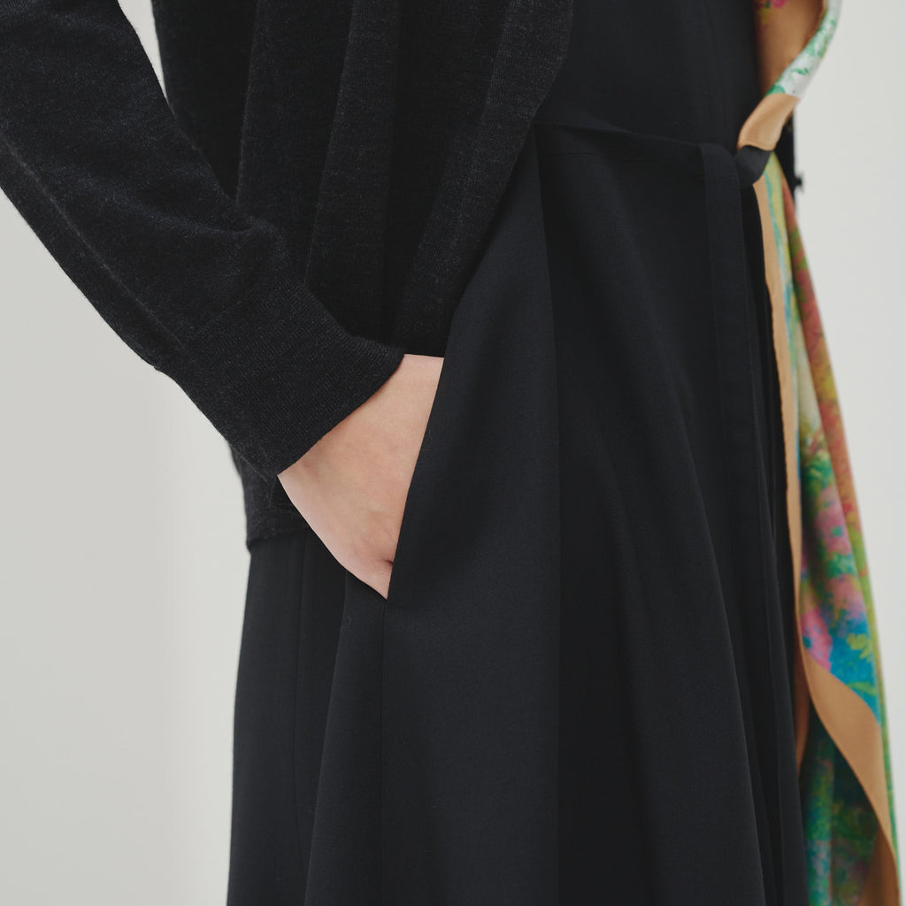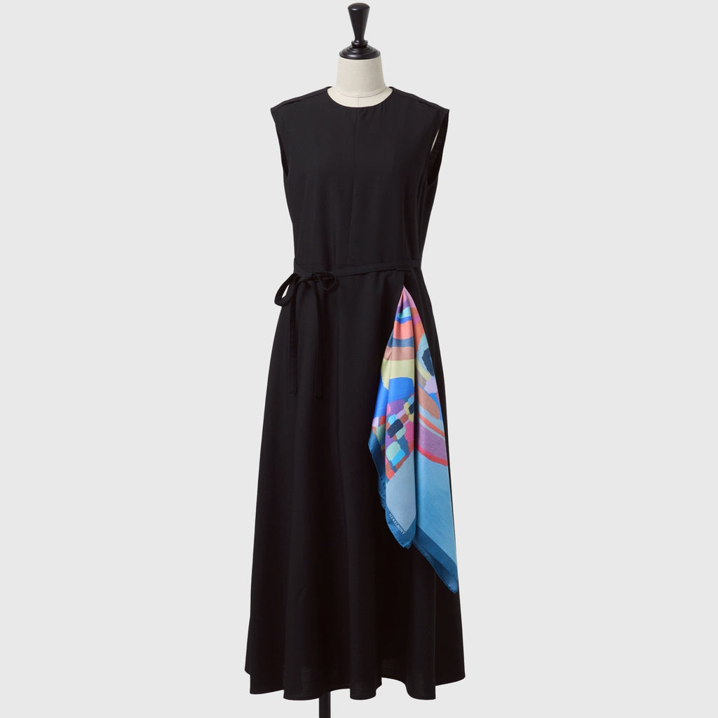 オケージョンシーンで自分だけの個性を放つ、スカーフをまとうワンピース。肩やウエストについたループにスカーフを通すだけで、あなただけのスタイリングが完成します。ジャケットとも合わせやすいしっかりとした素材感です。