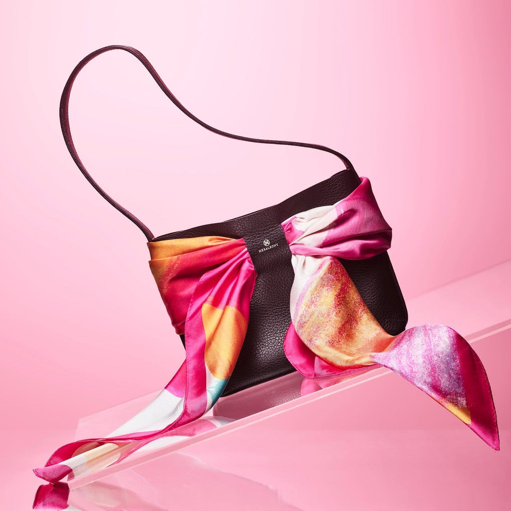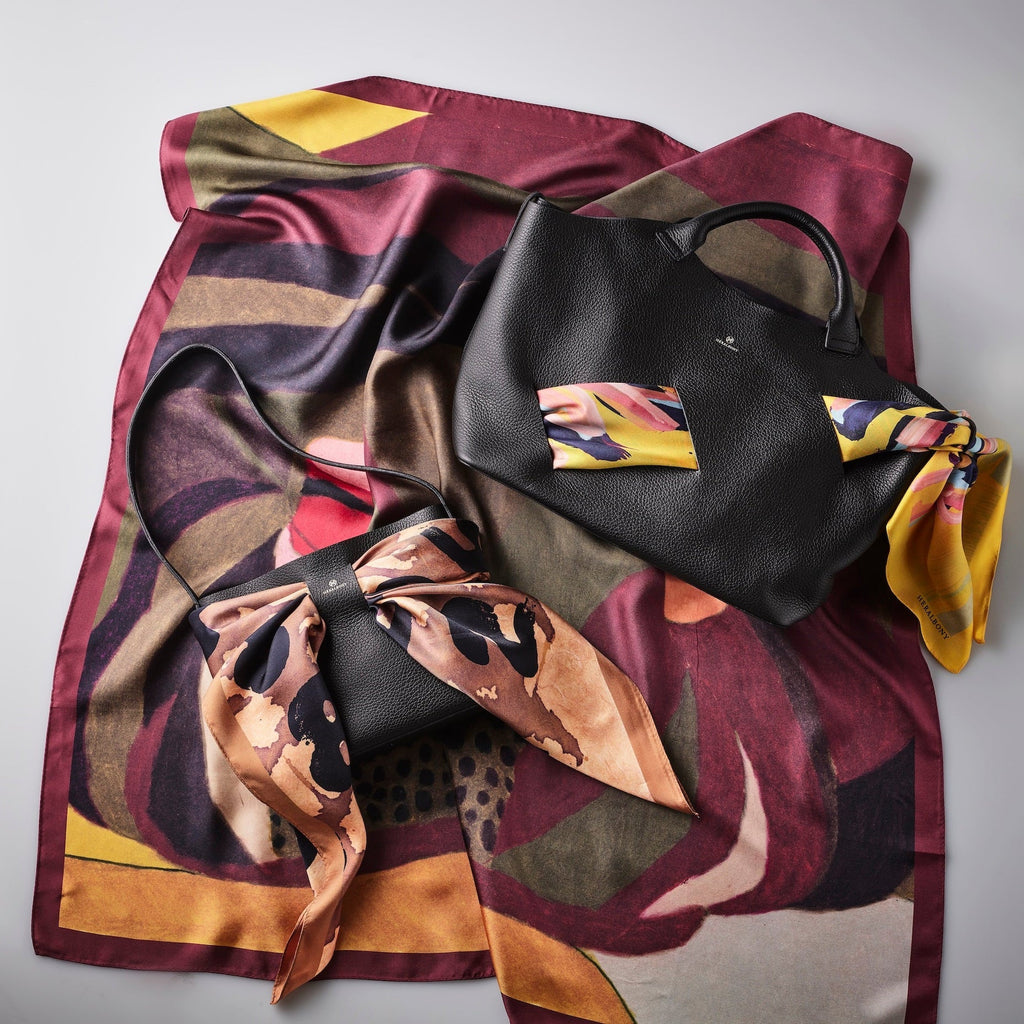 スリットにスカーフを通し、自分らしく彩るレザーバッグ。しなやかな本革が、異彩のアートを引き立てます。スカーフのアートや結び方によって、さまざまなスタイリングが可能です。スカーフを通さず、シンプルなショルダーバッグとしてもお使いいただけます。