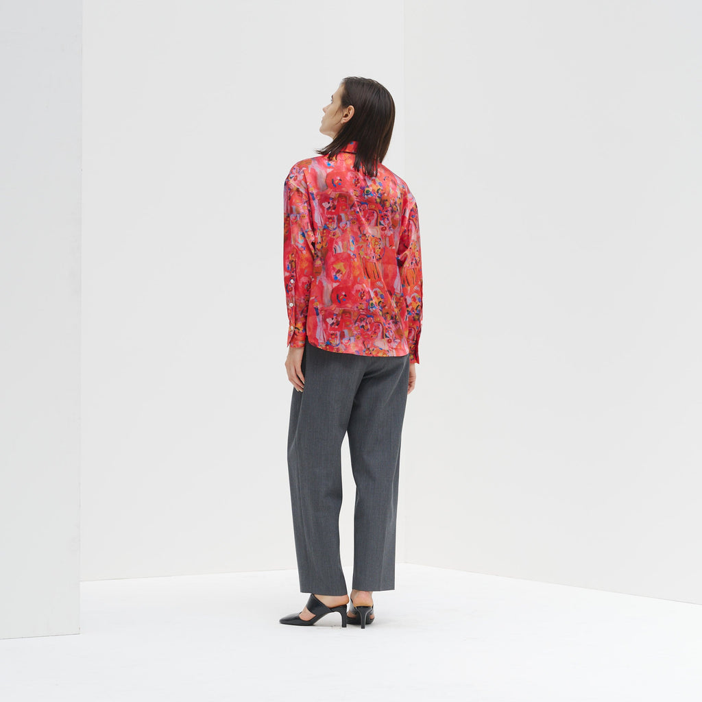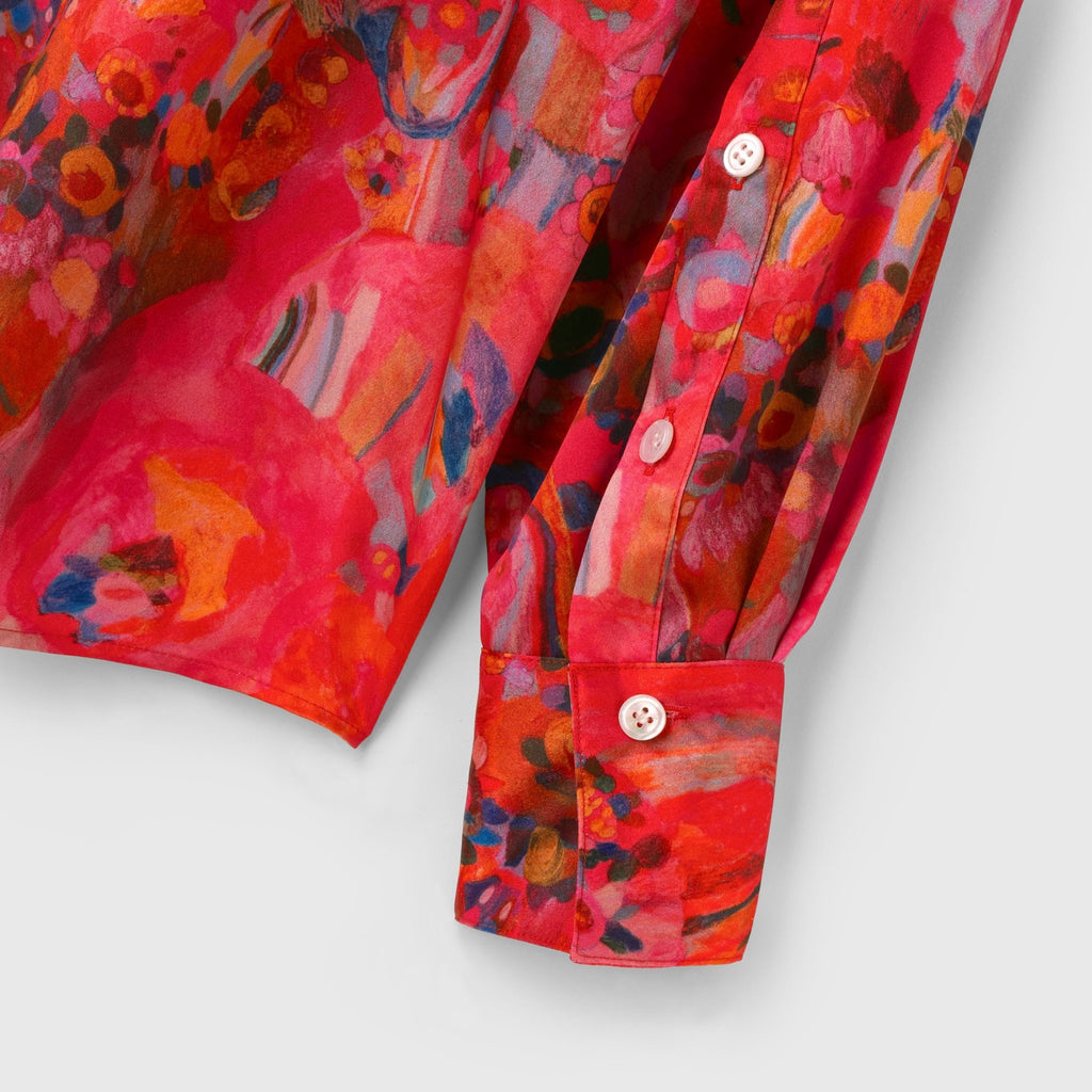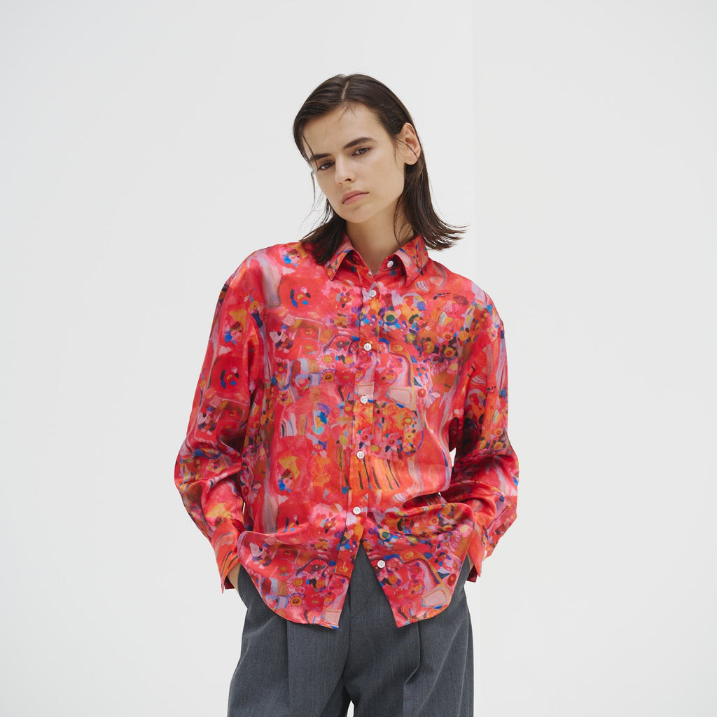 ほのかな光沢を感じるクレープサテンにアートをプリントし、オフィスやオケージョンでも着用できる総柄シャツに仕上げました。ハリ感のあるやや肉厚な素材感です。
