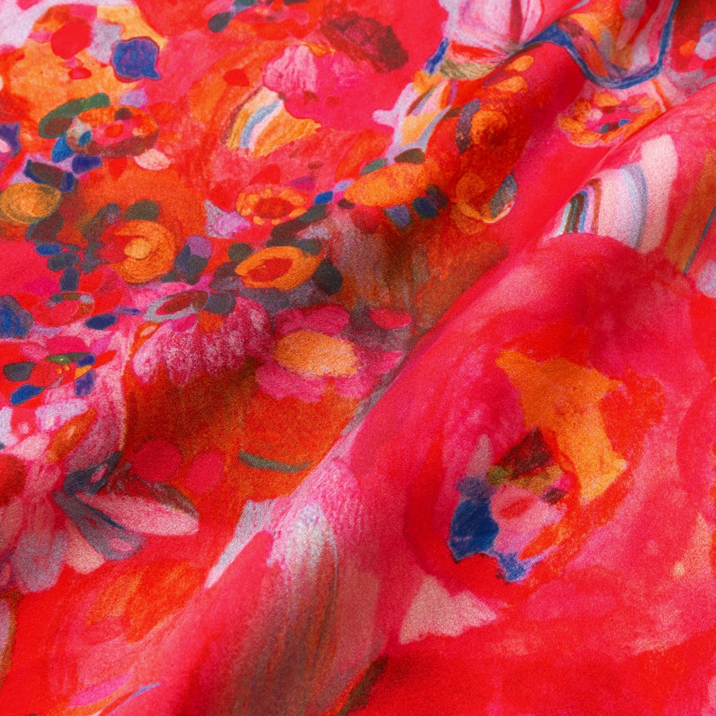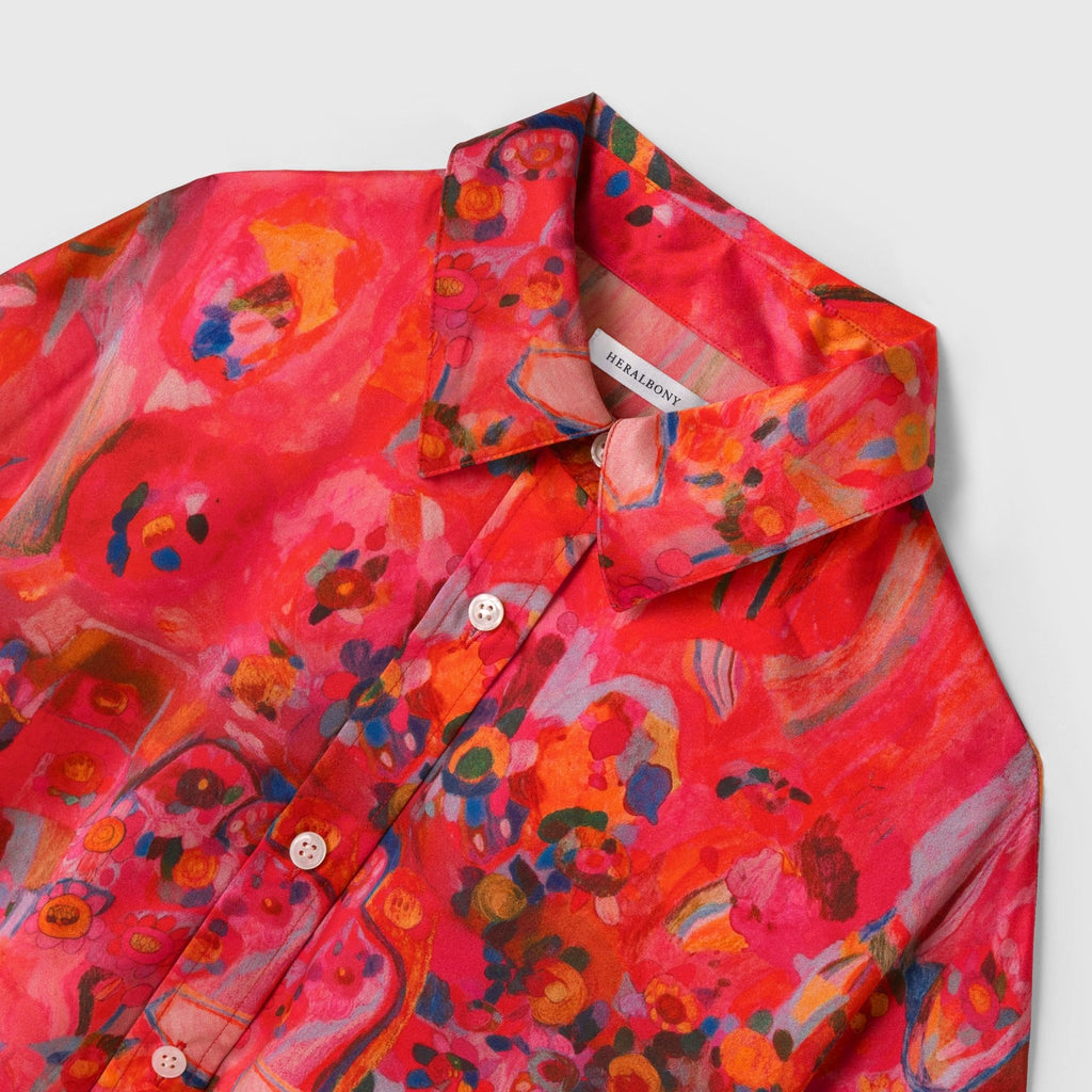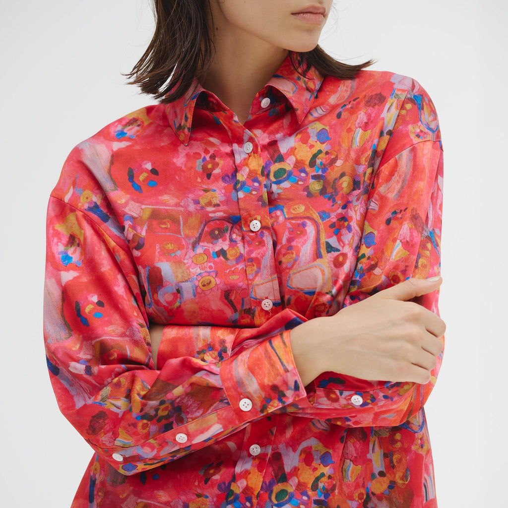 ほのかな光沢を感じるクレープサテンにアートをプリントし、オフィスやオケージョンでも着用できる総柄シャツに仕上げました。ハリ感のあるやや肉厚な素材感です。