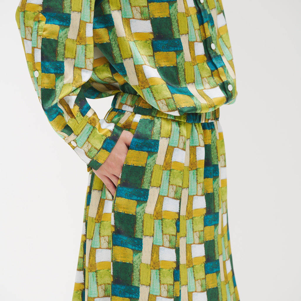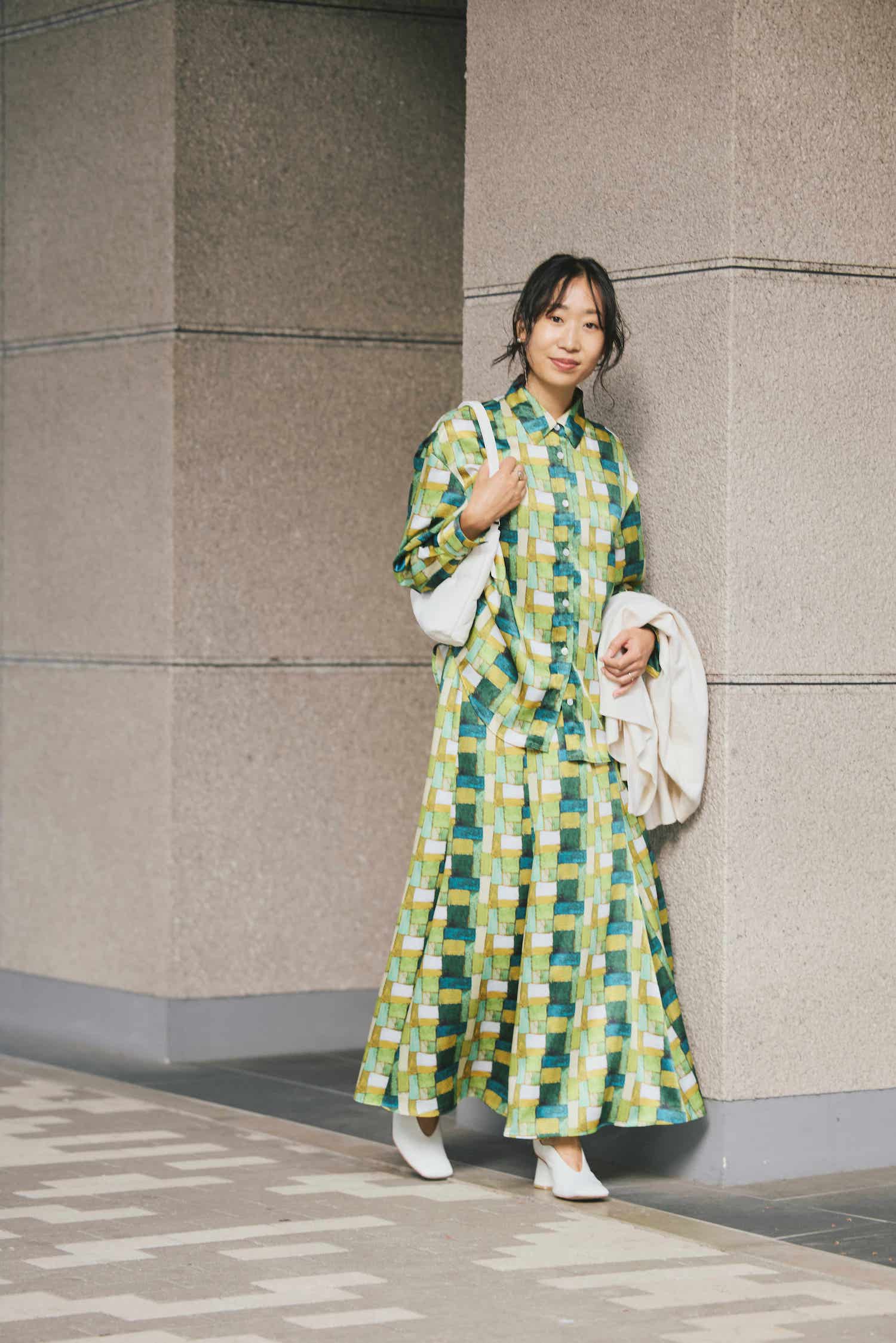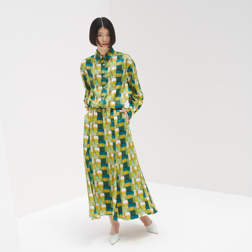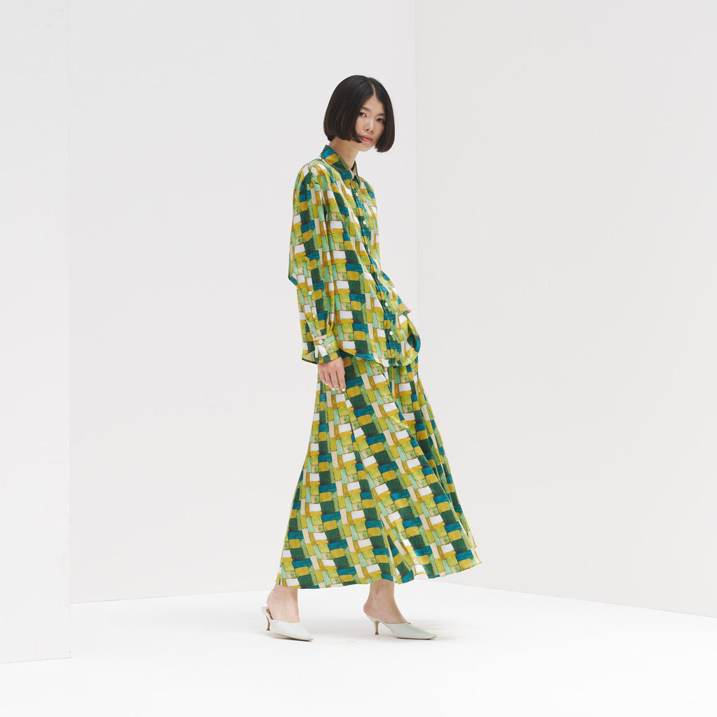 同じアートを起用したサテンスカートとセットアップが可能です。よりドレッシーな印象となり、登壇や式典などのフォーマルな場でも華やかな印象に。