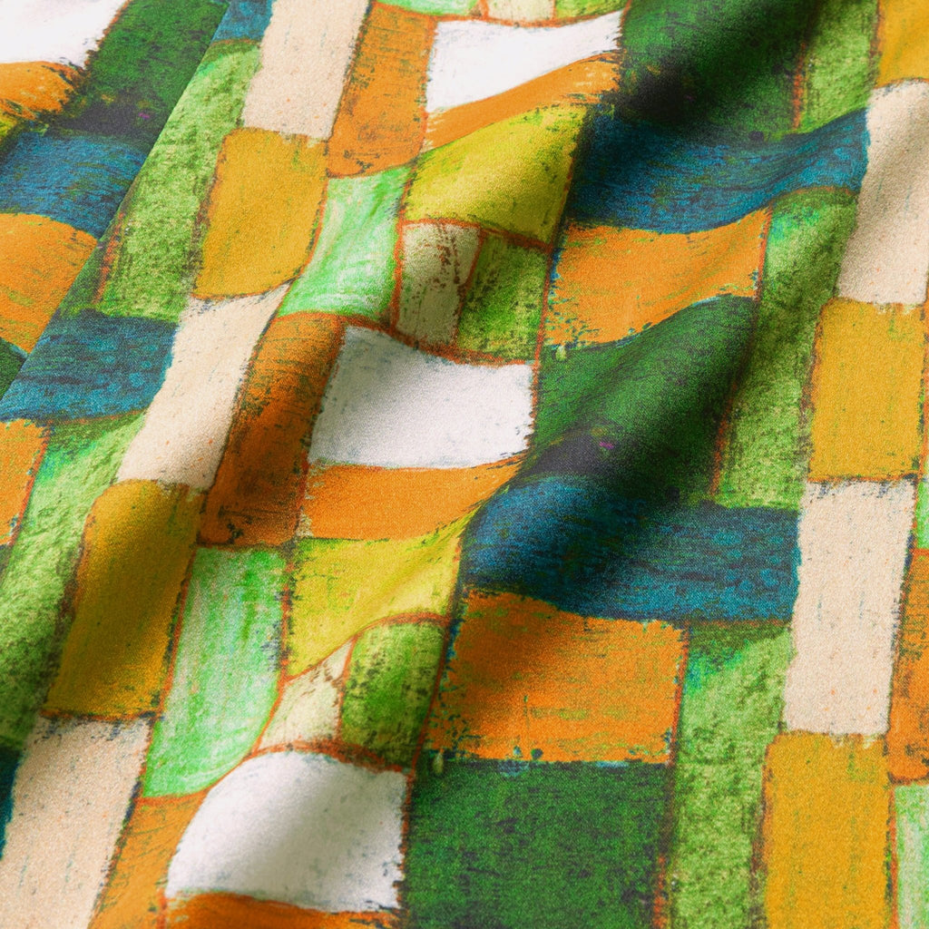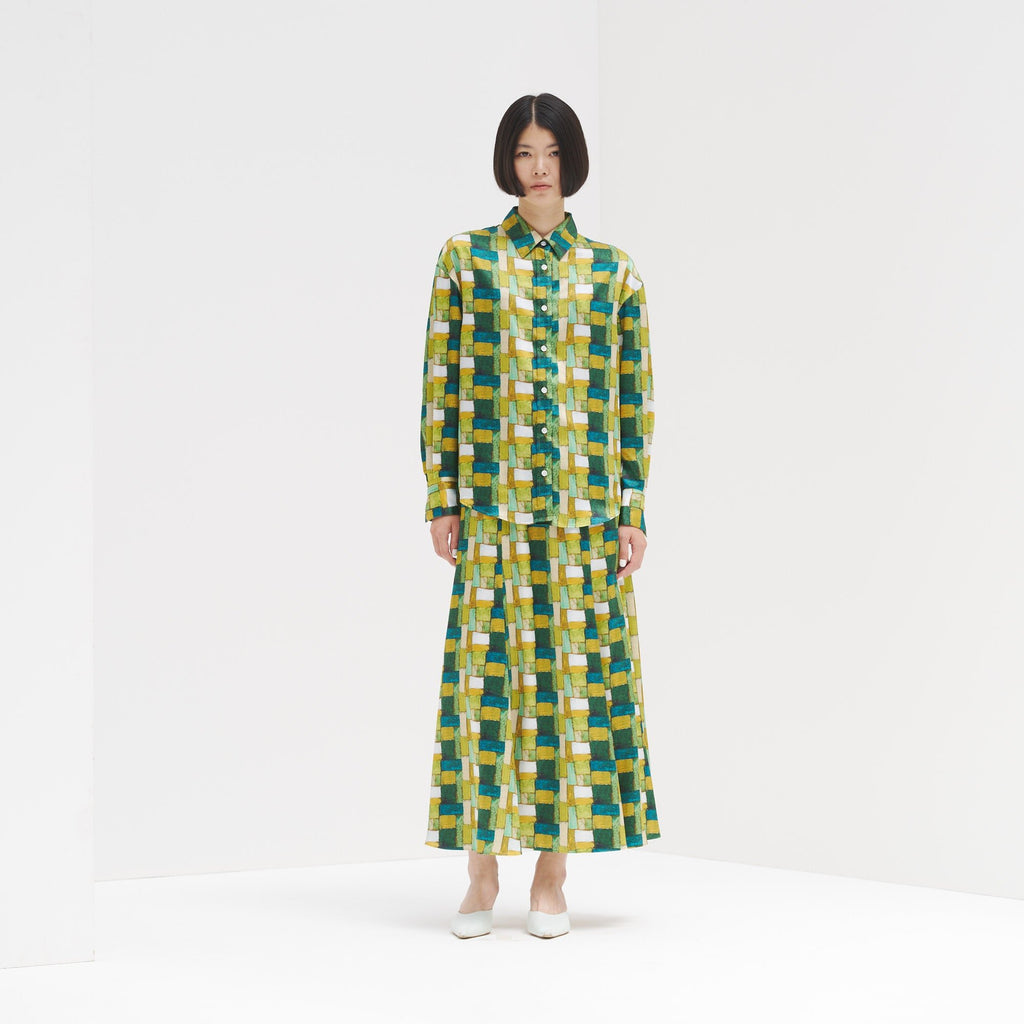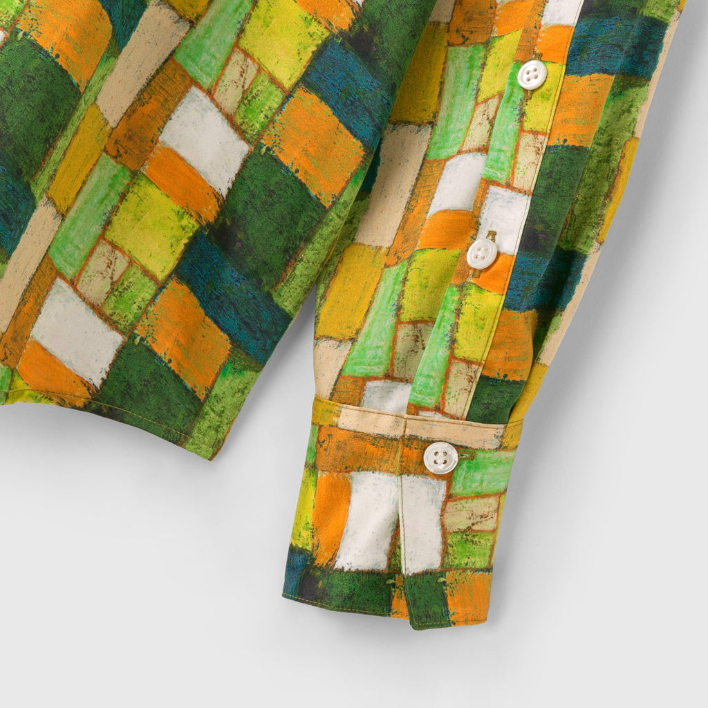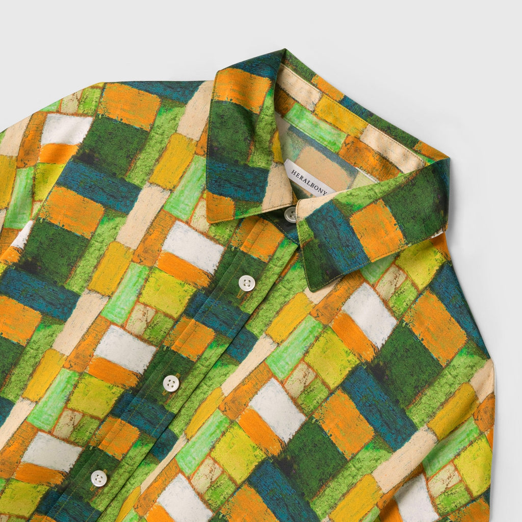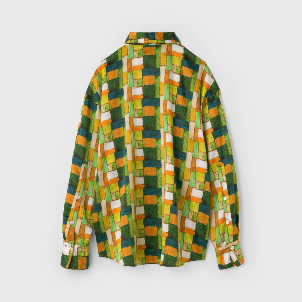 ほのかな光沢を感じるクレープサテンにアートをプリントし、オフィスやオケージョンでも着用できる総柄シャツに仕上げました。ハリ感のあるやや肉厚な素材感です。