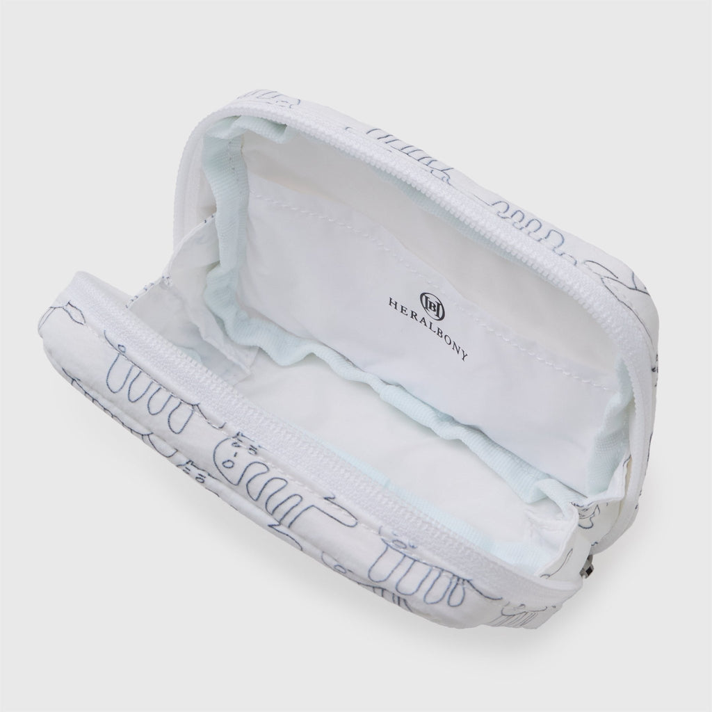 開けやすいWジッパータイプで、開口部が広いため中身をスムーズに取り出せます。内側には仕切りポケットと小物ポケットを装備し、イヤフォンや常備薬などの小さなアイテムもすっきり収納できます。