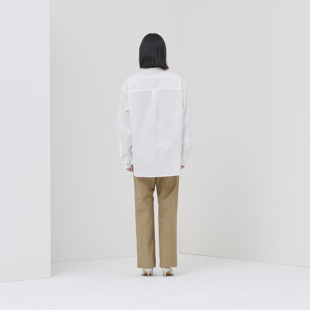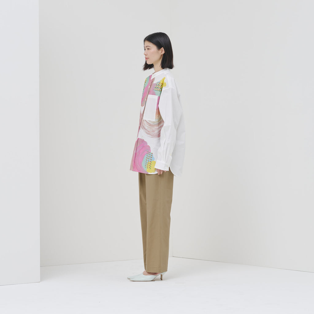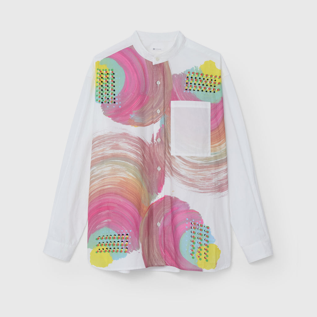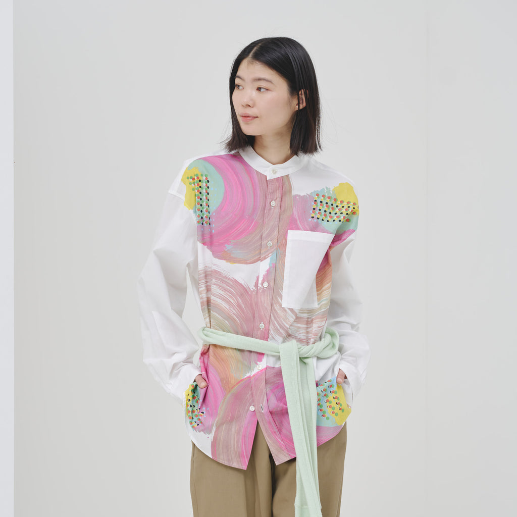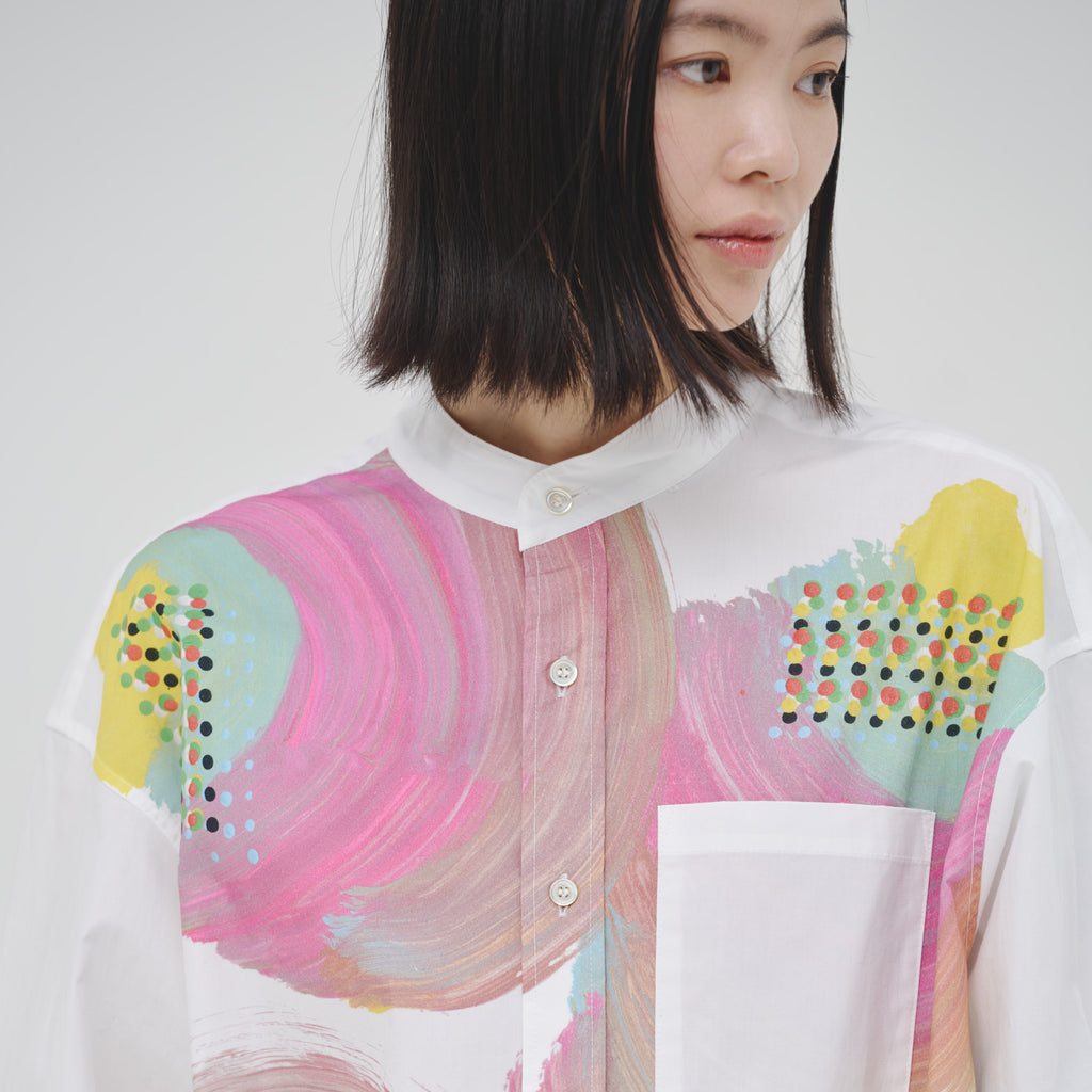 ビビッドな図形にドットが踊る、水上 詩楽(Shigaku Mizukami)のアートを起用したバンドカラーシャツ。ビッグシルエットでジェンダーレスに着こなせます。数ある作品から「黒・ピンク」を基調とした2作品を起用し、あえて胸ポケットは白地にすることで、図形を重ねて描く彼の創作スタイルを表現しました。モデル身長:172㎝