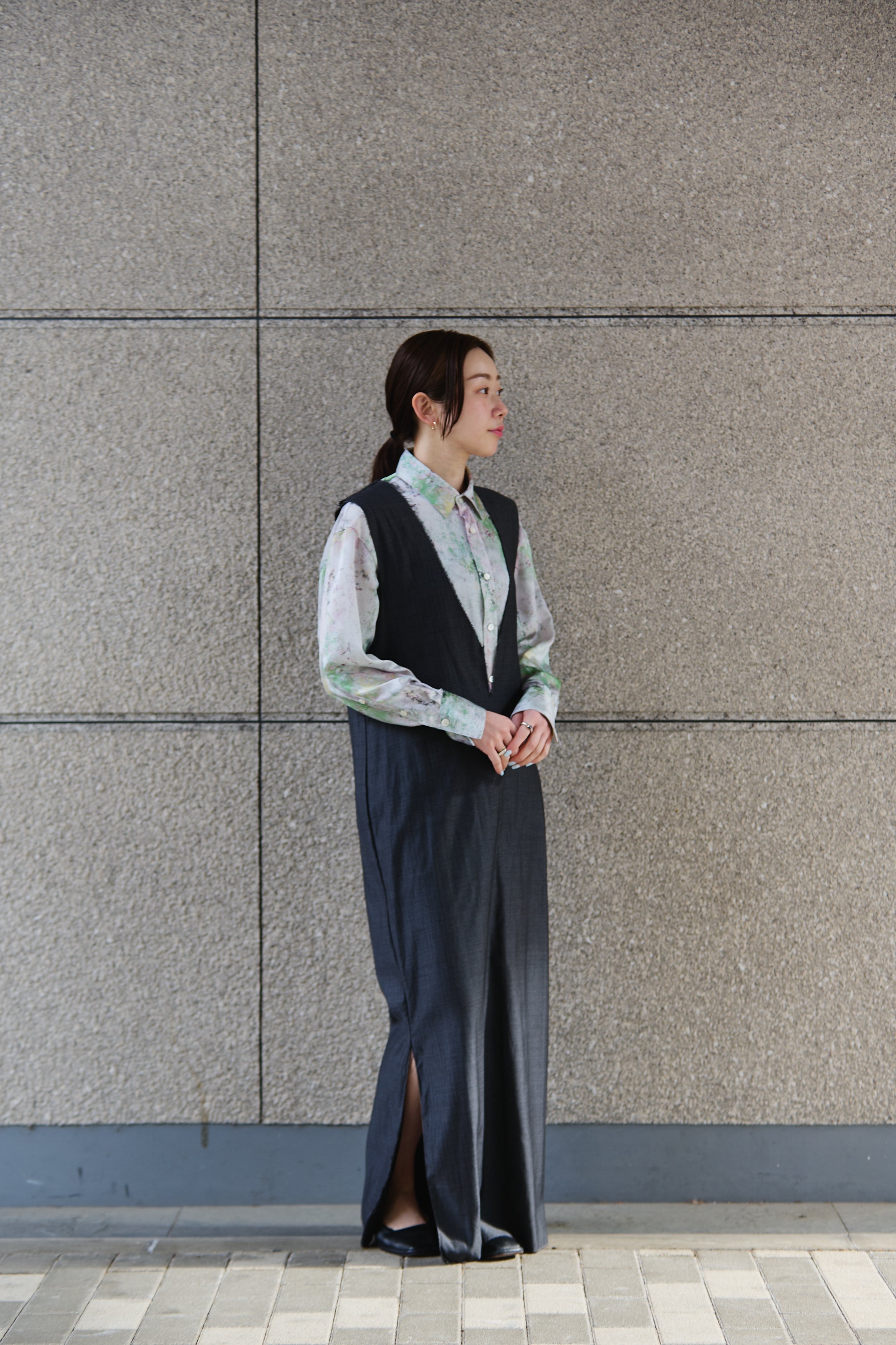 ジレやジャケットと合わせればビジネスシーンを彩る一枚に。デニムやワイドパンツと合わせれば、上品な休日の装いに。合わせるボトムス次第で、幅広く活躍します。裾はインでもアウトでも着こなせるので、ニットをレイヤードしてちらりと裾を見せるスタイリングもおすすめです。