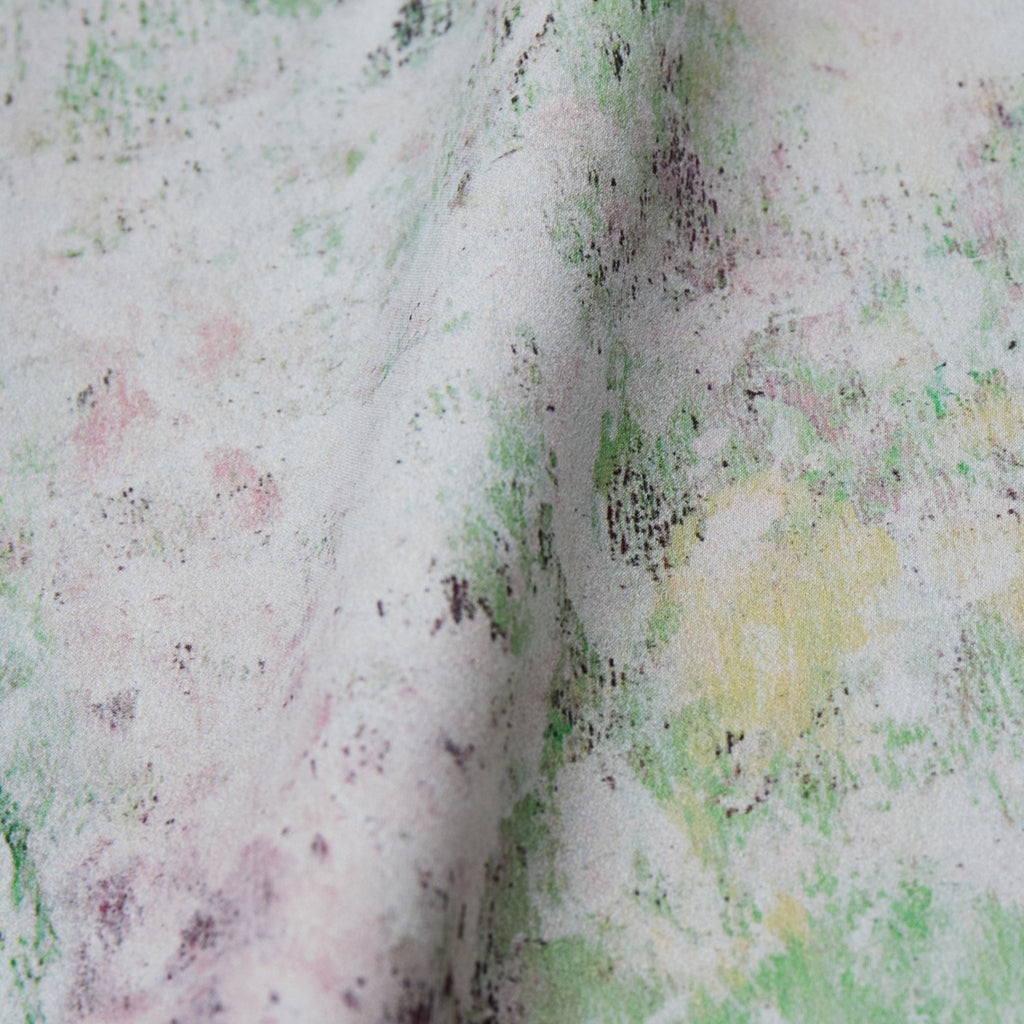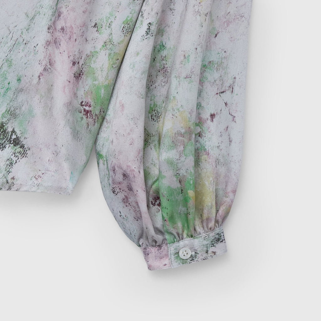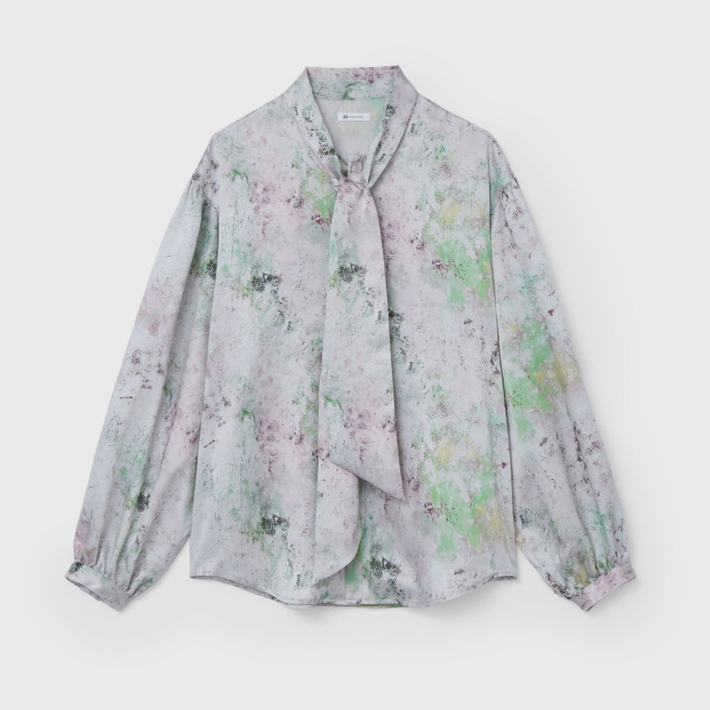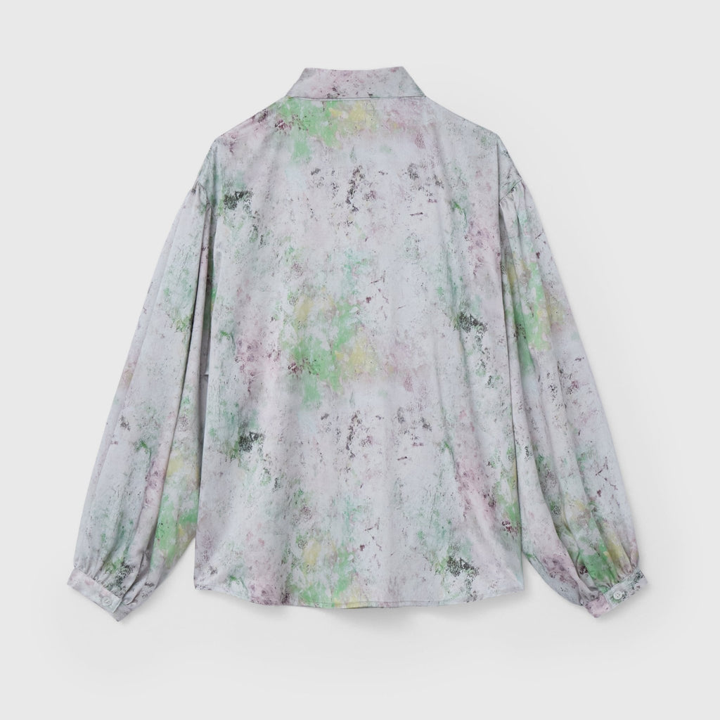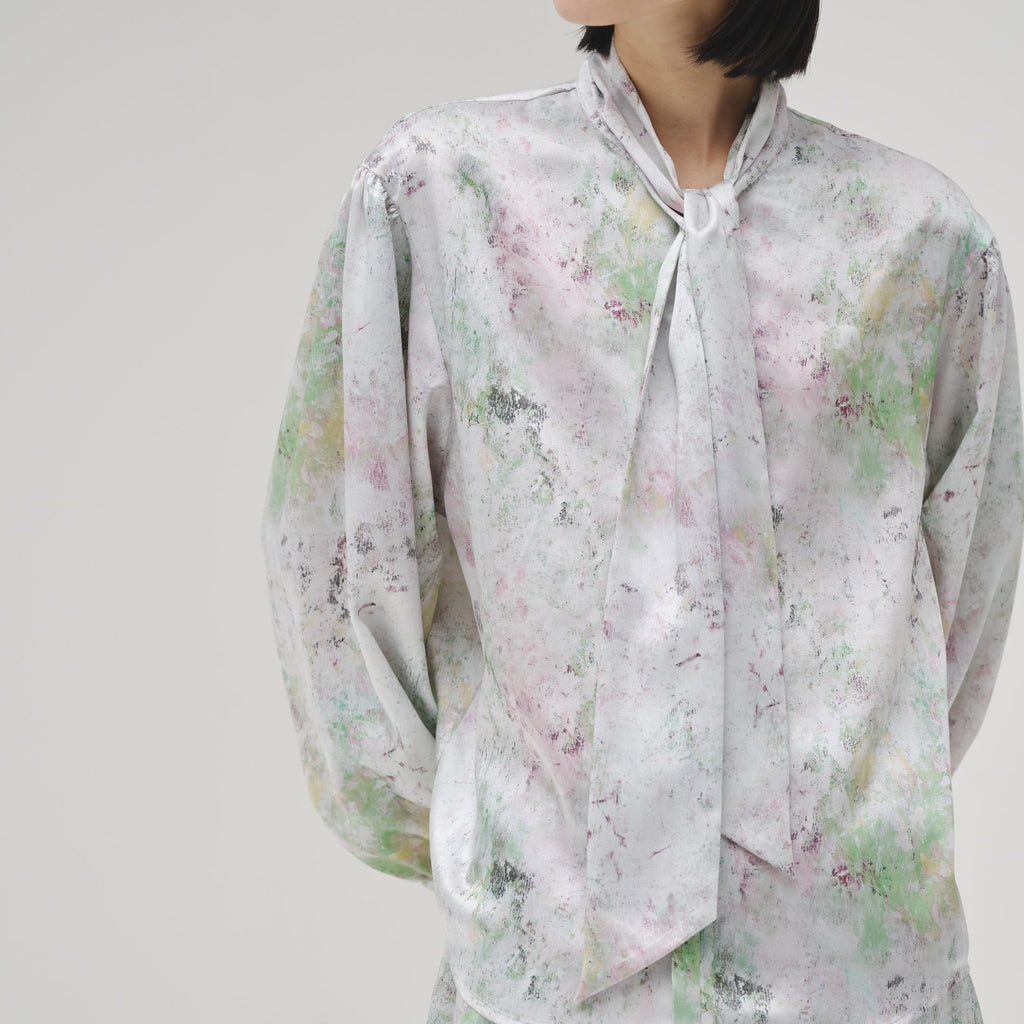 ほのかな光沢を感じるクレープサテンにアートをプリントし、オフィスやオケージョンでも着用できる総柄ブラウスに仕上げました。ハリ感のあるやや肉厚な素材感です。
