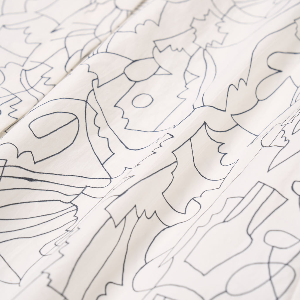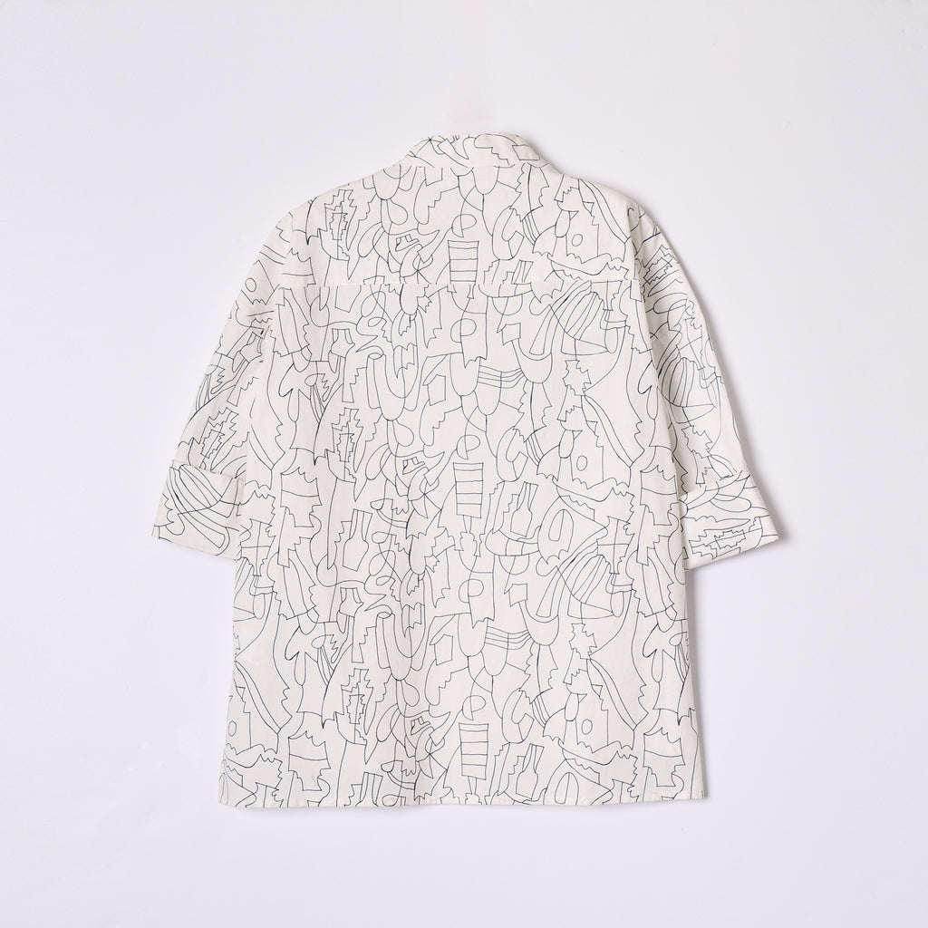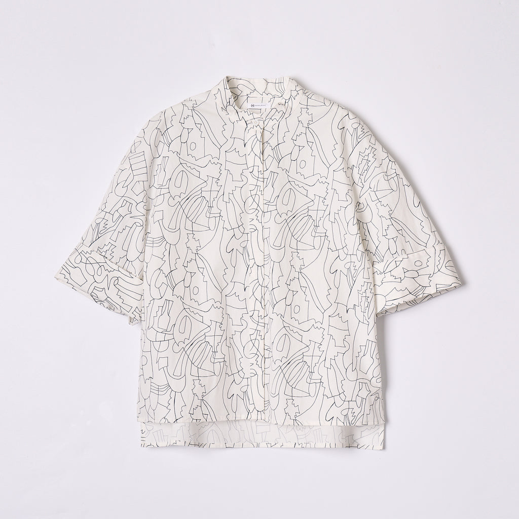 アイテムを選ばないモノクロアートを起用した半袖シャツ。ほどよくボリュームのある袖とフレアシルエットが涼しげな印象です。