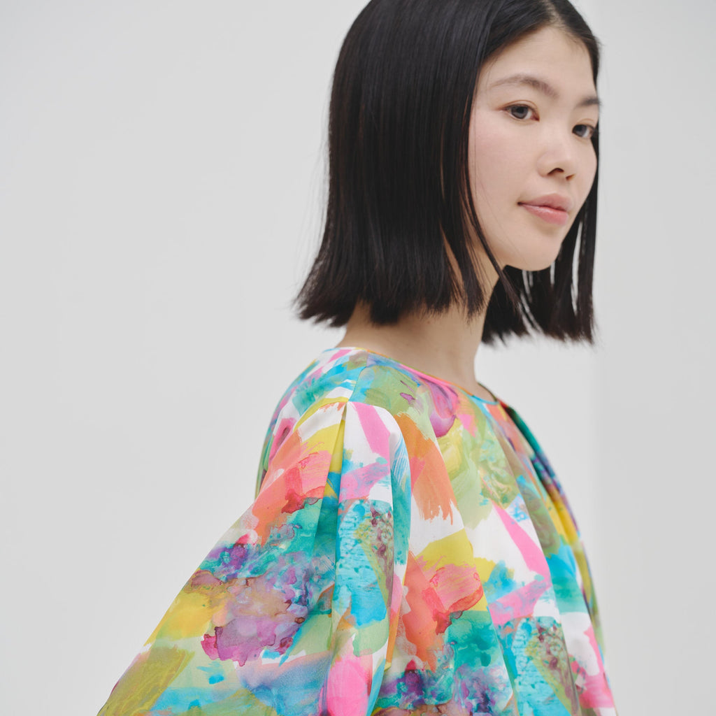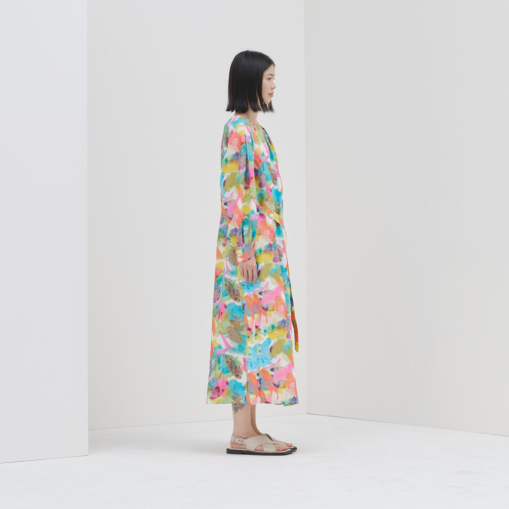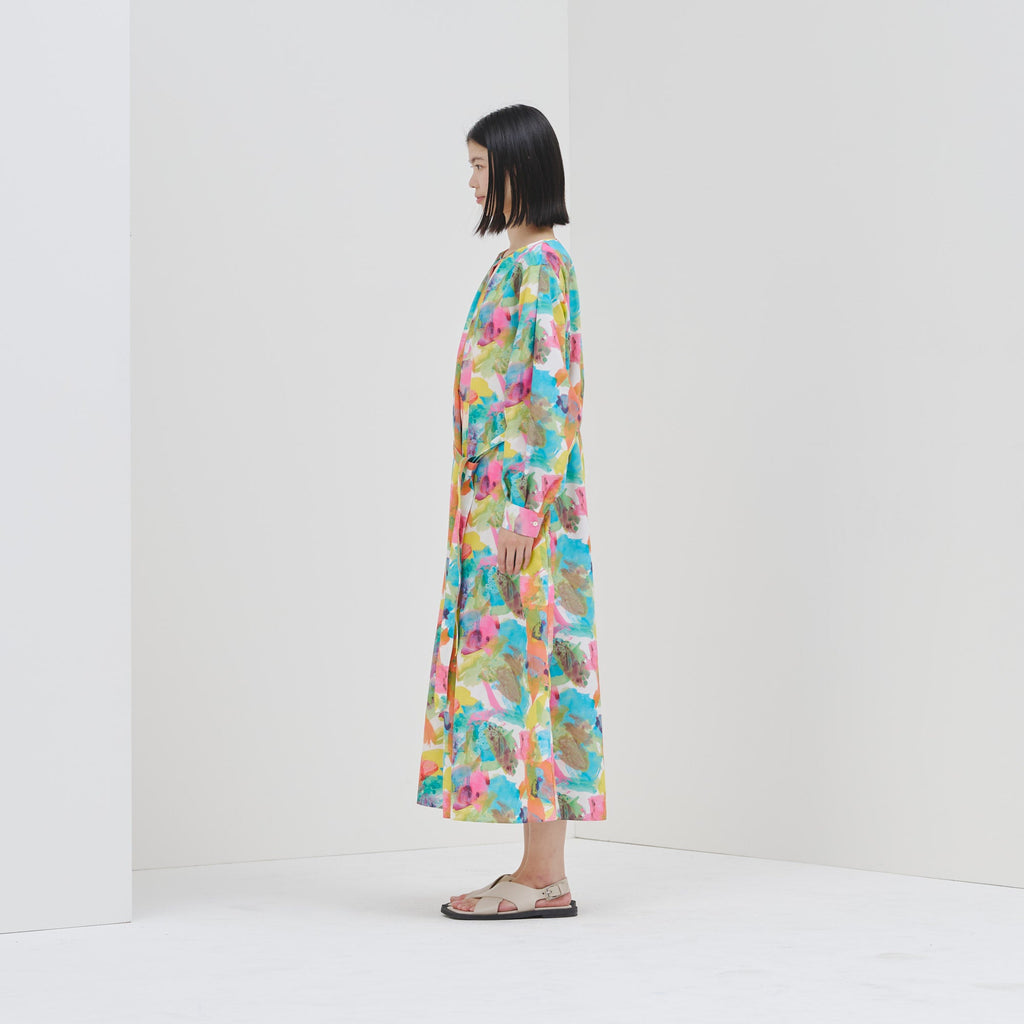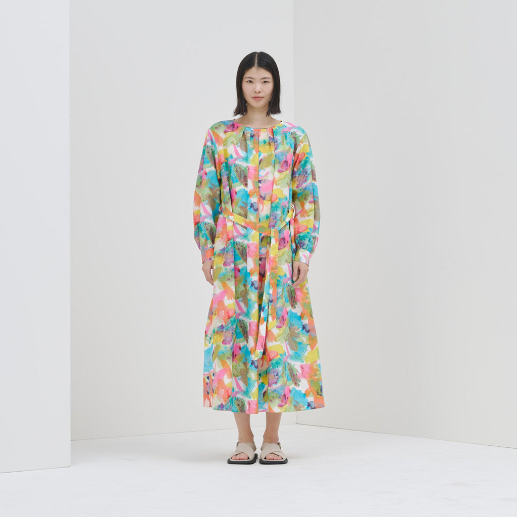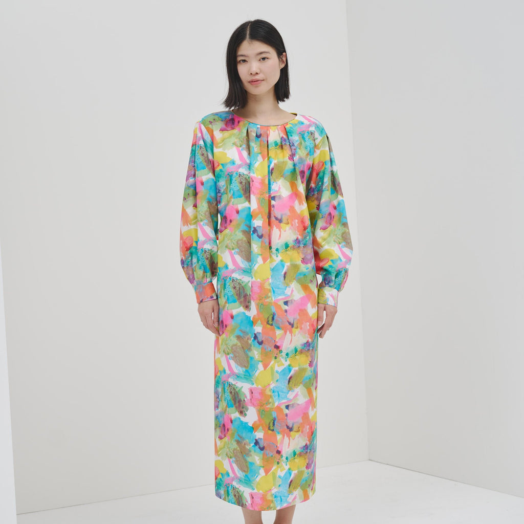 異彩が放つ魅力を感じられながらも、合わせるアイテムを選ばない絶妙なアートをセレクトしました。デイリーシーンをさりげなく華やかに彩るワンピースです。環境に優しいリサイクルポリエステル繊維のスパンブロード生地を使用し、先シーズンより少し光沢を抑えた生地感に仕上げました。パーティなどのおでかけにも、日常のおしゃれ着にも馴染みます。リラックス感がありながら上品な印象が魅力です。