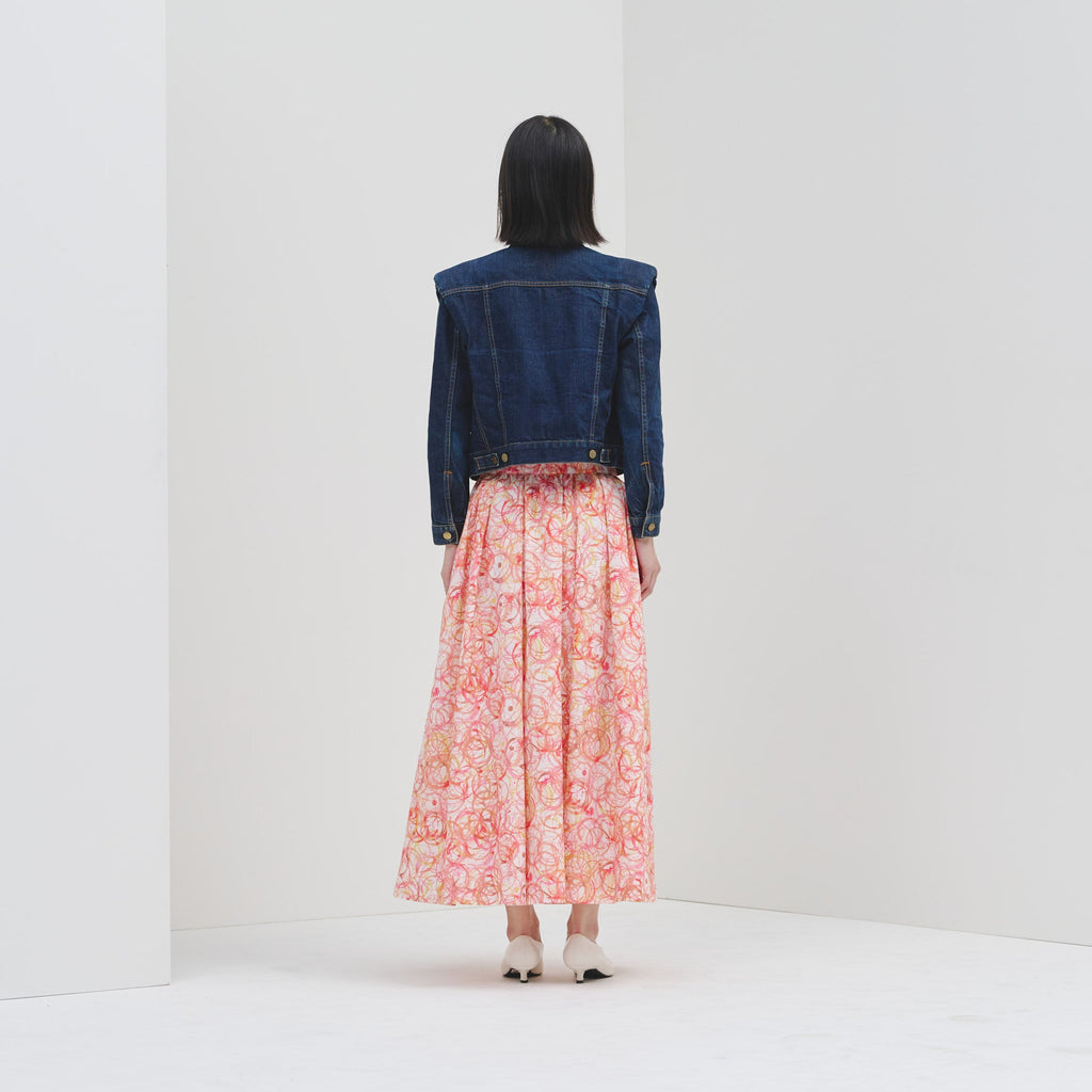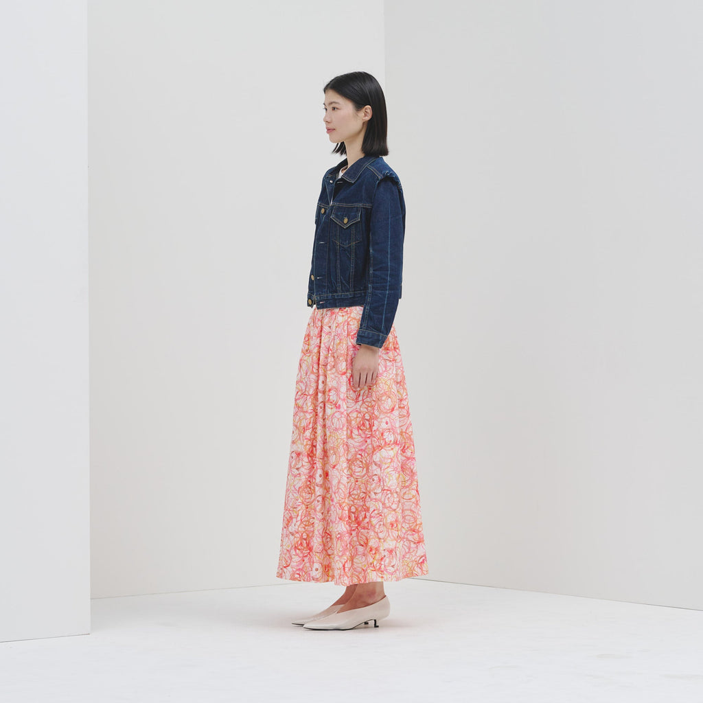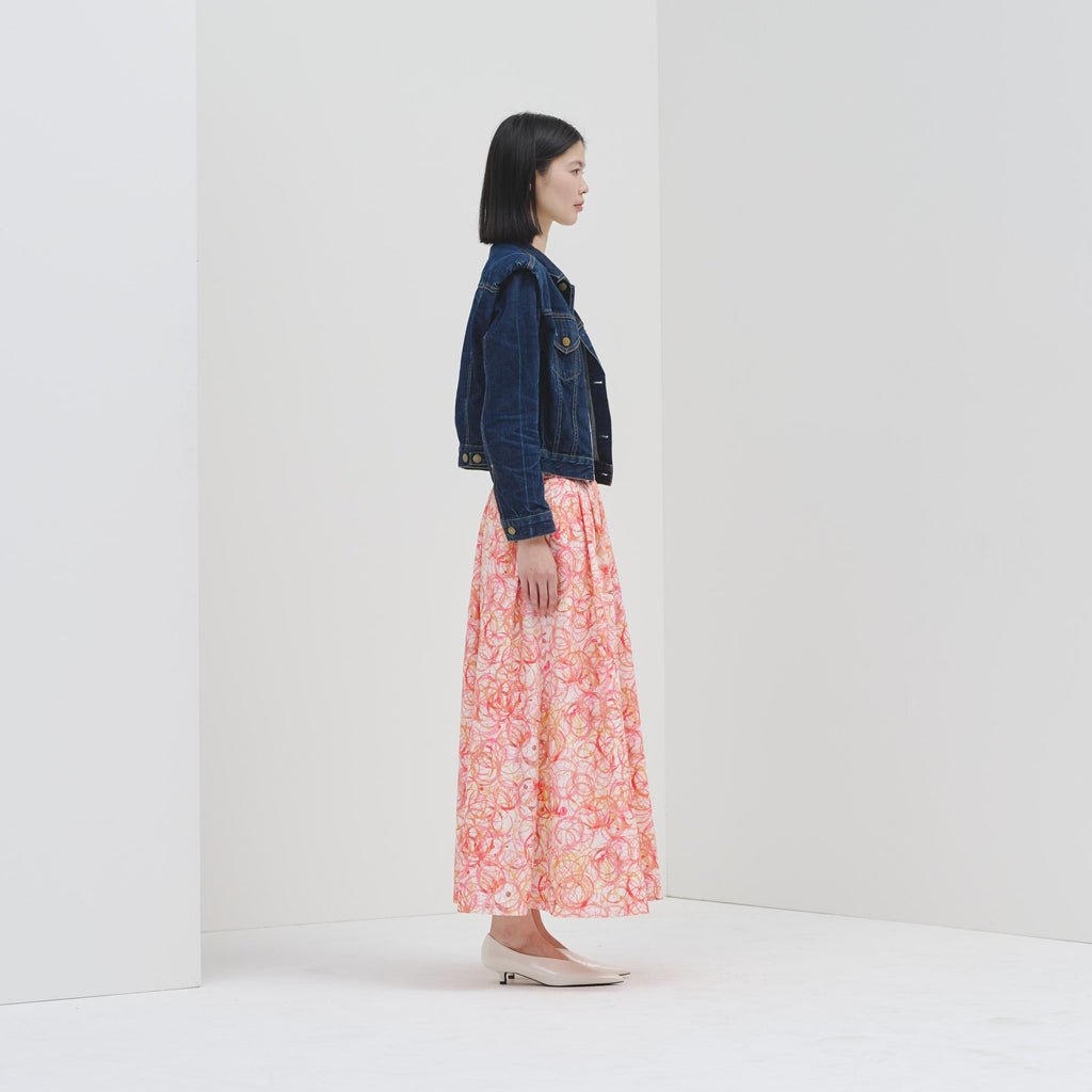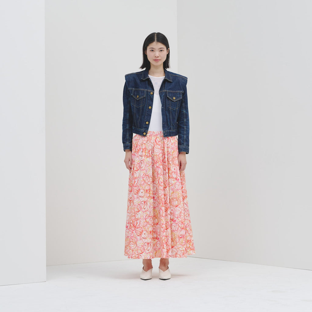 ご好評いただいたフレアスカートが、ハリ感のある生地にアップデートして登場。ランダムタックで軽やかに広がるアートのようなシルエットはそのままに、ウエストゴムで履き心地の良さにもこだわりました。