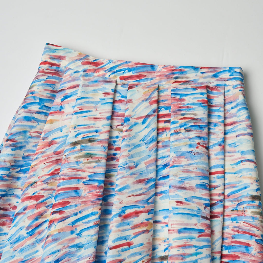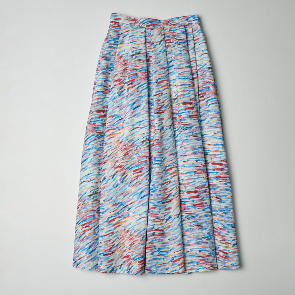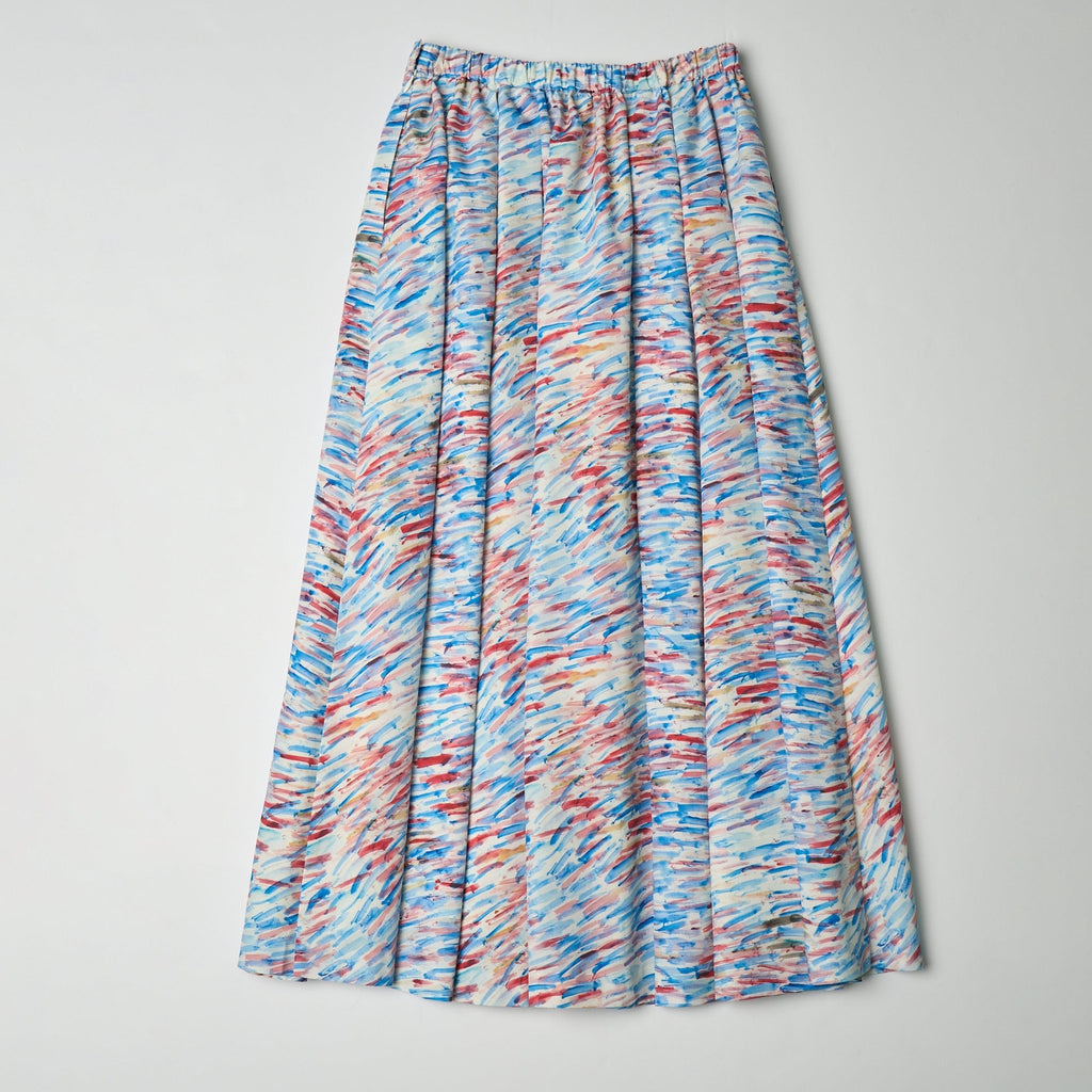 ご好評いただいたフレアスカートが、ハリ感のある生地にアップデートして登場。ランダムタックで軽やかに広がるアートのようなシルエットはそのままに、ウエストゴムで履き心地の良さにもこだわりました。