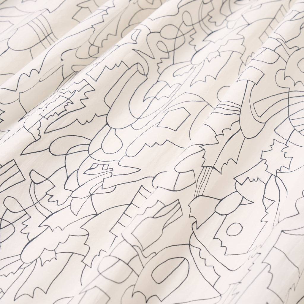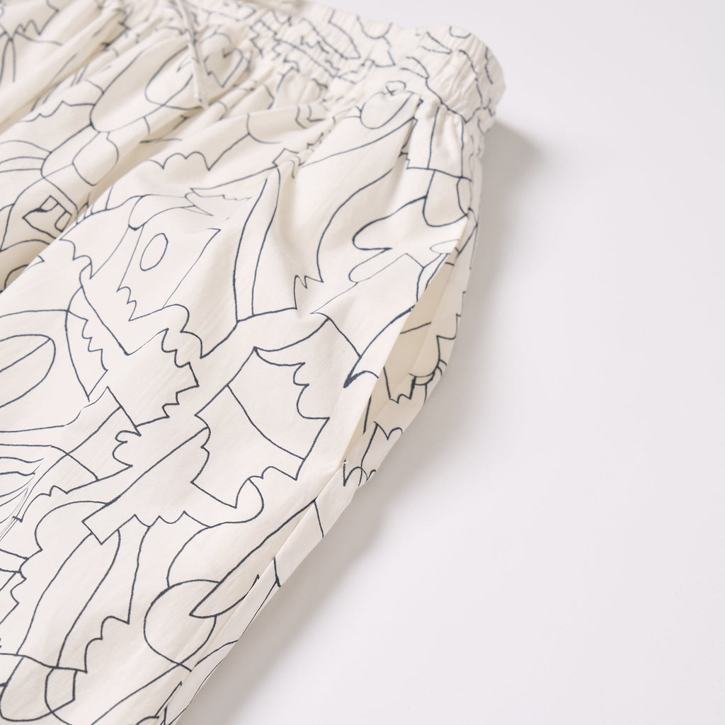 ゴムウエストのイージーな着心地と、ご自宅で手洗い可能なお手入れのしやすさもポイントです。同じアートを起用した「ノーカラーシャツ」とセットアップでもお召しいただけます。