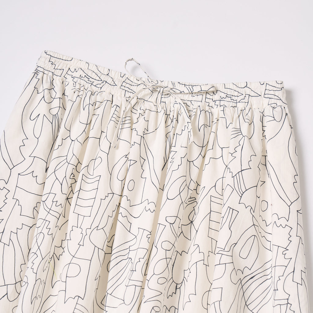 足元が美しく見えるロング丈とハリのあるオーガニックコットンで、アートが上品に揺れるスカートに仕上げました。ゴムウエストにはドローコードを通し、サイズ調整も簡単。快適な着心地も魅力です。