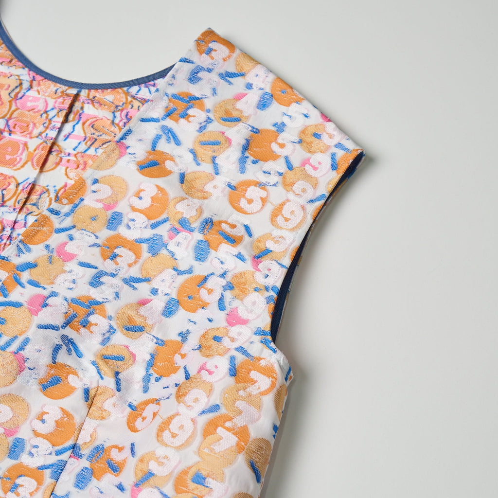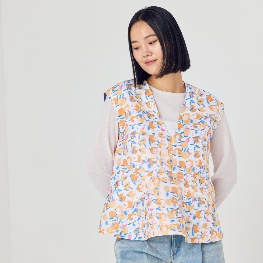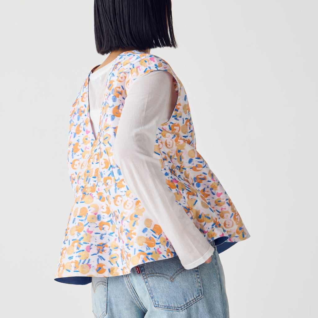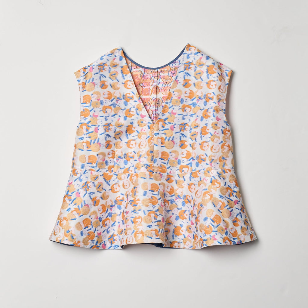 画材の厚みや凹凸をジャカードで再現したペプラムシルエットのノースリーブブラウス。前後2wayで、Vネックとクルーネックの2つのスタイリングを楽しむことができます。