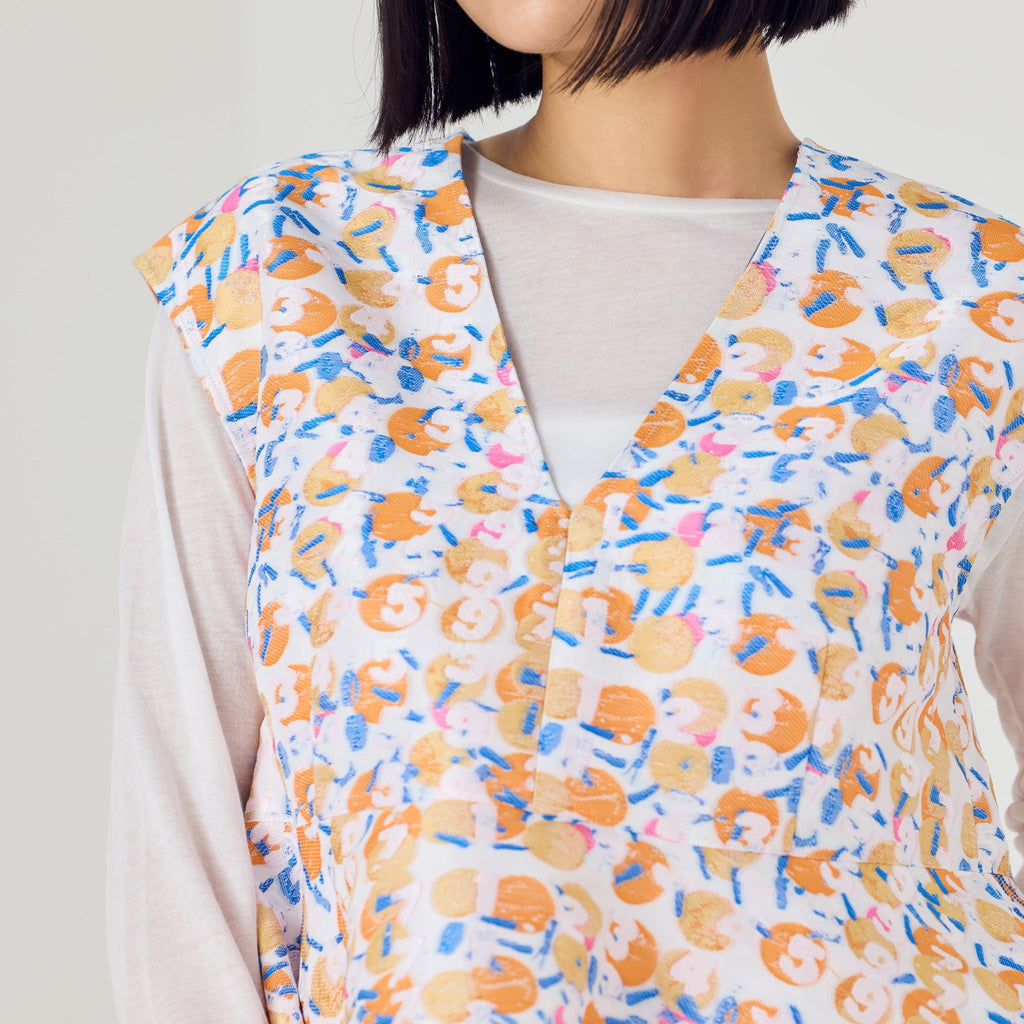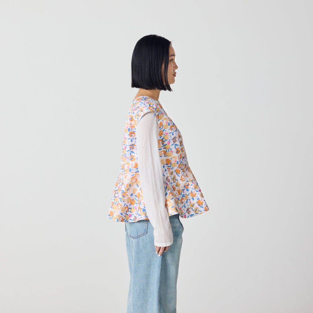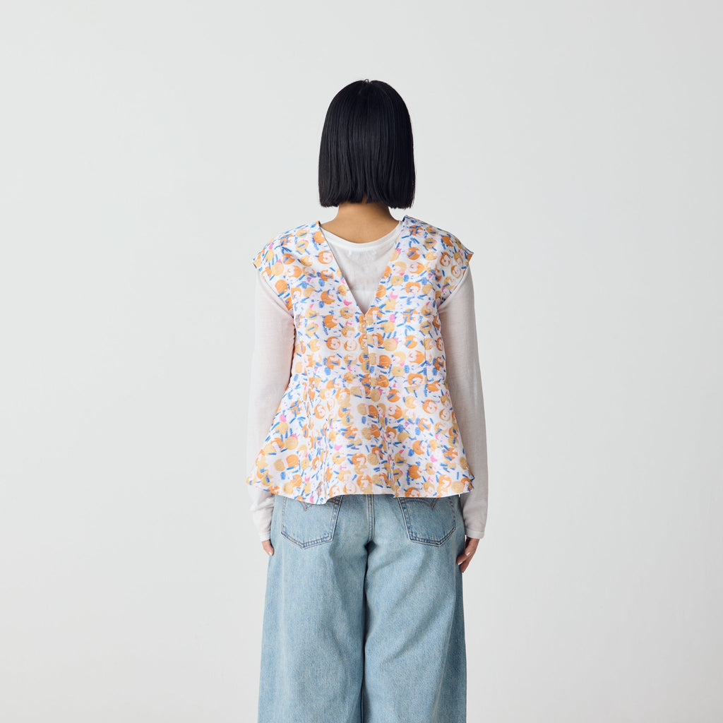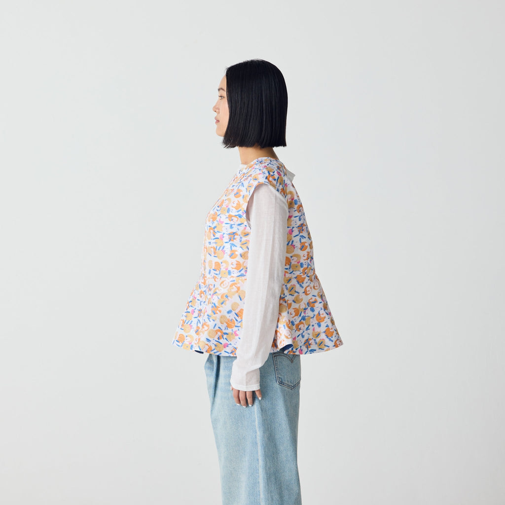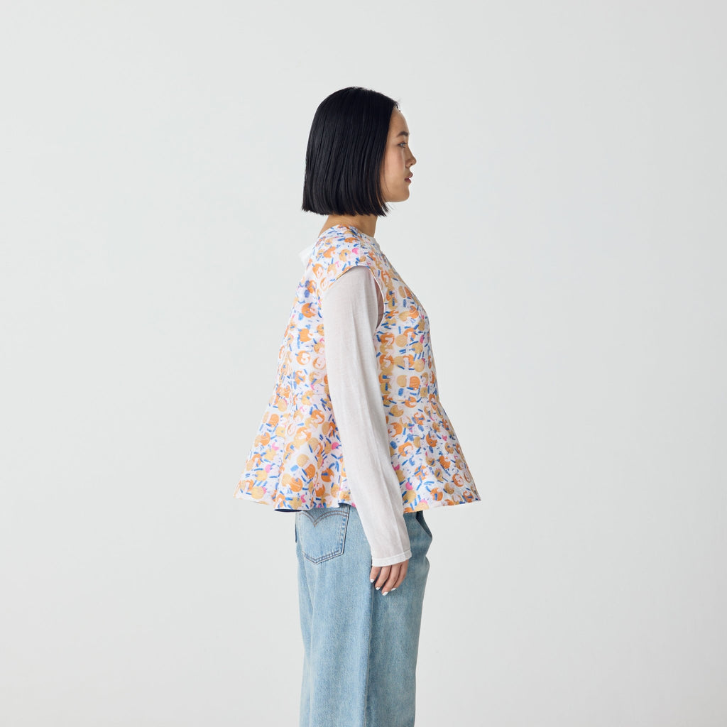 画材の厚みや凹凸をジャカードで再現したペプラムシルエットのノースリーブブラウス。前後2wayで、Vネックとクルーネックの2つのスタイリングを楽しむことができます。