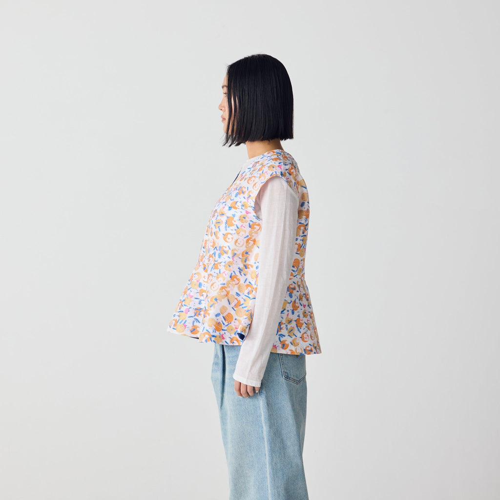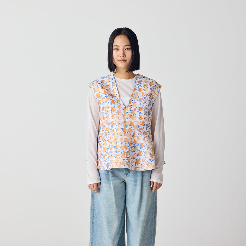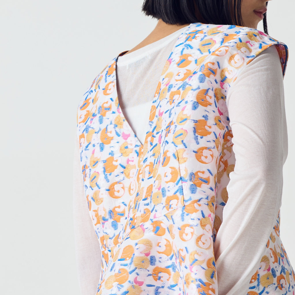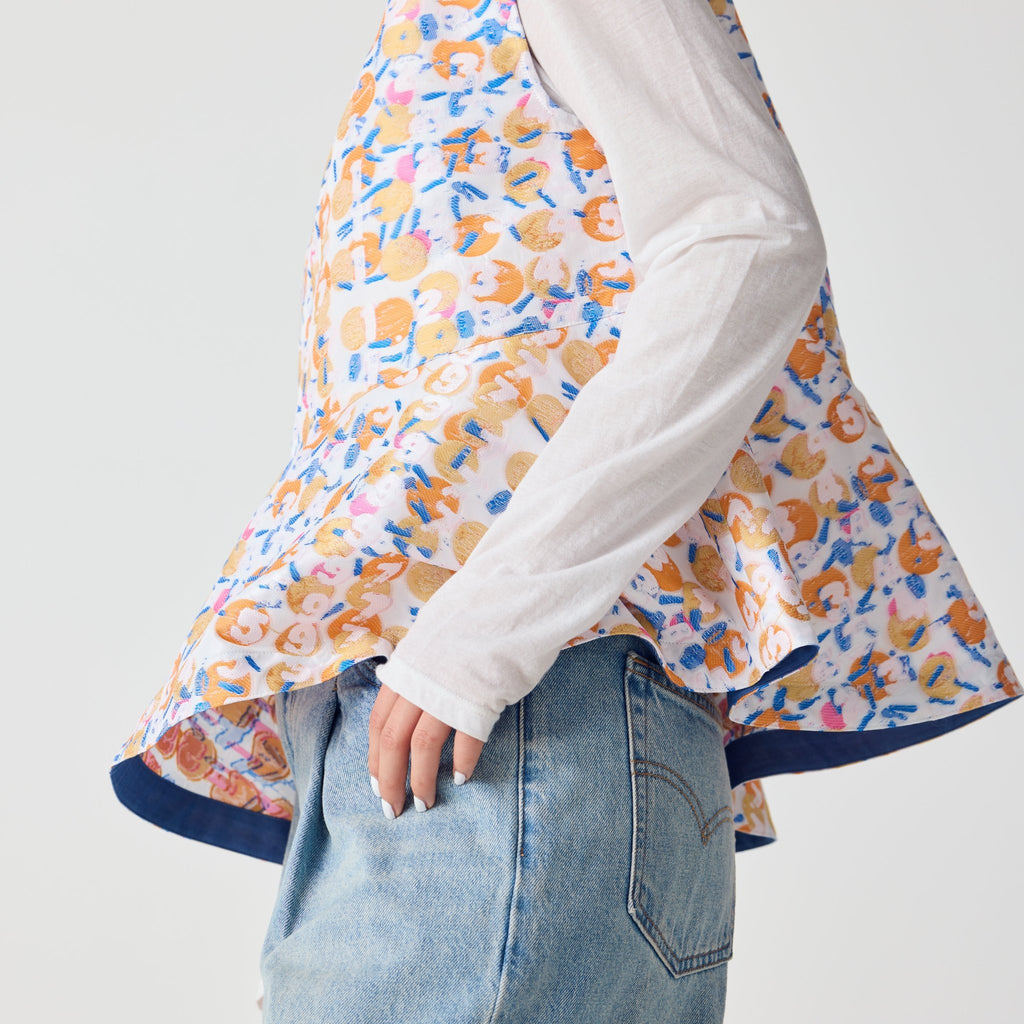 画材の厚みや凹凸をジャカードで再現したペプラムシルエットのノースリーブブラウス。前後2wayで、Vネックとクルーネックの2つのスタイリングを楽しむことができます。