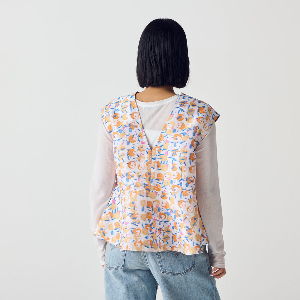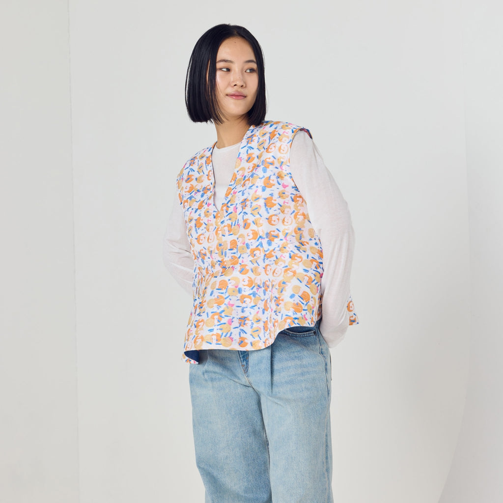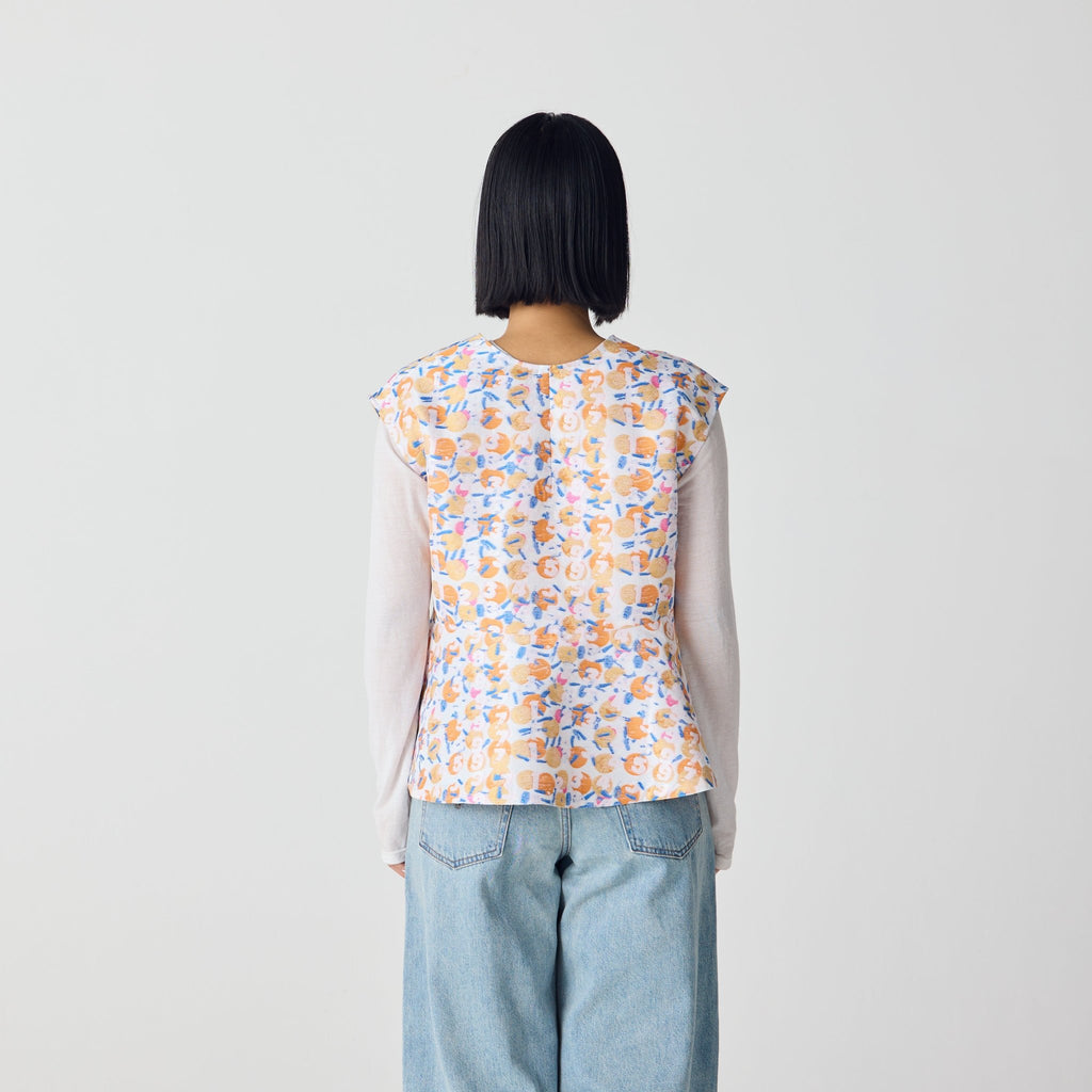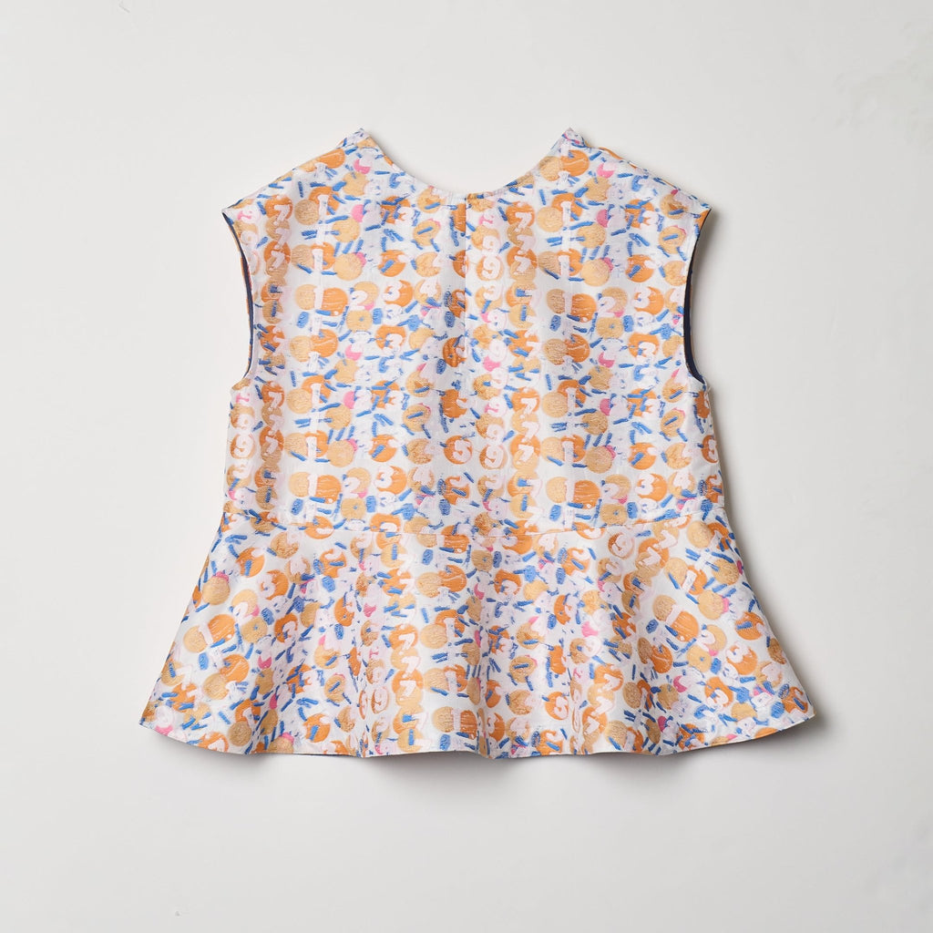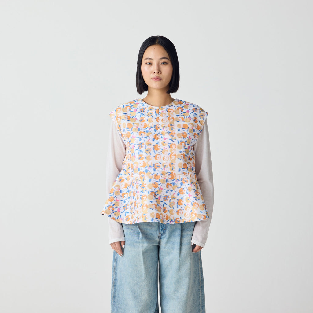 画材の厚みや凹凸をジャカードで再現したペプラムシルエットのノースリーブブラウス。前後2wayで、Vネックとクルーネックの2つのスタイリングを楽しむことができます。