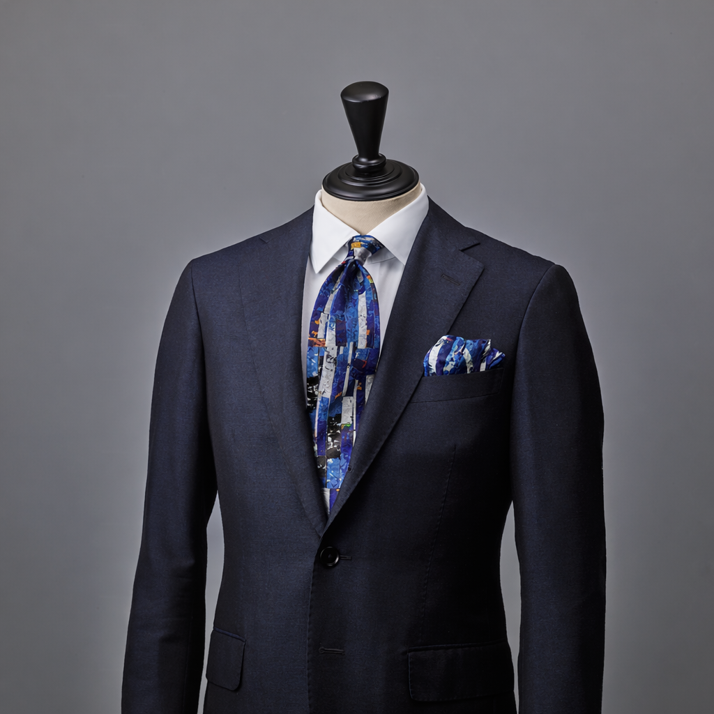 シルク100%の上品な光沢が、スーツスタイルを格上げするポケットチーフ。筆の勢いや筆圧を感じるアートは、折り方や胸ポケットから見せる分量によって、表情の変化を楽しめるのが魅力です。同じアートを起用したネクタイとのコーディネートもおすすめです。