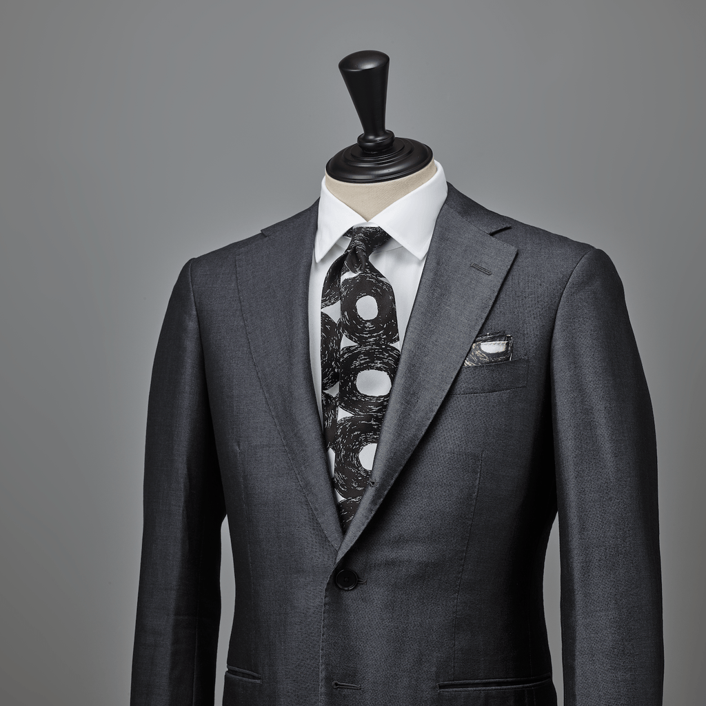 シルク100%の上品な光沢が、スーツスタイルを格上げするポケットチーフ。筆の勢いや筆圧を感じるアートは、折り方や胸ポケットから見せる分量によって、表情の変化を楽しめるのが魅力です。同じアートを起用したネクタイとのコーディネートもおすすめです。
