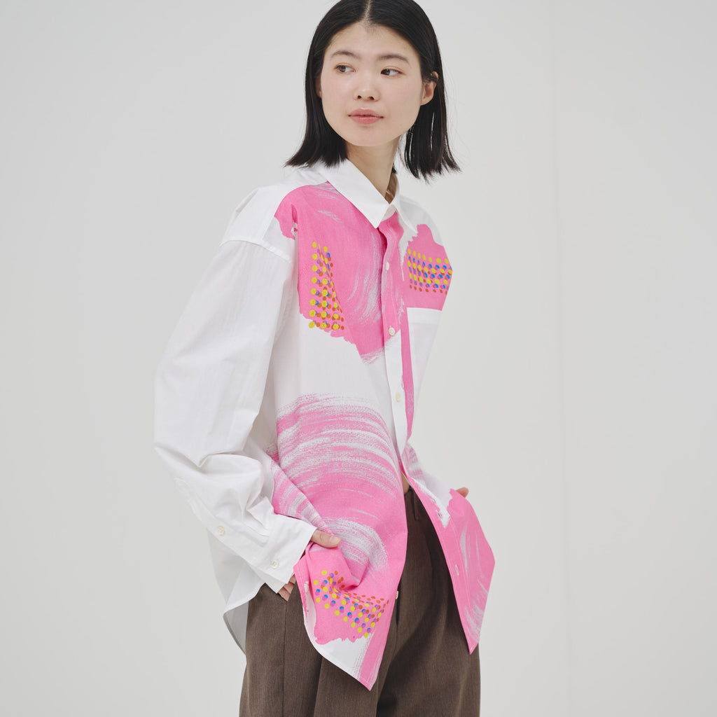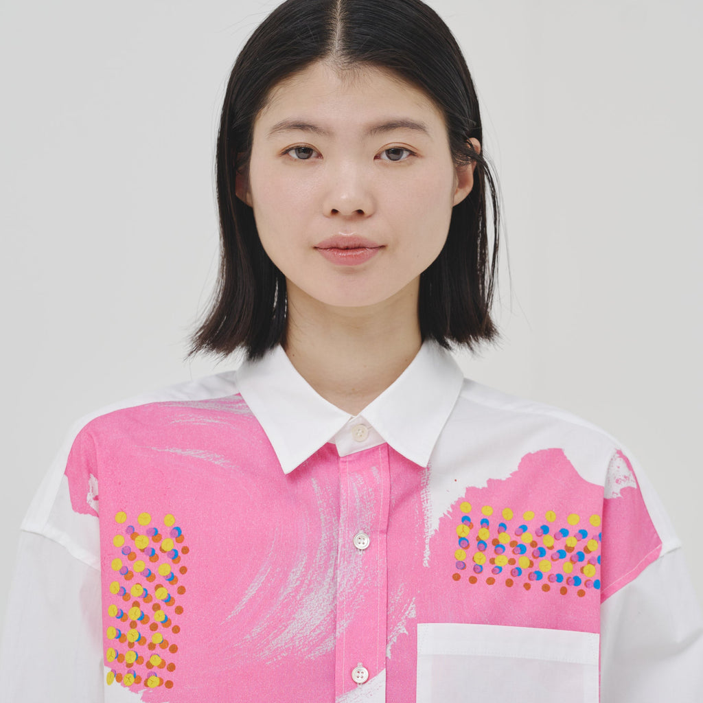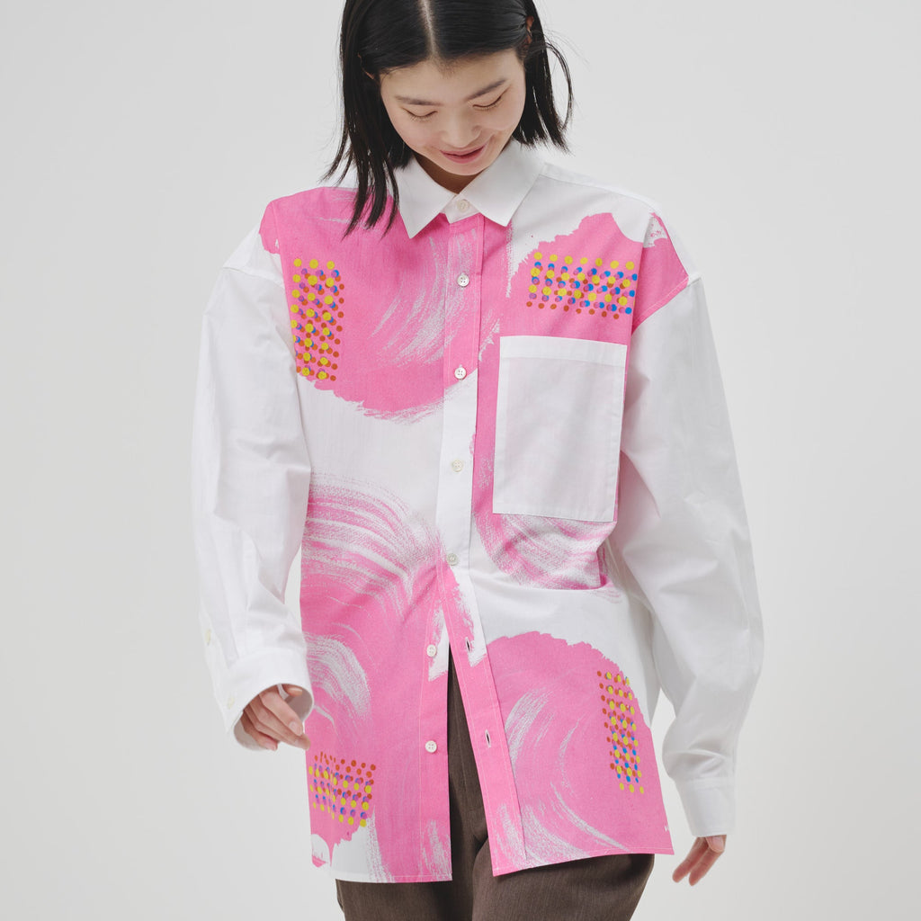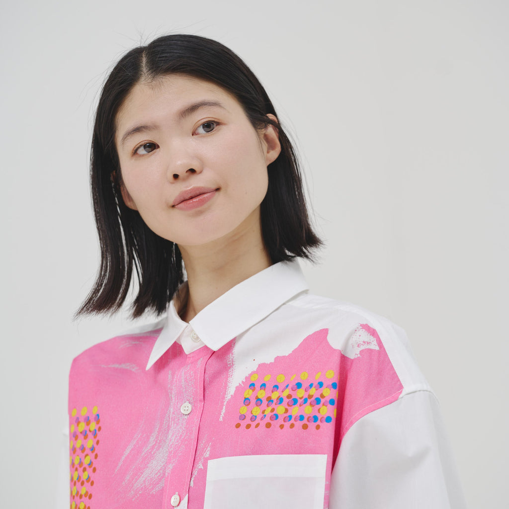 ビビッドな図形にドットが踊る、水上 詩楽(Shigaku Mizukami)のアートを起用した長袖シャツ。ビッグシルエットでジェンダーレスに着こなせます。あえて胸ポケットは白地にすることで、図形を重ねて描く彼の創作スタイルを表現しました。