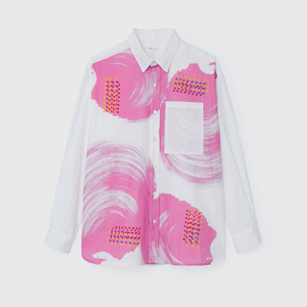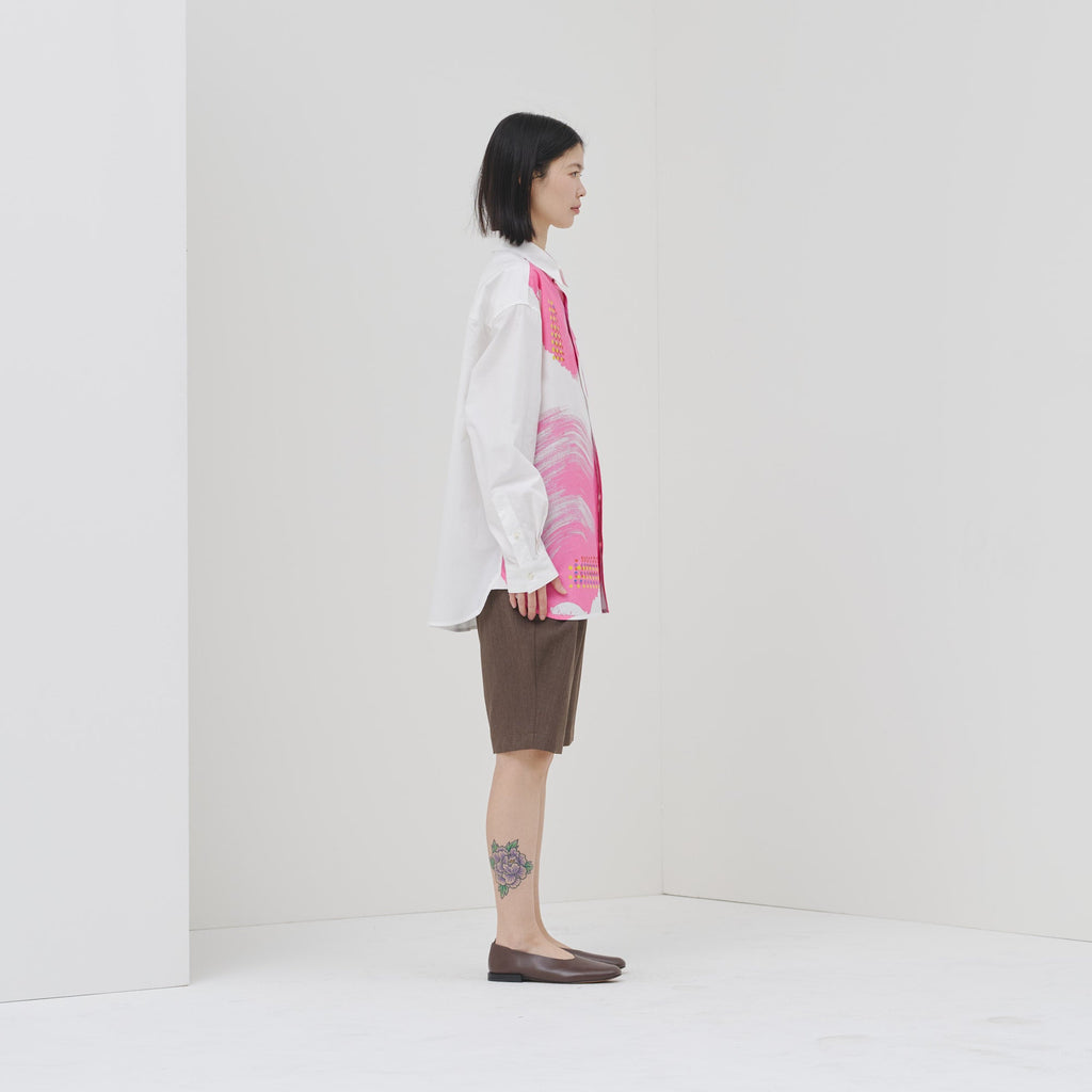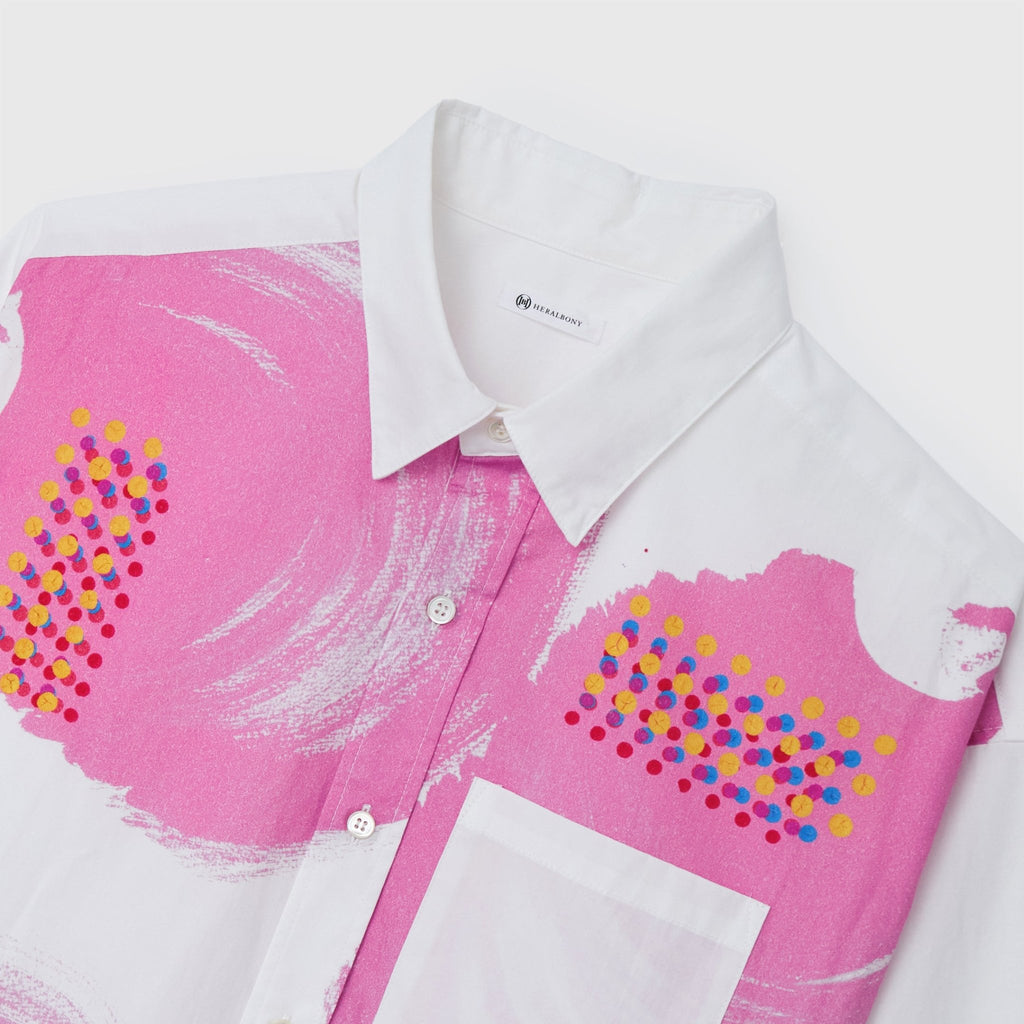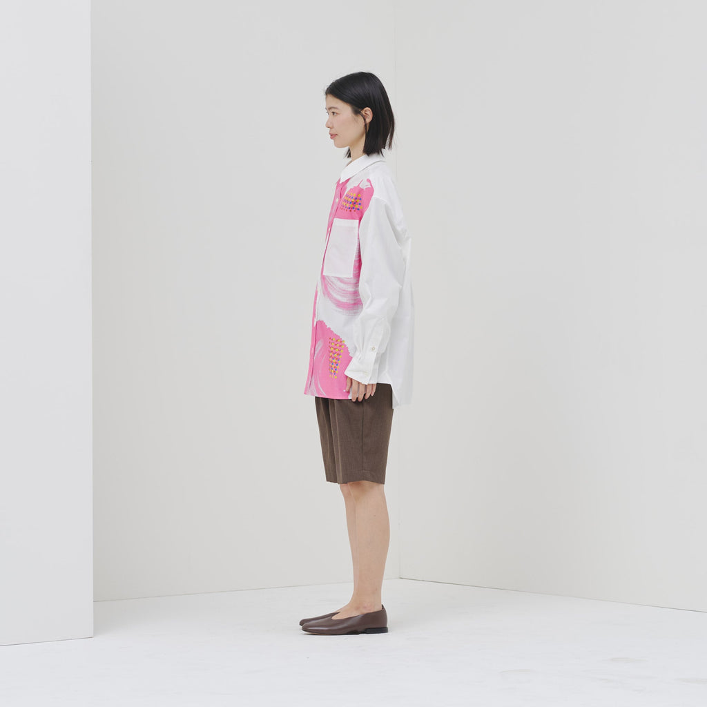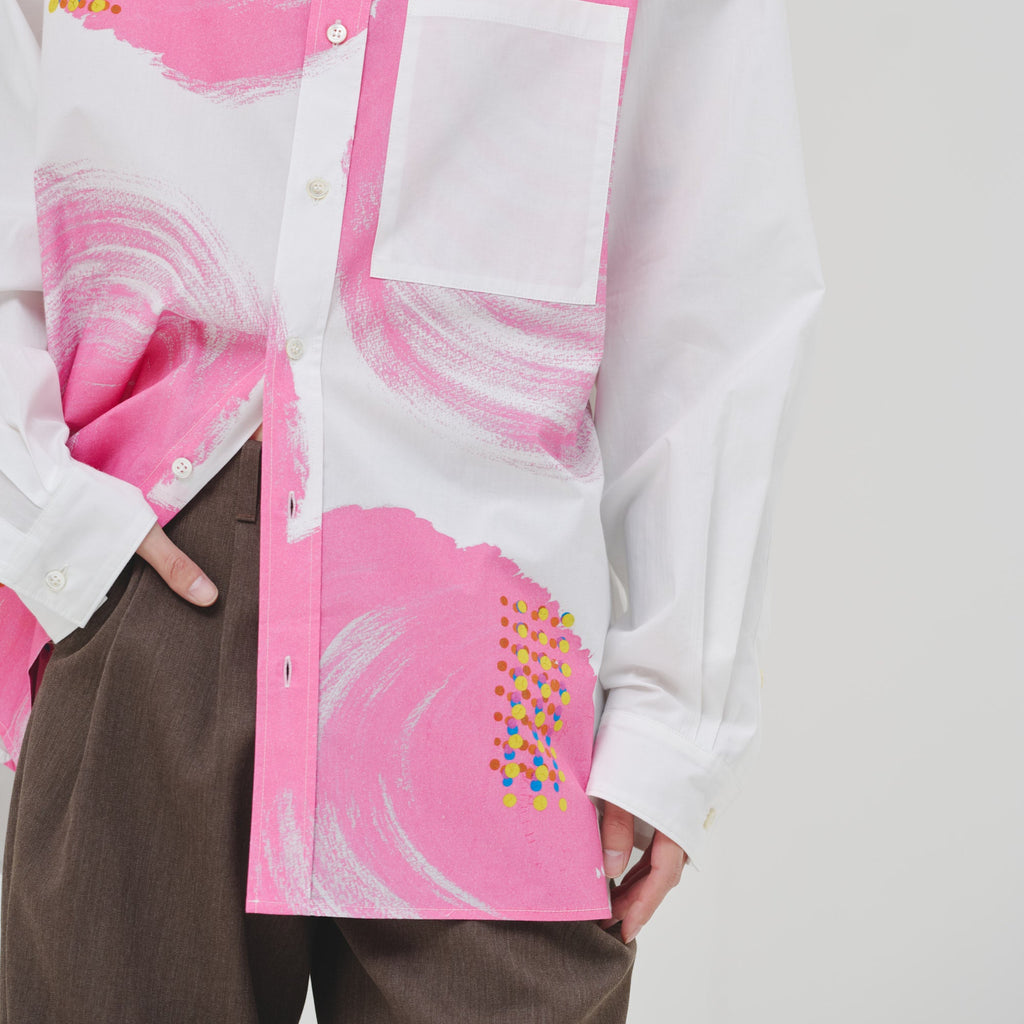 ビビッドな図形にドットが踊る、水上 詩楽(Shigaku Mizukami)のアートを起用した長袖シャツ。ビッグシルエットでジェンダーレスに着こなせます。あえて胸ポケットは白地にすることで、図形を重ねて描く彼の創作スタイルを表現しました。