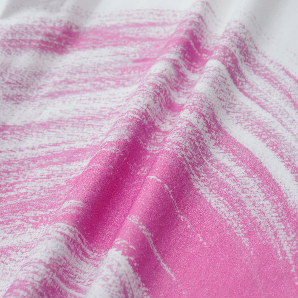 水上 詩楽の作品は、様々な色でいくつも描かれた扇形と点の模様が特徴です。規則正しく、ゆっくりと繰り返される筆の動きや「溝引き棒」という道具で打たれた点が、独特なリズムを紡ぎます。図形の組み合わせから生まれる無限の異彩を、キャンバスのように真っ白なシャツに、大胆なサイズ感で再現しています。
