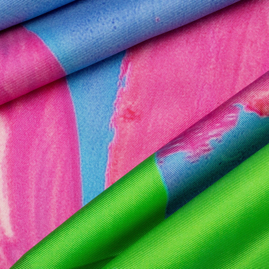 異彩作家の筆使いを忠実に再現するため、シルク素材100%にこだわりました。ずっと触っていたくなるようなハリのあるなめらかな手触りで、いつもの装いに特別な彩りを添えてくれます。