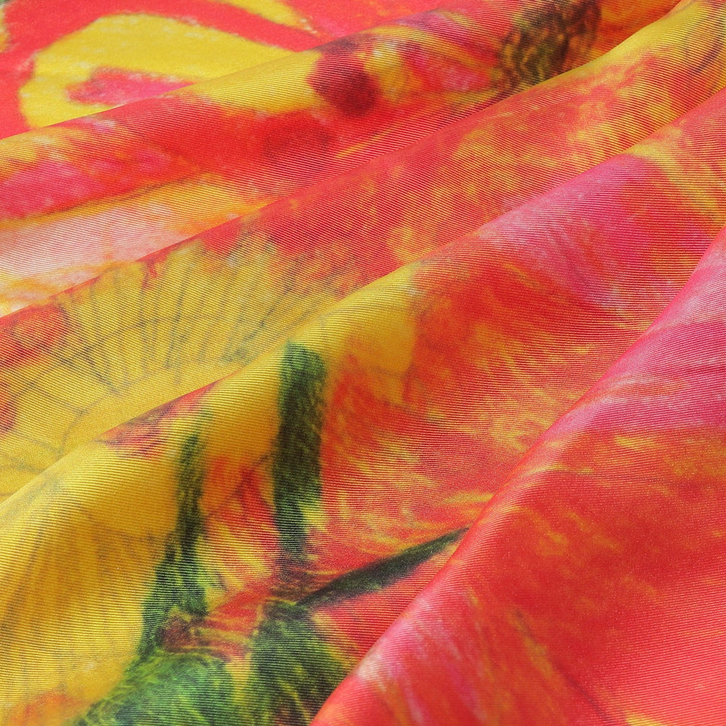 製造工程から見直しを図り、「表も裏も美しい」スカーフに仕上がりました。作品のエネルギーを失うことなく再現するため、シルク素材100%にこだわり、ハリのあるなめらかな肌触りで、首に巻いたときの心地よさも特徴です。