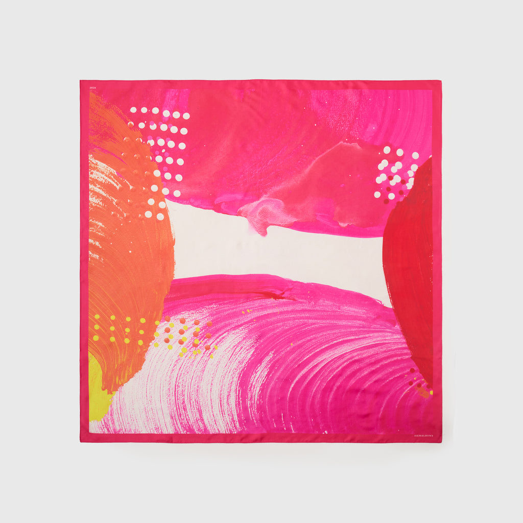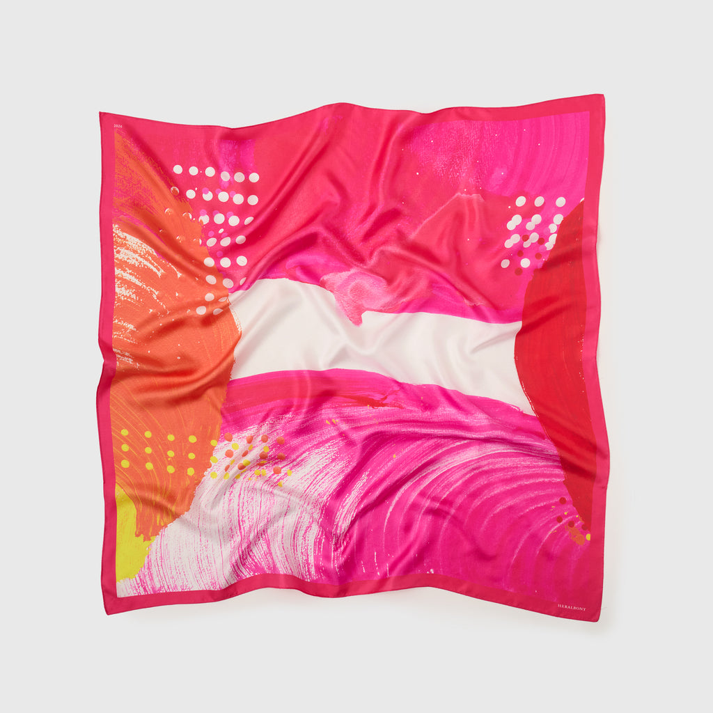 異彩作家の筆使いを忠実に再現するため、シルク素材100%にこだわりました。ずっと触っていたくなるようなハリのあるなめらかな手触りで、いつもの装いに特別な彩りを添えてくれます。