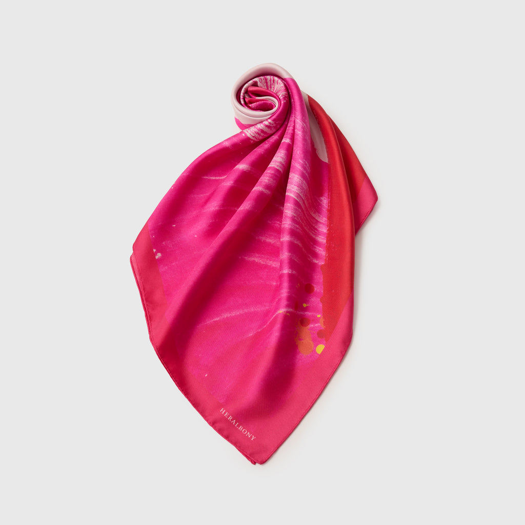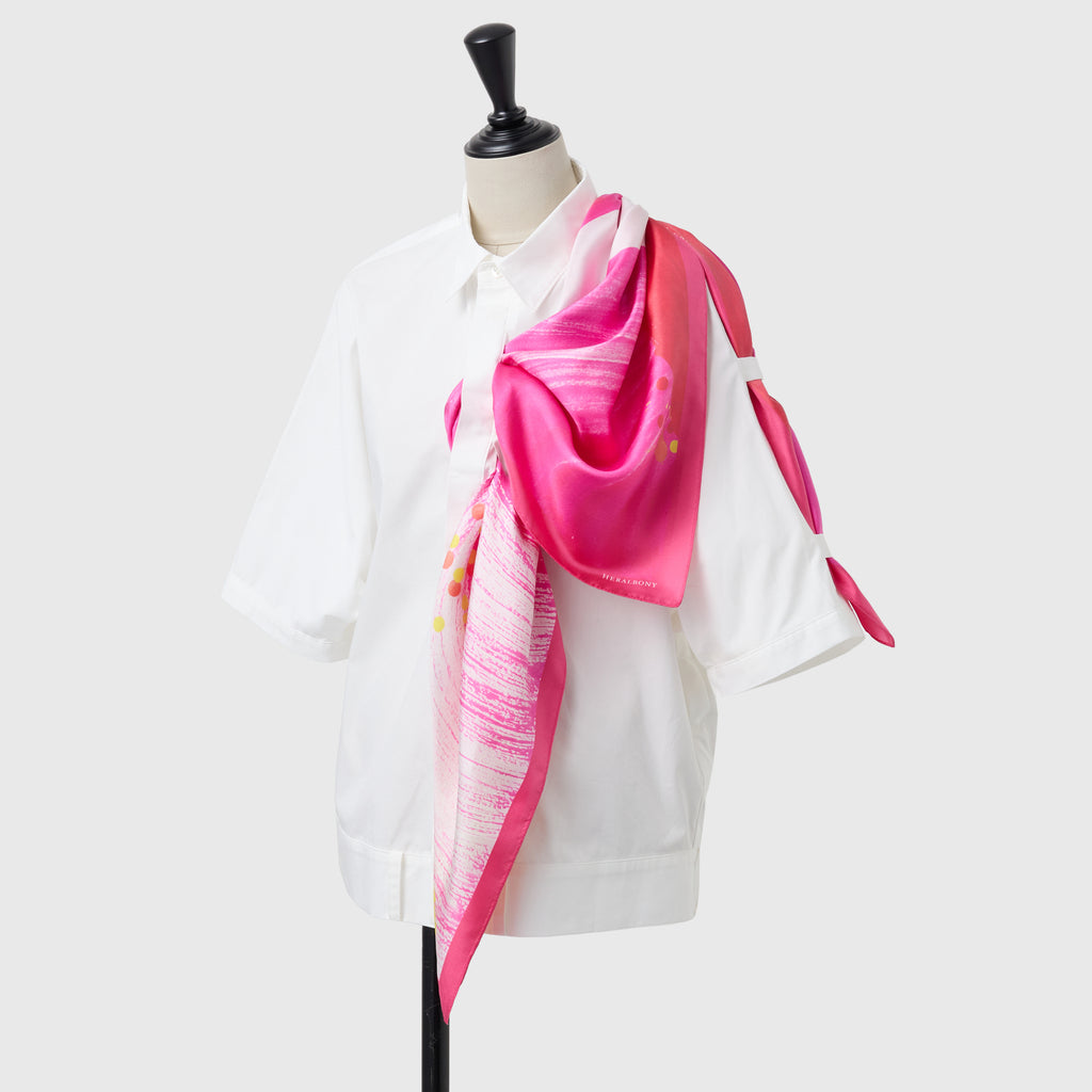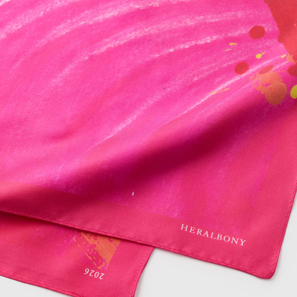 製造工程から見直しを図り、「表も裏も美しい」スカーフに仕上がりました。作品のエネルギーを失うことなく再現するため、シルク素材100%にこだわり、ハリのあるなめらかな肌触りで、首に巻いたときの心地よさも特徴です。