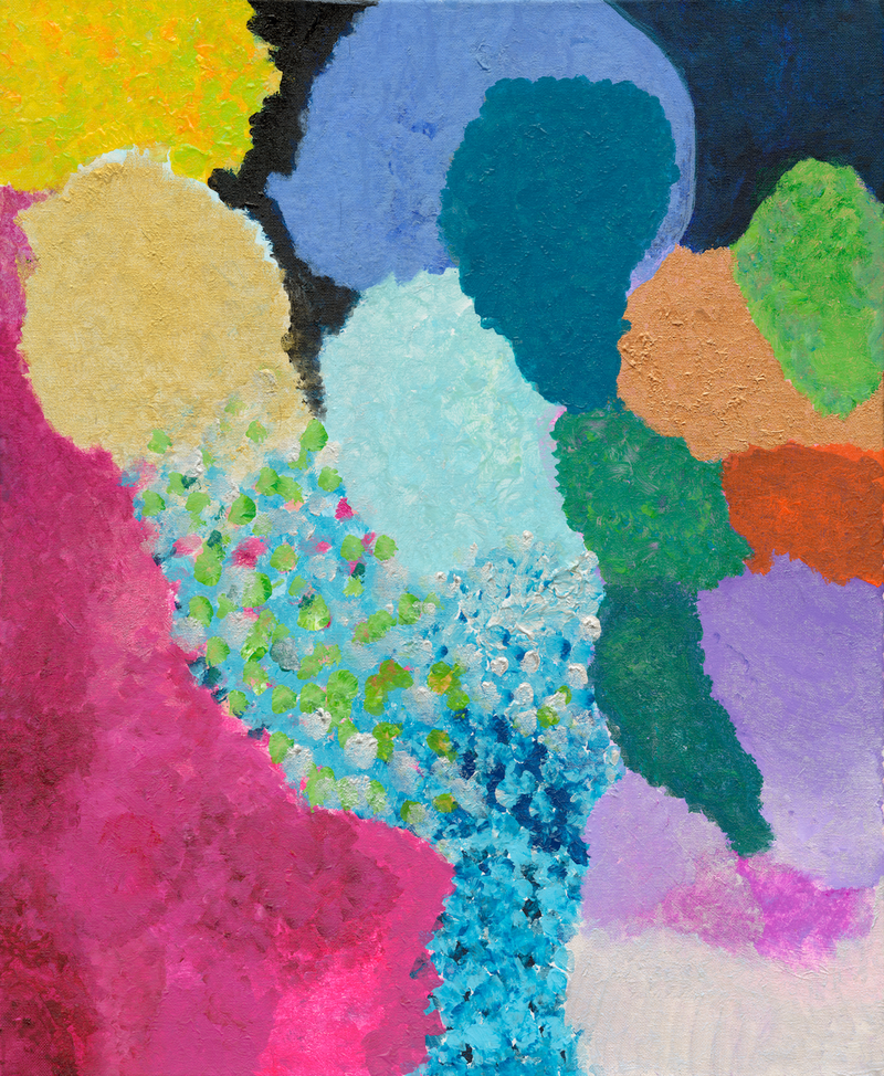 そんな彼女にとって、アクリル絵の具との出会いは幸せの始まりであった。絵を描くことが日課となり、そのカラフルで心踊る表現は、実際彼女に見えている風景であり、ほとんど言葉を発しない彼女の言葉なのである。