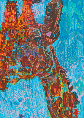 独自に生み出した楔形文字のような筆致(通称「キュニキュニ」)は、豊かな色彩とともに緻密に配され、心地よい輪郭の歪みの中に立体的な奥行きを創り出している。そのあまりの臨場感に、これらが写真のなかの平面的なモチーフを見て描かれたとはにわかに信じ難い。好きなテレビ番組のナレーションを呟きながら、普通の画用紙であれば破れてしまうほどの力強い筆圧と物凄いスピードでぐいぐいと描く。作品は国内外で評価されているが、当の本人は外界の雑音に無頓着。