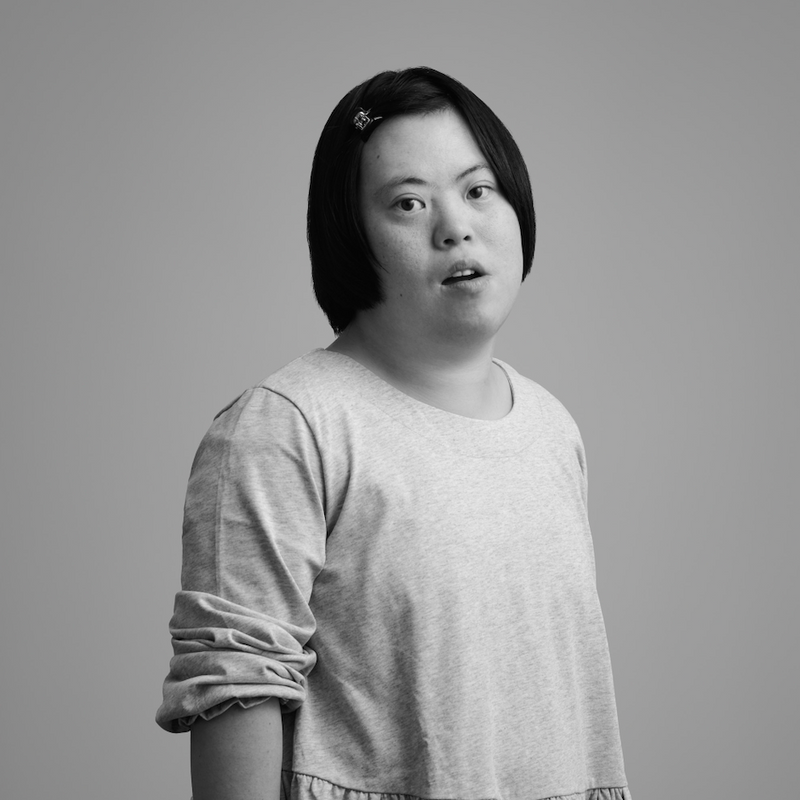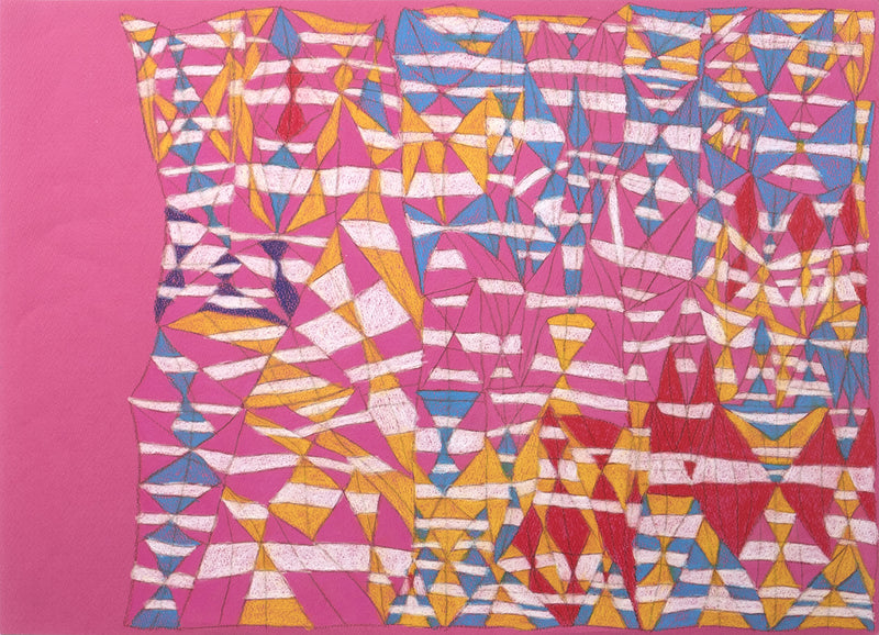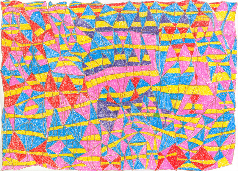 1994年生まれ 滋賀県在住 2013年から「やまなみ工房」に在籍 彼女がいつも大切に持ち歩くバッグの中には、大好きなアニメのDVDやCD、本がたくさん詰まっている。その中にある一冊のぬり絵を取り出すと、いつもの作品解説が始まる。 彼女が描く作品のほとんどは「お城」。それは、ぬり絵に描かれた女児向けアニメに登場したお城をイメージして描いているそうだ。 アニメに登場する主人公3人のキャラクターカラーであるピンク、黄色、水色は作品にも反映され3色を主に使用し、三角形や四角形を規則的に重ね合わせ色を塗り積み上げ城は築かれていく。