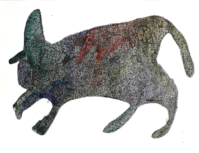 1997年から『やまなみ工房』に在籍 画集や図鑑から描くものを探し出し、構成を考えながら鉛筆で下描きをすると、その後は黒のボールペンでたくさんの点と線を使いモチーフを塗り込んでいく。その手の動きには迷いがなく、衝動的に描いている様にも見えるが、単調にならぬ様場所によって描き込みの密度に変化をつけており、緻密な点と線は重なり合い陰影を作りながら構成されていく。モチーフの中で影のように蠢く黒い点と線は平面的でありながら、今にも動き出しそうである。