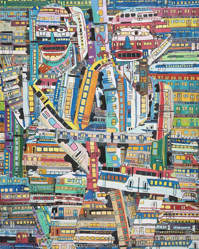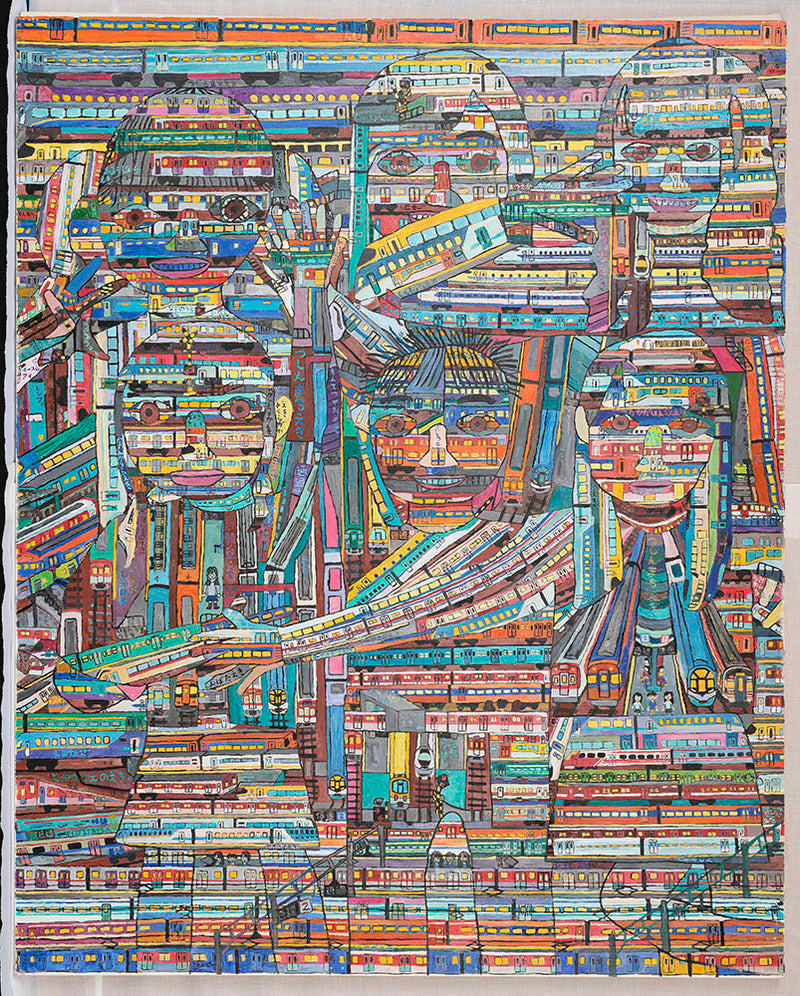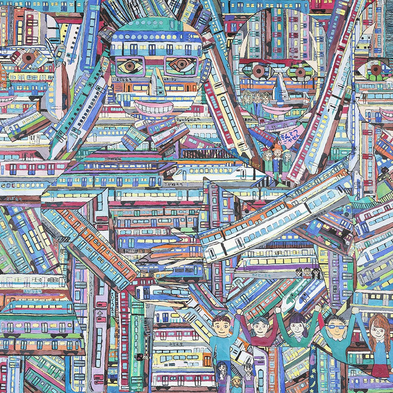 1989年生まれ。電車とアイドルを愛す。キャンバスという大地を、狂気的と言っていいほどの密度で縦横無尽に繋ぐ電車。それらは直線的で、豊かな色彩を作品にもたらす。その中には時に乗客として、時には無数の車体をも呑みこむ大きな存在として、彼の‟推し“のアイドルをはじめとする人間達の姿が描かれる。カラフルなサイリウム煌めく夢のようなライブステージと、孤独な人々が連なり、機械的に通勤先へと向かう灰色のホーム。その両方のイメージを想起させるこの世界観は、まるで現代社会の縮図である。東海地方で個展、東京やドイツ、スペイン、中国などの海外でグループ展にも参加するなど、数々の受賞歴を持つ彼の作品は、見る人を圧倒する凝縮された「好き」が詰まっている。