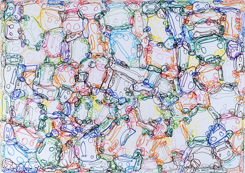 10年くらい前から創作活動を始め、一番沢山描いたモチーフは「かお」。自分や身近な人の顔で紙面いっぱい埋め尽くす。丸にしても他の形にしても、とにかくとにかく、紙いっぱいに。ゆっくりじっくり数か月かけて。もしかしたら南さんにとっては「何かの絵を描く」という事よりも、「画面を埋めていく」という行為そのものの方が価値があるのかもしれない。
