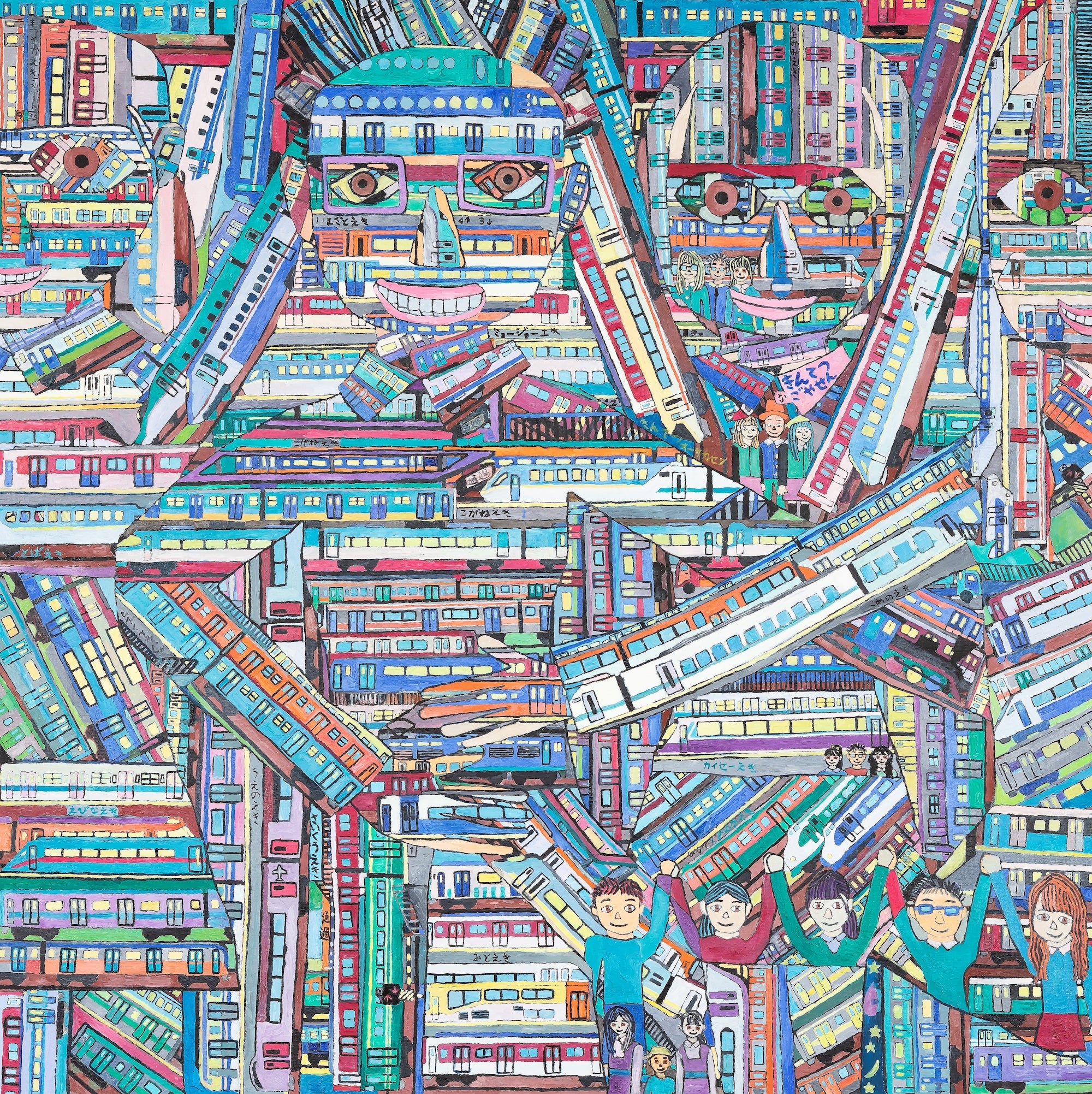 村林施設長:何か描きたいものがあると、まず輪郭を描いてですね、その中を電車で埋めていくっていう感じです。結果的にその電車でできた人物であったり、電車でできた風景ができるっていう。