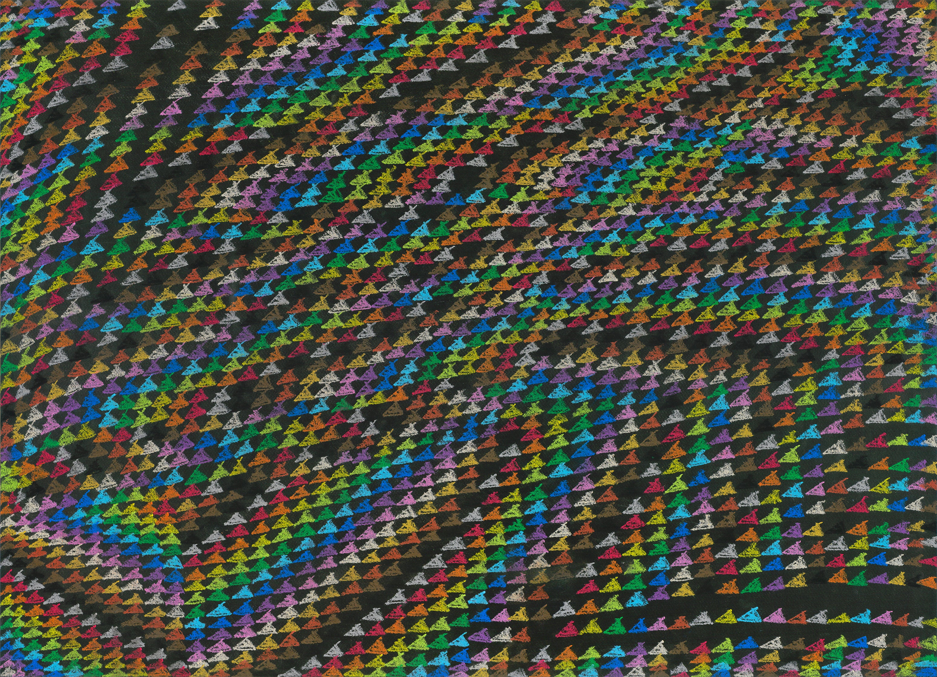 学校に行けず暇を持て余していた時期に、作家の母が「マルを描いて」と紙とペンを渡したのが創作のはじまり。マルというモチーフが彼女のなかでピタリとはまり熱中するようになる。マルを描き始めて5年になるが、近年はマル以外のモチーフも描くようになり、マル、サンカク、シカクのモチーフを大きなカンバスに日々飽きることなく描き続ける。コミュニケーションとして発する言葉はわずかだが、頭に浮かんだであろう言葉を繰り返し呟き、言葉と一緒に作品が生まれることもある。