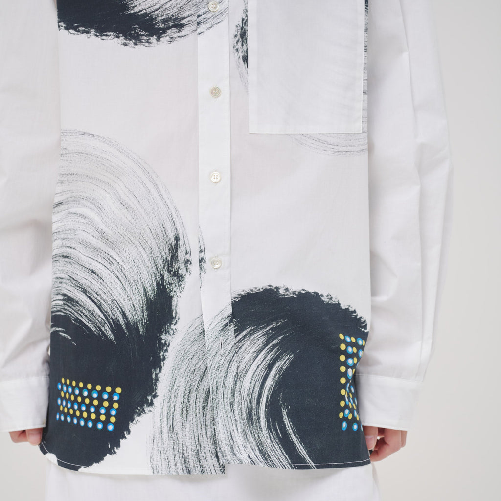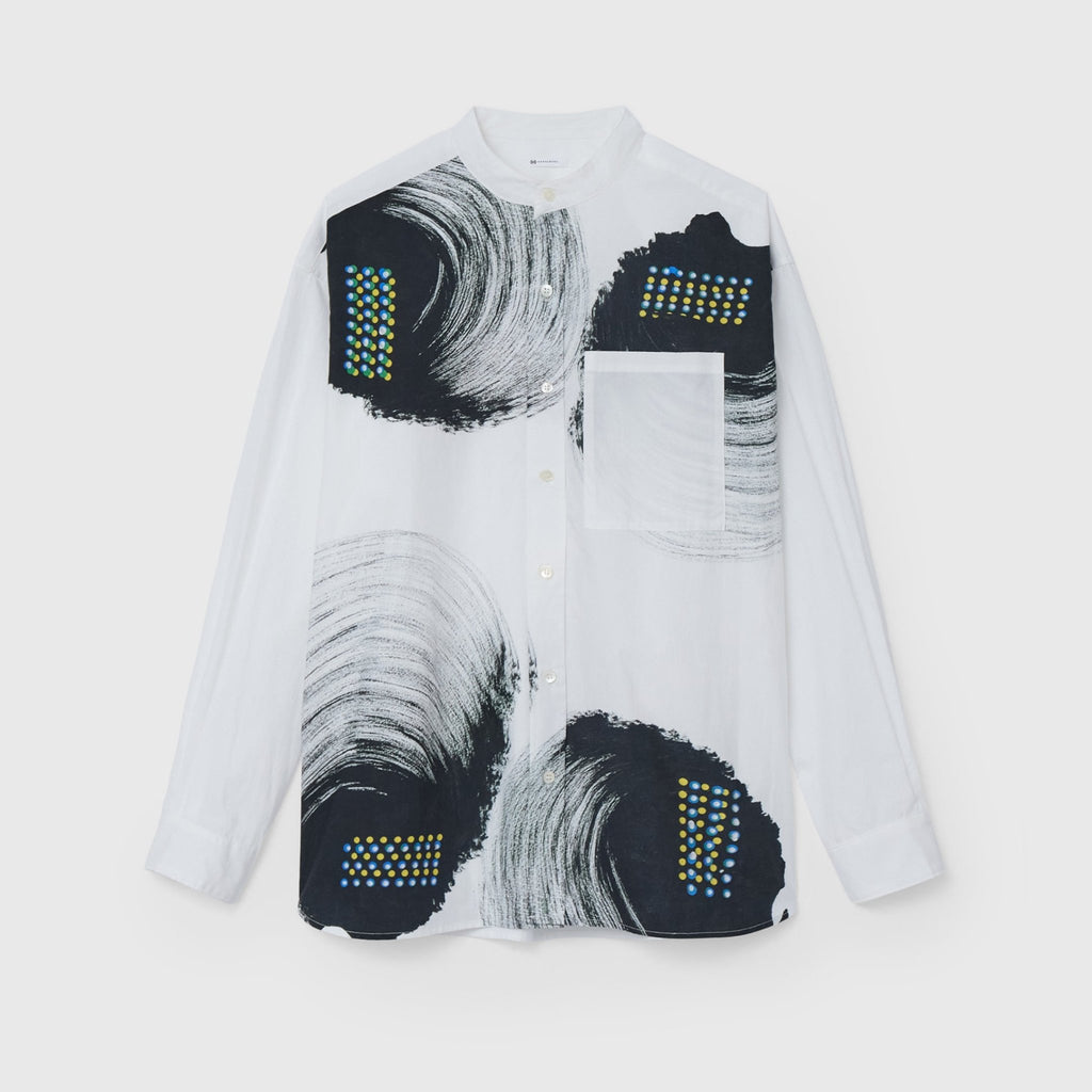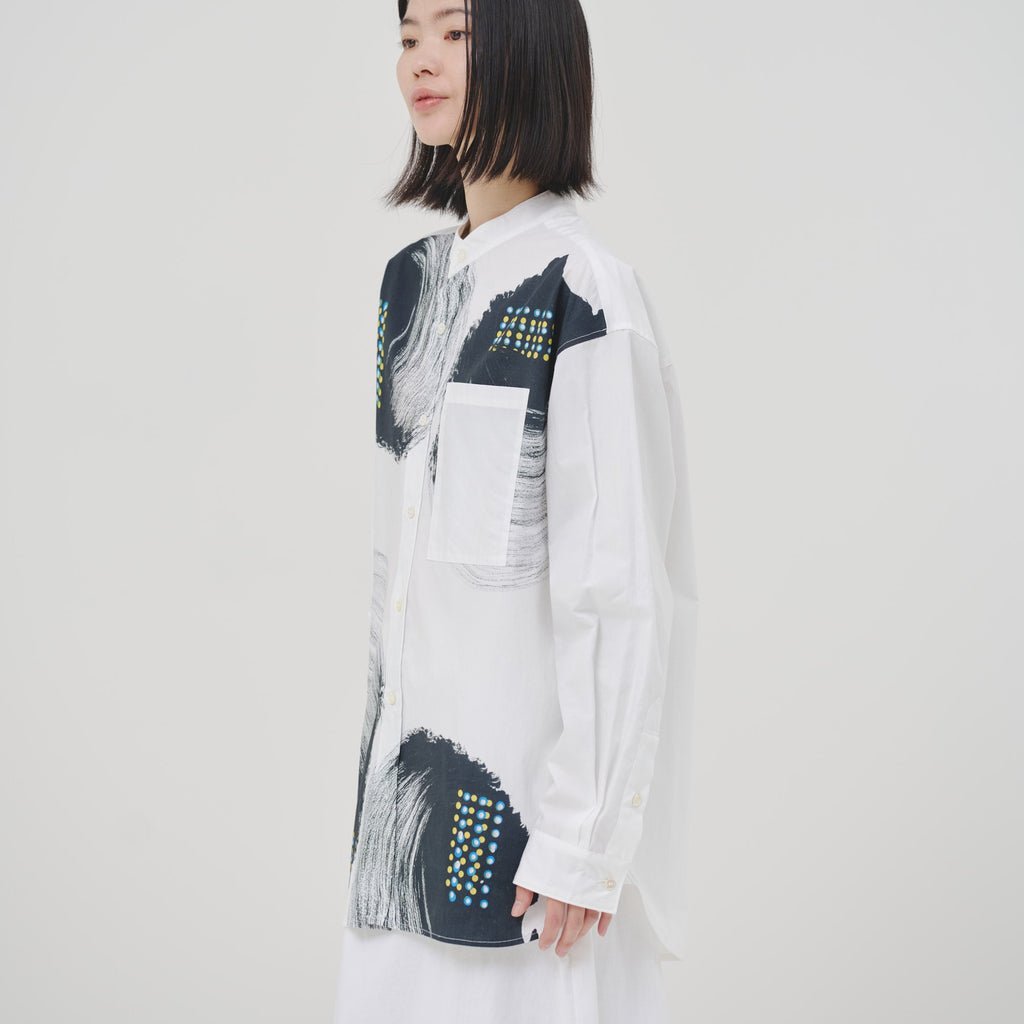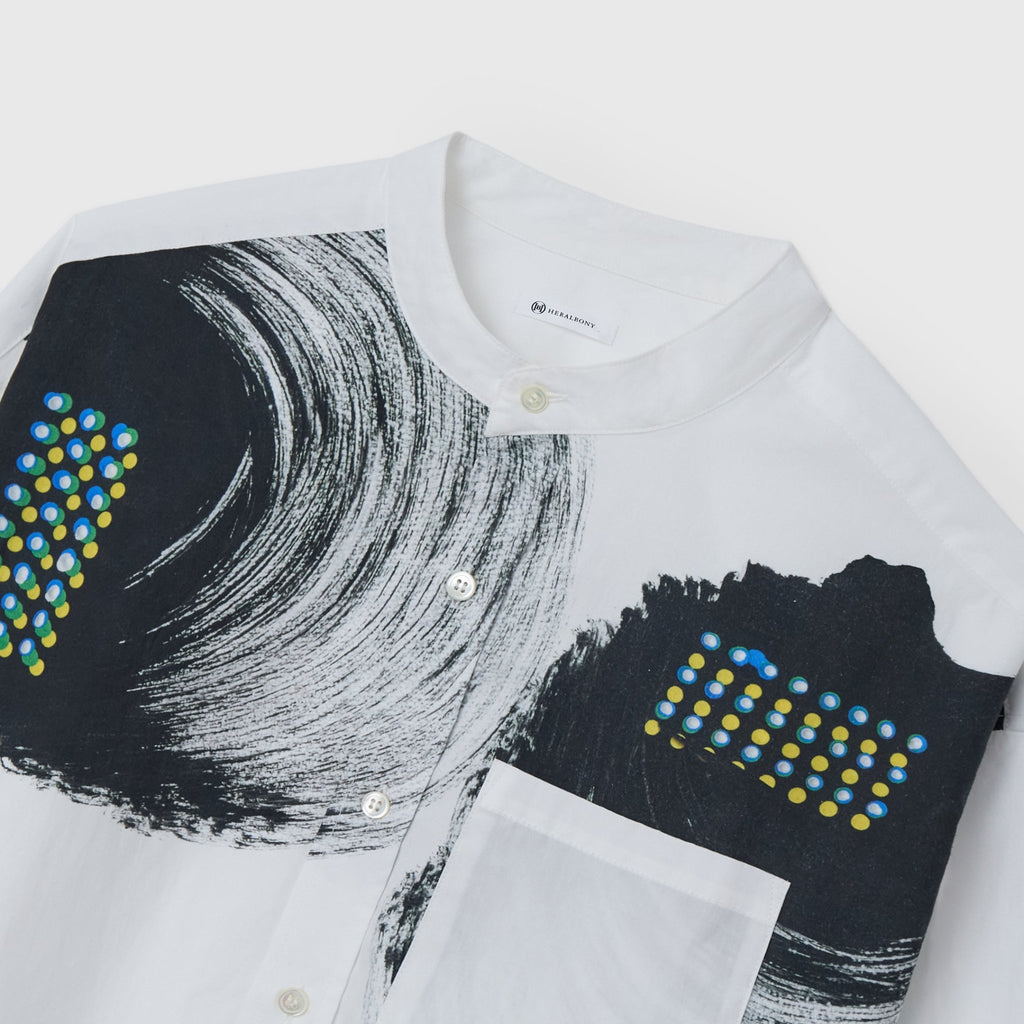 ビビッドな図形にドットが踊る、水上 詩楽(Shigaku Mizukami)のアートを起用したバンドカラーシャツ。ビッグシルエットでジェンダーレスに着こなせます。数ある作品から「黒・ピンク」を基調とした2作品を起用し、あえて胸ポケットは白地にすることで、図形を重ねて描く彼の創作スタイルを表現しました。