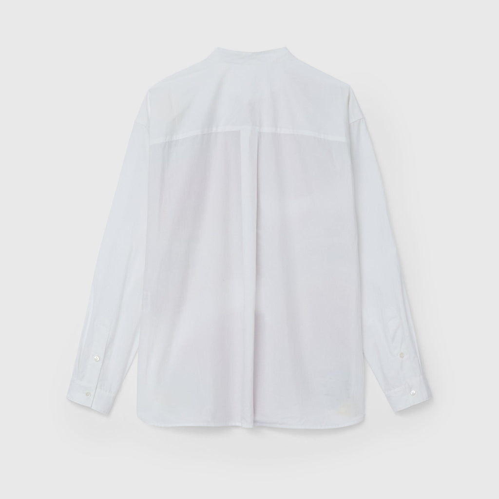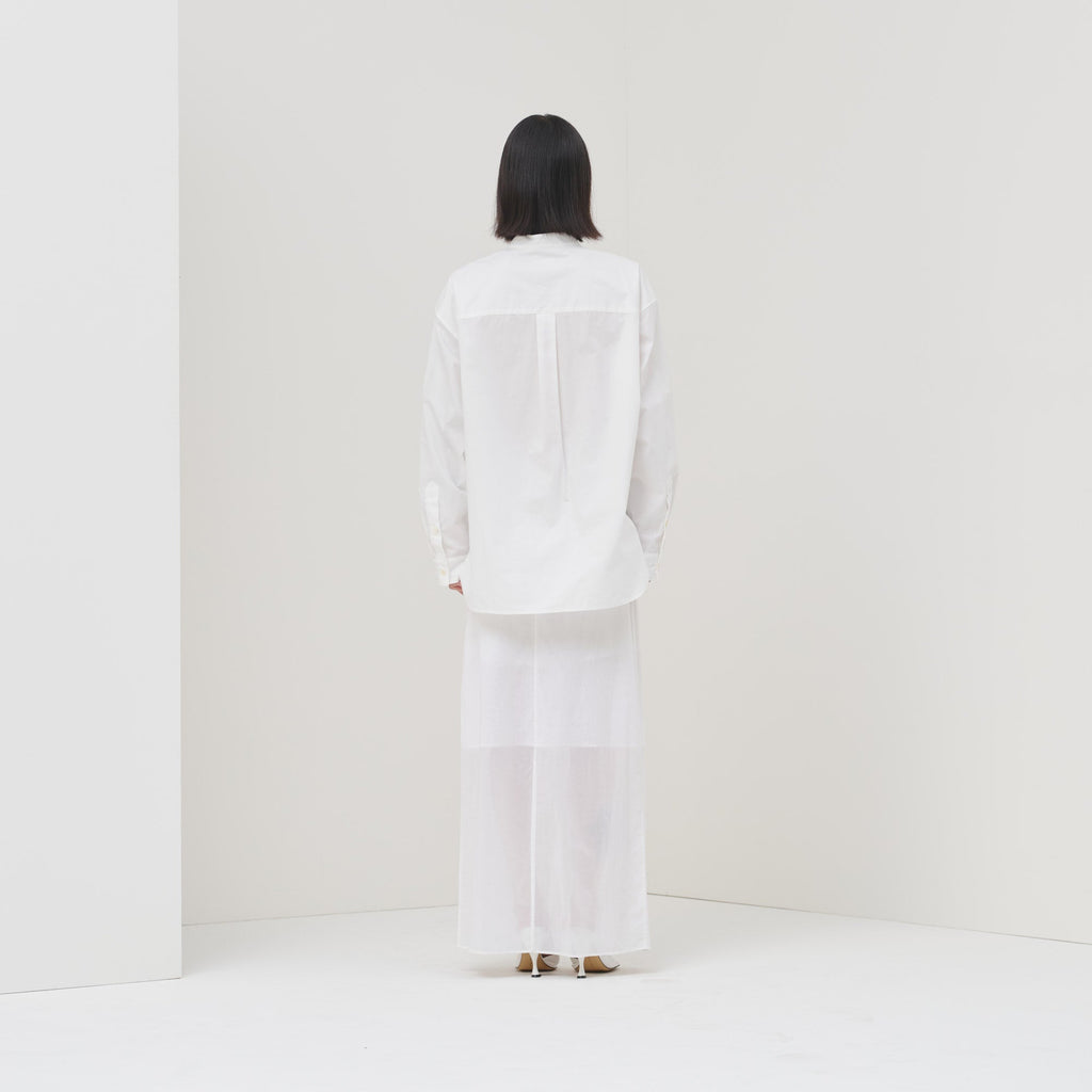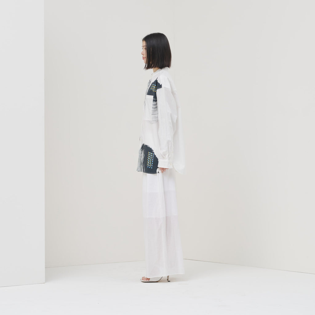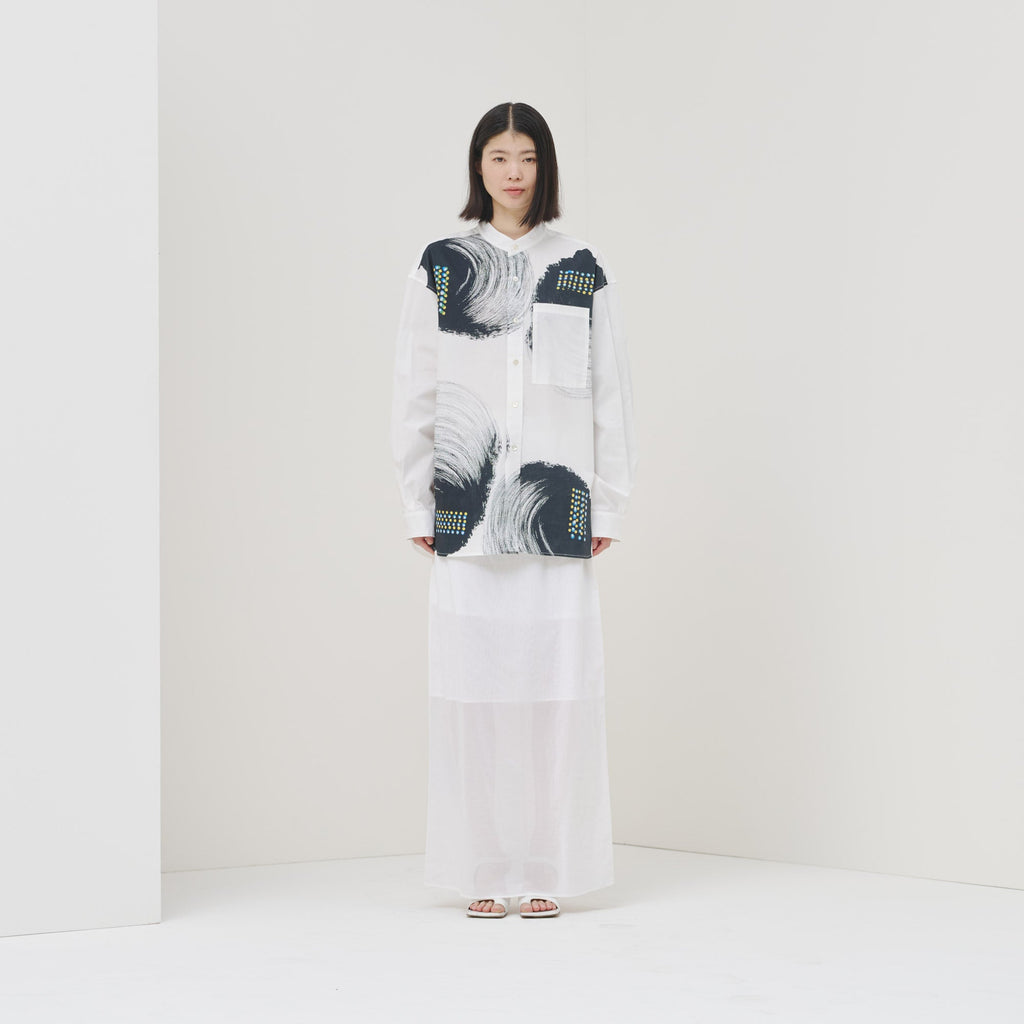 ビビッドな図形にドットが踊る、水上 詩楽(Shigaku Mizukami)のアートを起用したバンドカラーシャツ。ビッグシルエットでジェンダーレスに着こなせます。数ある作品から「黒・ピンク」を基調とした2作品を起用し、あえて胸ポケットは白地にすることで、図形を重ねて描く彼の創作スタイルを表現しました。