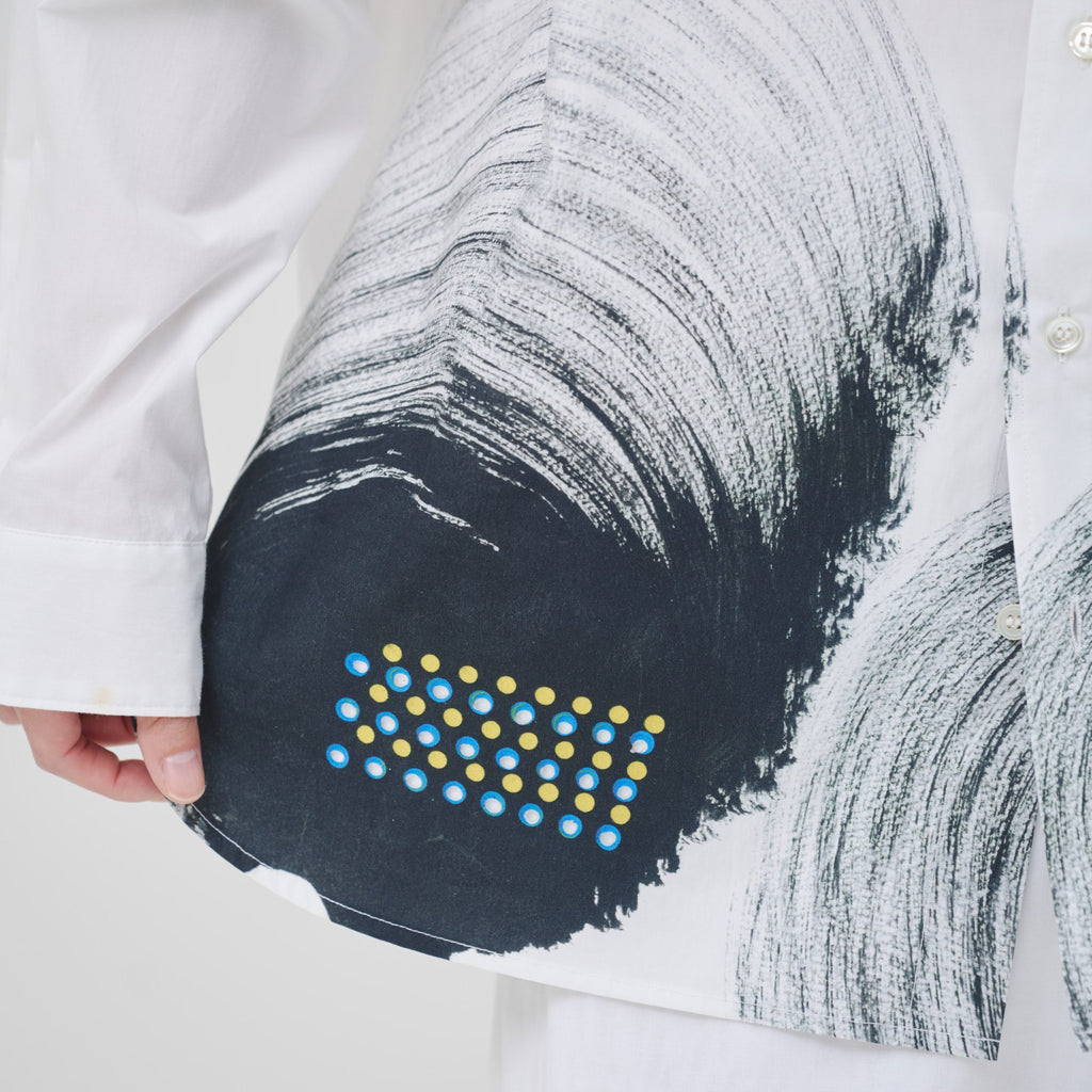 水上 詩楽の作品は、様々な色でいくつも描かれた扇形と点の模様が特徴です。規則正しく、ゆっくりと繰り返される筆の動きや「溝引き棒」という道具で打たれた点が、独特なリズムを紡ぎます。図形の組み合わせから生まれる無限の異彩を、キャンバスのように真っ白なシャツに、大胆なサイズ感で再現しています。